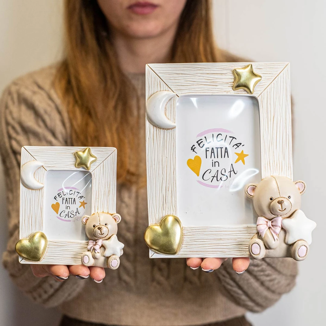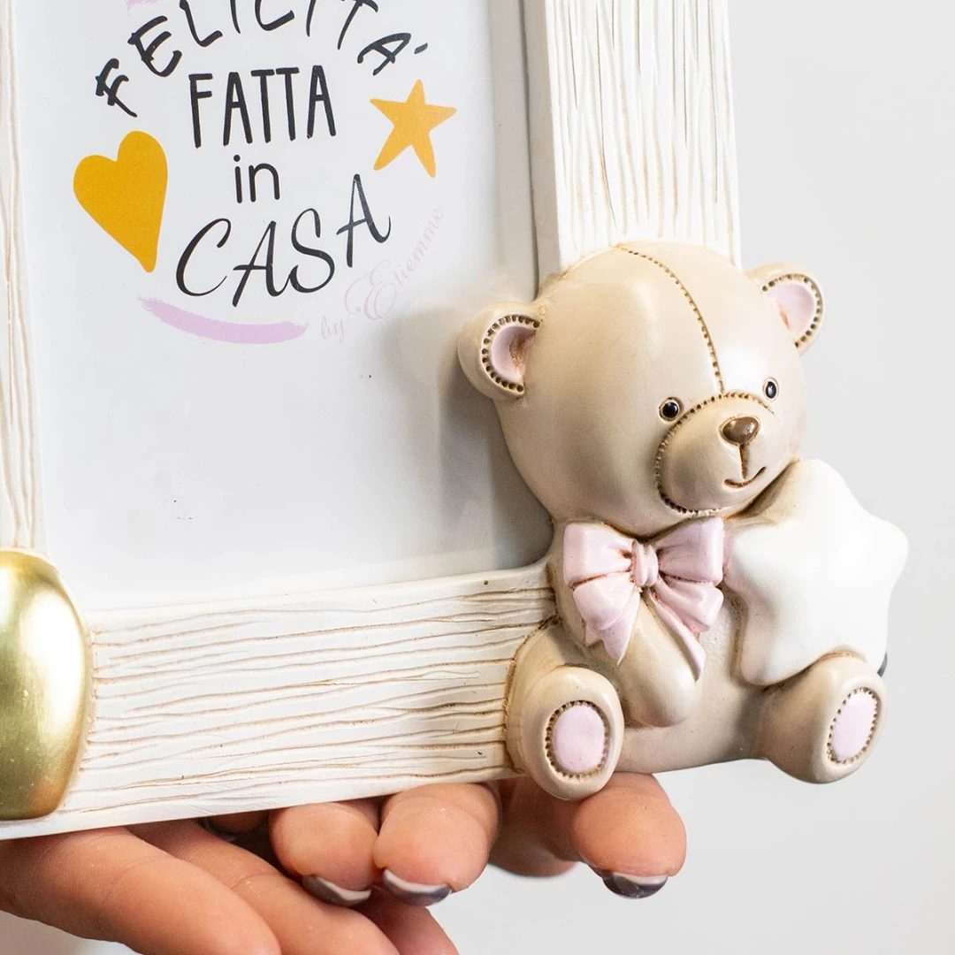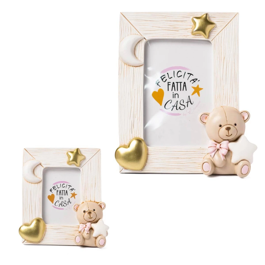 Bellissime Bomboniere Battesimo o Nascita Femmina 2026 Linea TEO Portafoto Orsetto con fiocco rosa. Due dimensioni disponibili. Arrivano assortiti con 2 pose diverse dell'orsetto. Prezzo cadauno. Prodotto Artigianale.