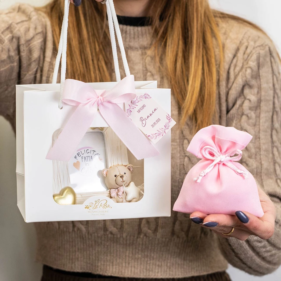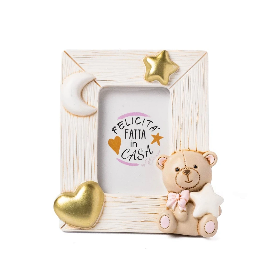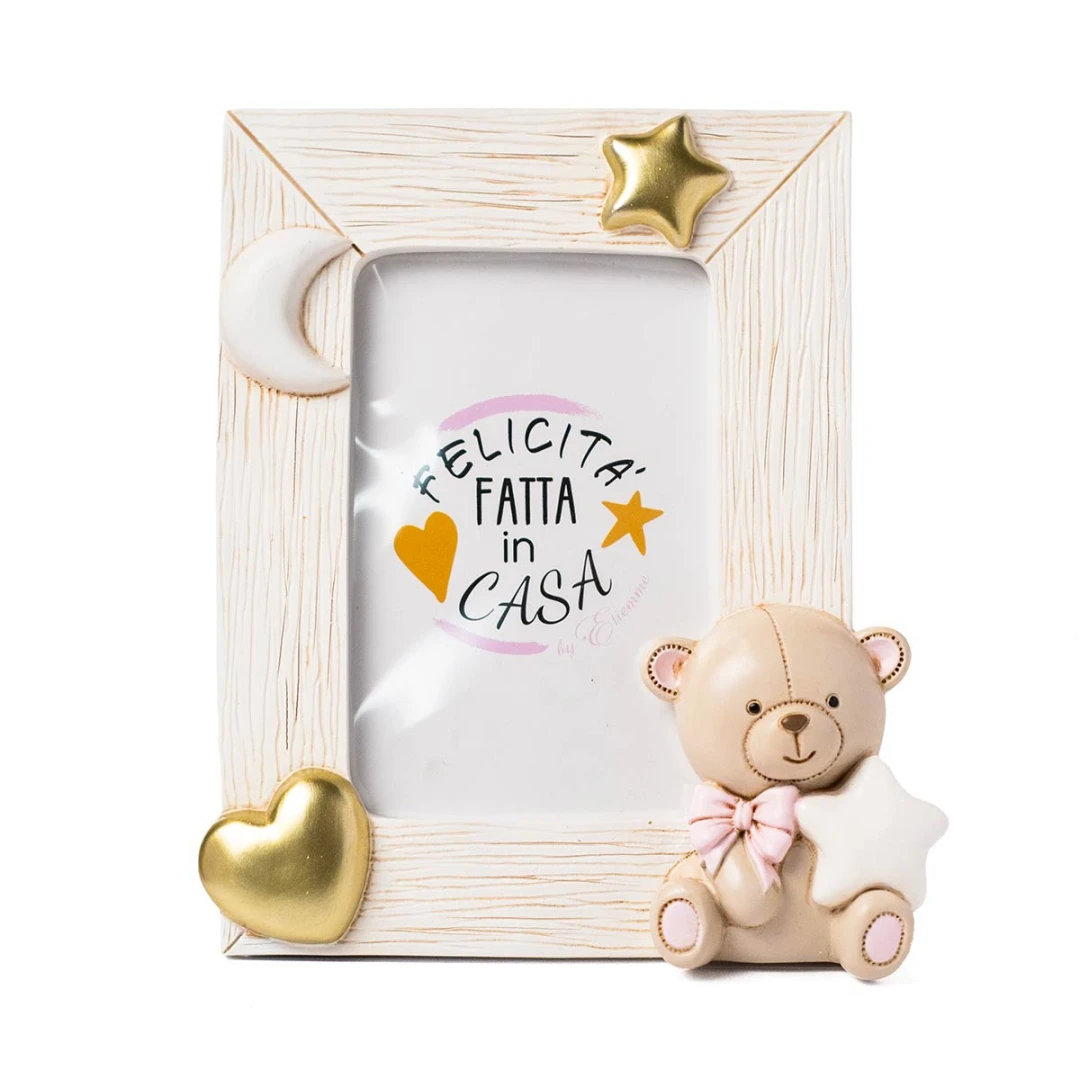 Bellissime Bomboniere Battesimo o Nascita Femmina 2026 Linea TEO Portafoto Orsetto con fiocco rosa. Due dimensioni disponibili. Arrivano assortiti con 2 pose diverse dell'orsetto. Prezzo cadauno. Prodotto Artigianale.