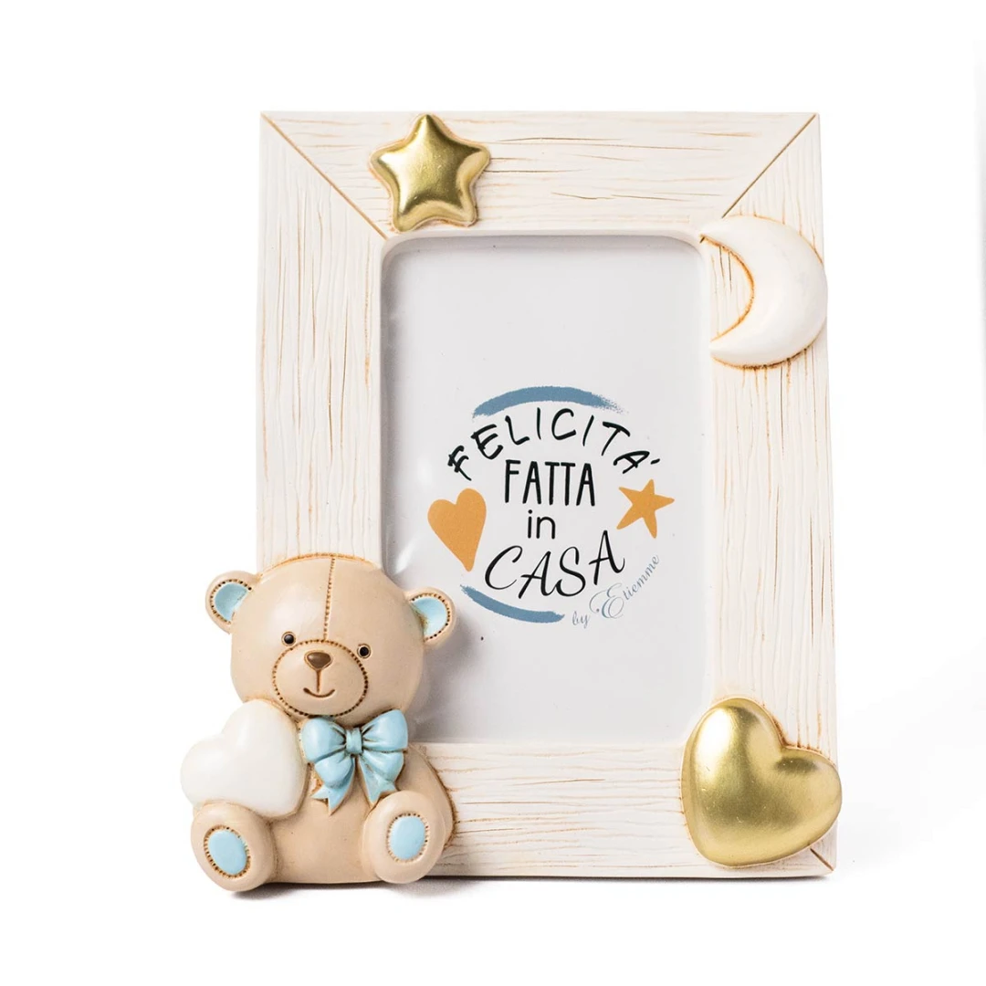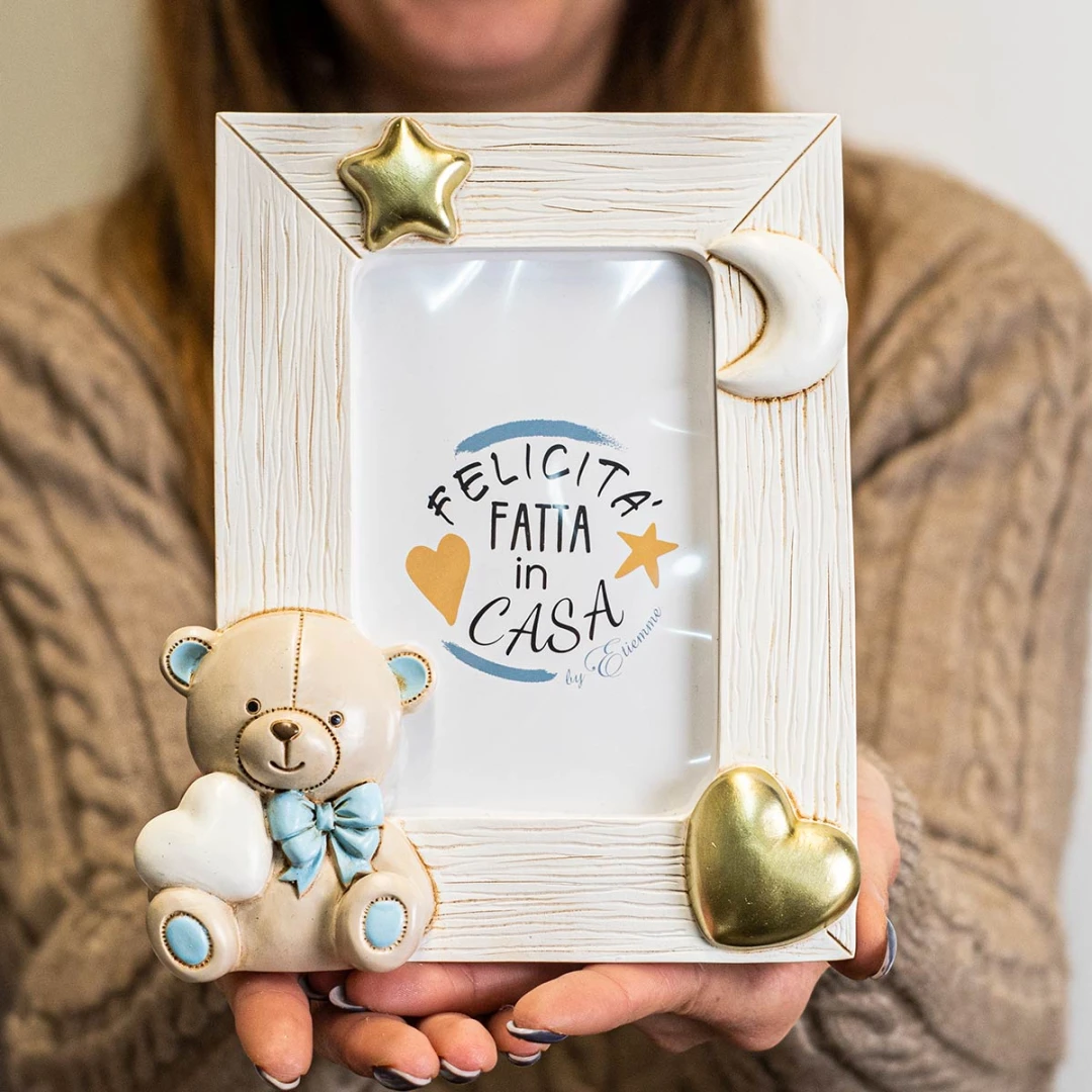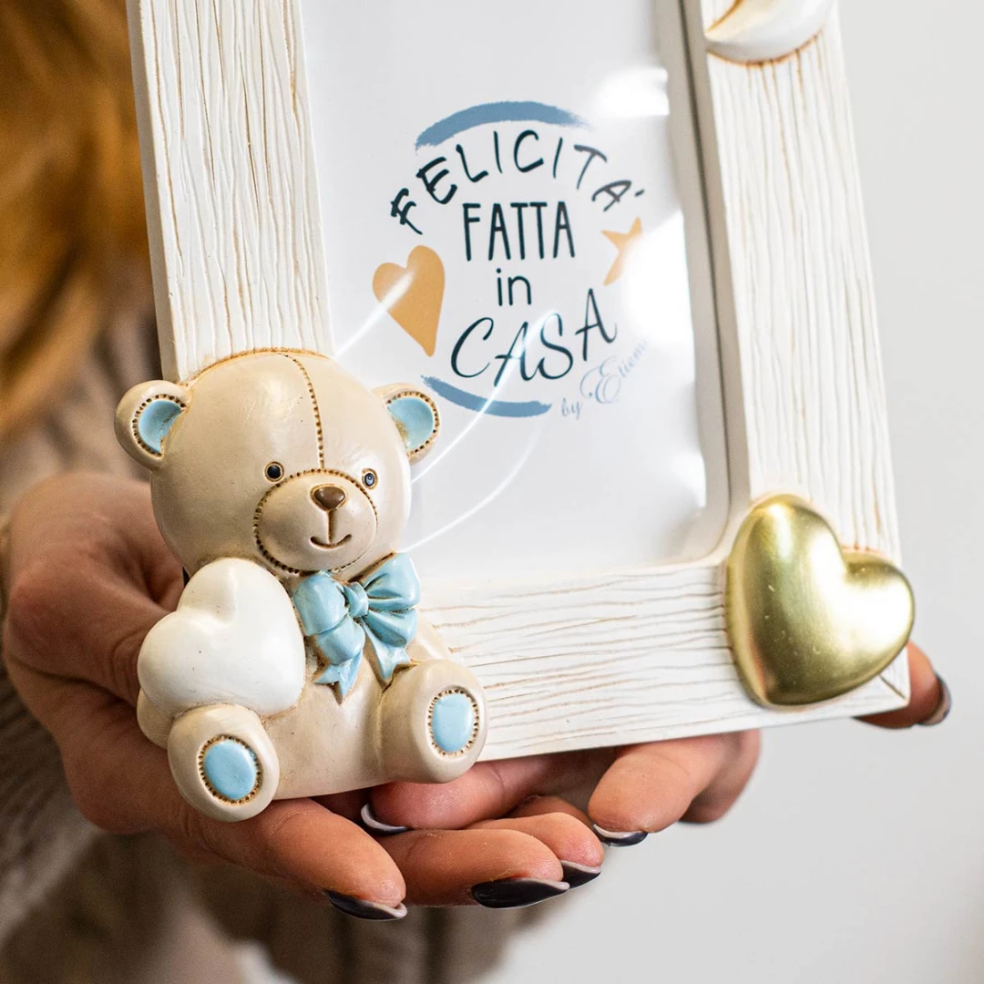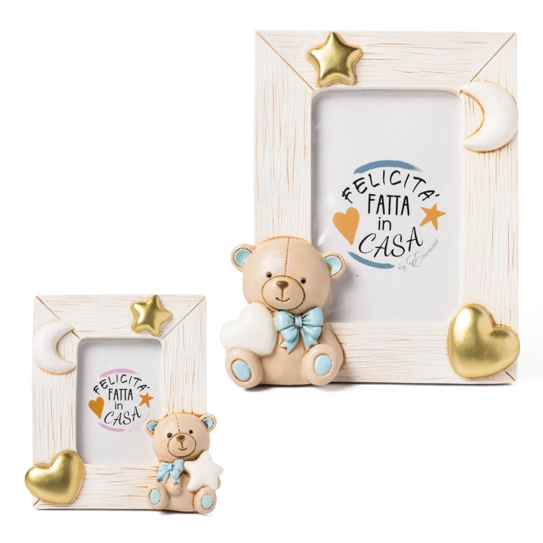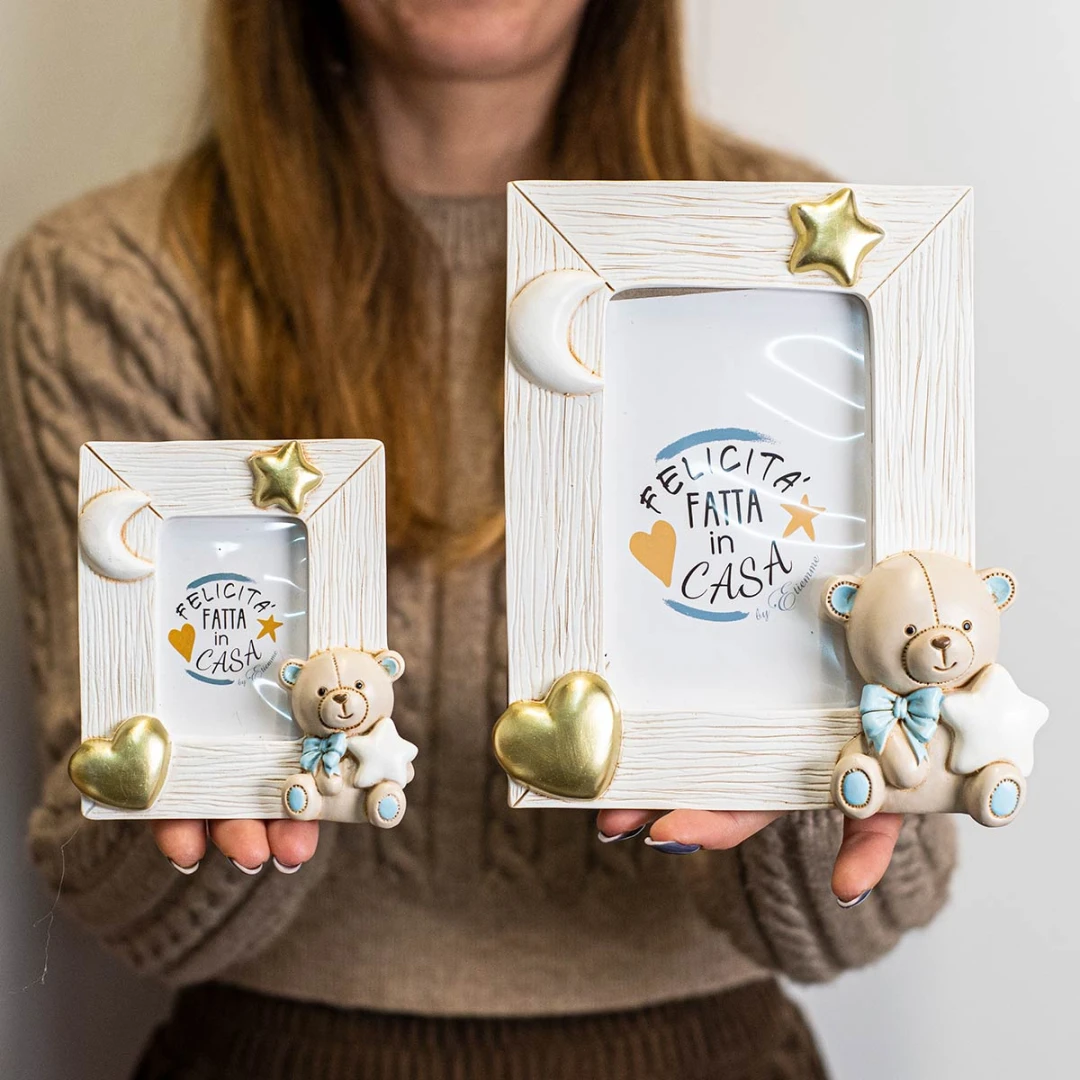 Bellissime Bomboniere Battesimo o Nascita Maschio 2026 Linea TEO Portafoto Orsetto con fiocco celeste. Due dimensioni disponibili. Arrivano assortiti con 2 pose diverse dell'orsetto. Prezzo cadauno. Prodotto Artigianale.
