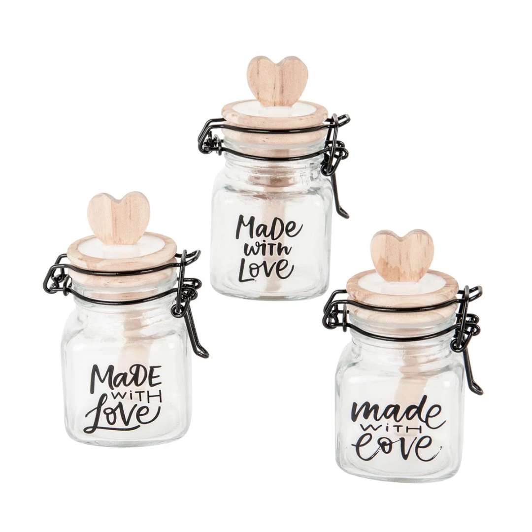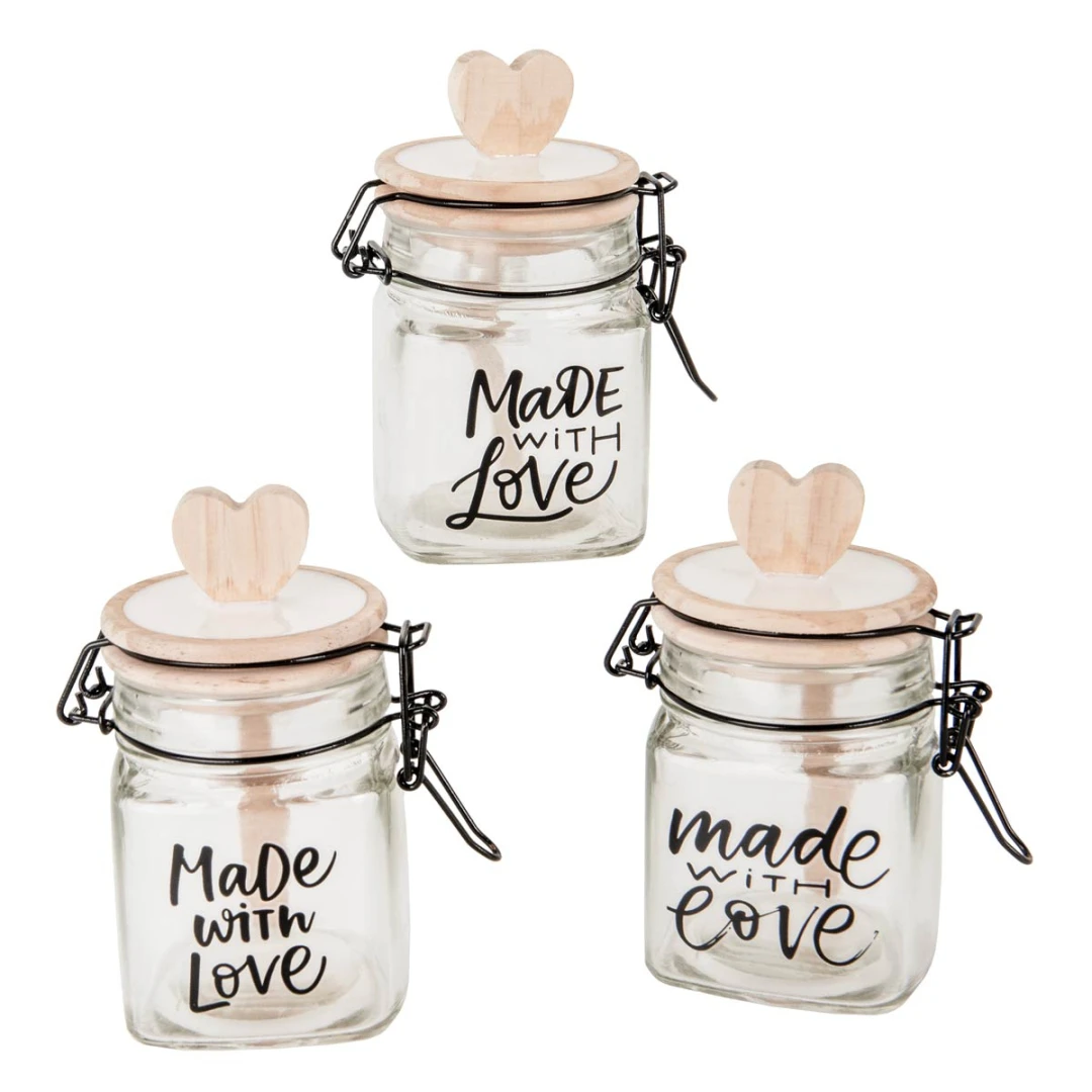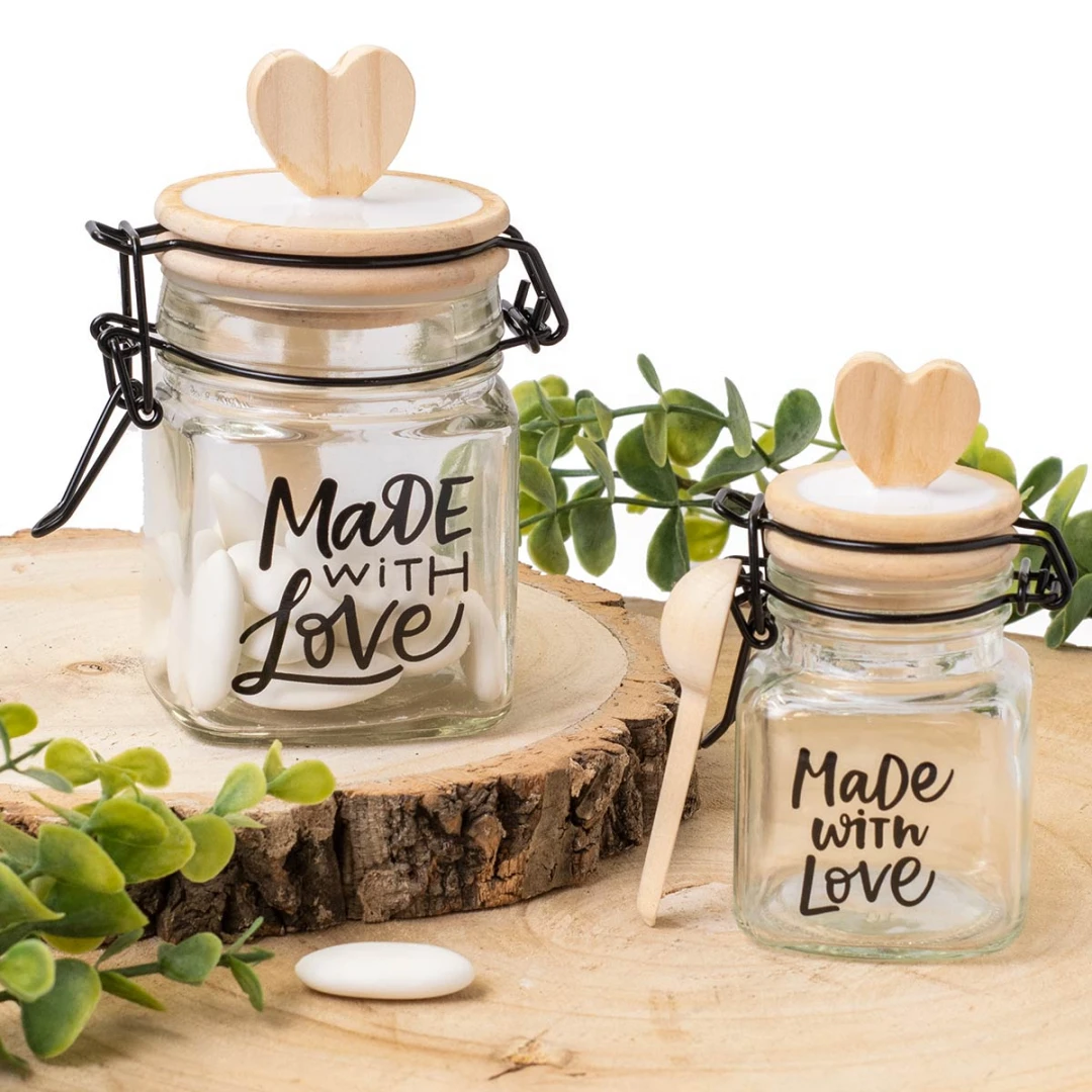 Bellissime Bomboniere 2026 Linea WITH LOVE Barattolini ermetici in vetro con tappo cuore in legno "With Love". Disponibili due dimensioni. Prezzo cadauno. Prodotto Artigianale.