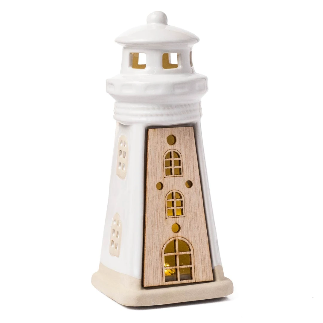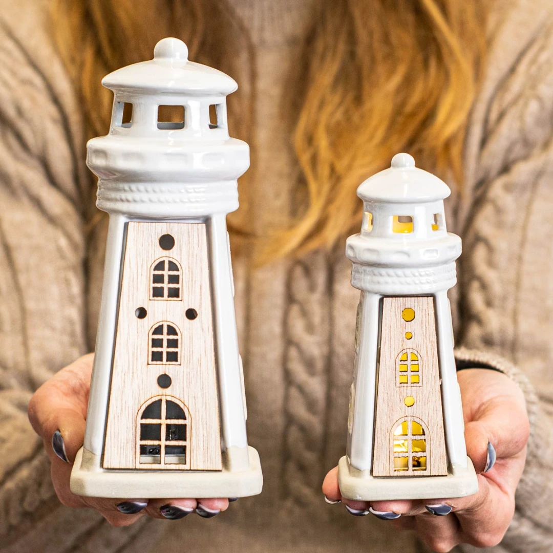 Bellissime Bomboniere Tema Mare 2026 Linea WOOD FARO Faro in porcellana con dettagli in legno a LED. Diverse dimensioni disponibili. Prezzo cadauno. Prodotto Artigianale. (ESCLUSE PILE)