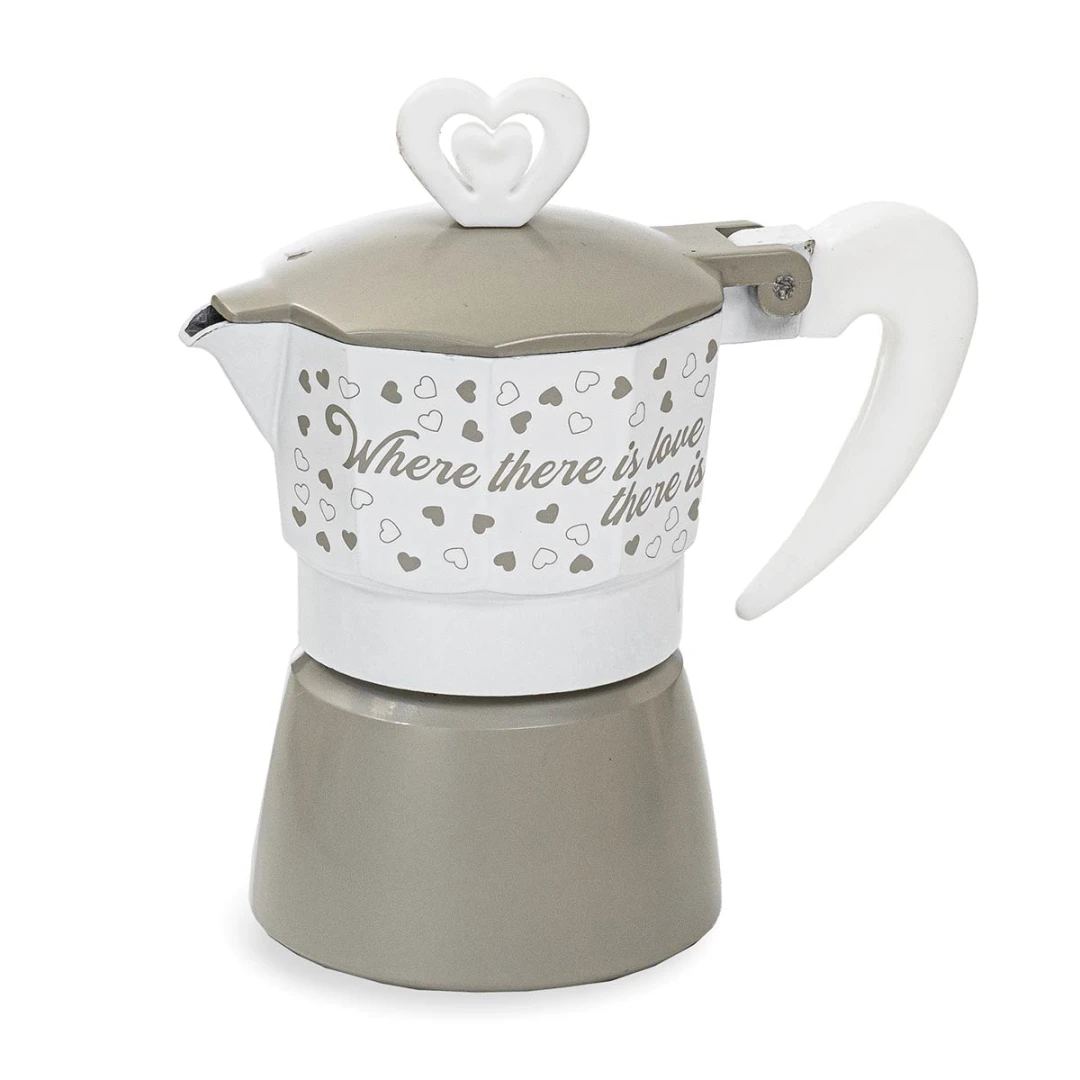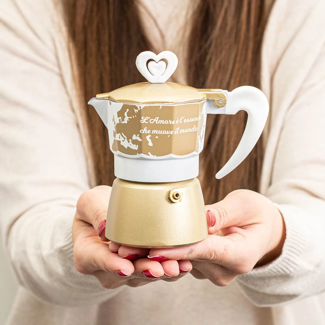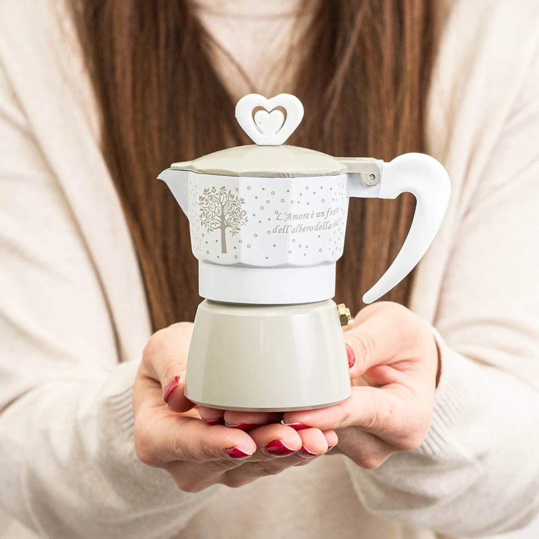 Bellissime Bomboniere Matrimonio 2026, Moke caffettiere con pomello cuore, in metallo, disponibili in 3 fantasie differenti (di cui una color oro). Prezzo cadauno. Prodotto Artigianale.