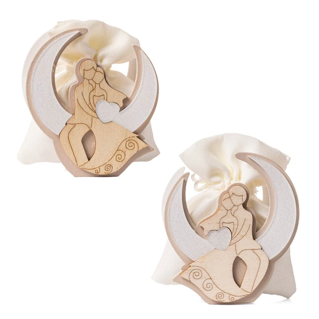 Bomboniere Matrimonio 2026, Linea Cheri, Scatolina portaconfetti in legno con coppia innamorata su luna glitterata (arriva assortito in 2 modelli), inoltre all'interno presenta un sacchettino bianco. Il prezzo si riferisce ad 1 scatolina. Prodotto Artigianale. Misura:8 x 7,5 x 3 cm.