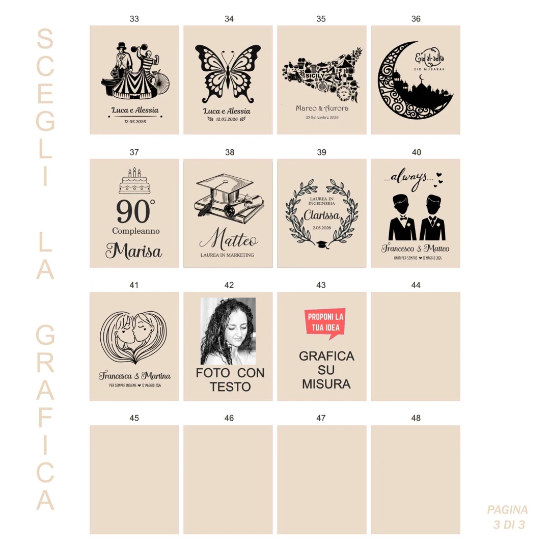 dopo l'ordine invia una mail a info@bombonierelarosa.it con la foto, il logo, o richiedi una grafica su misura, verrai contattata dal grafico e riceverai le bozze prima della produzione