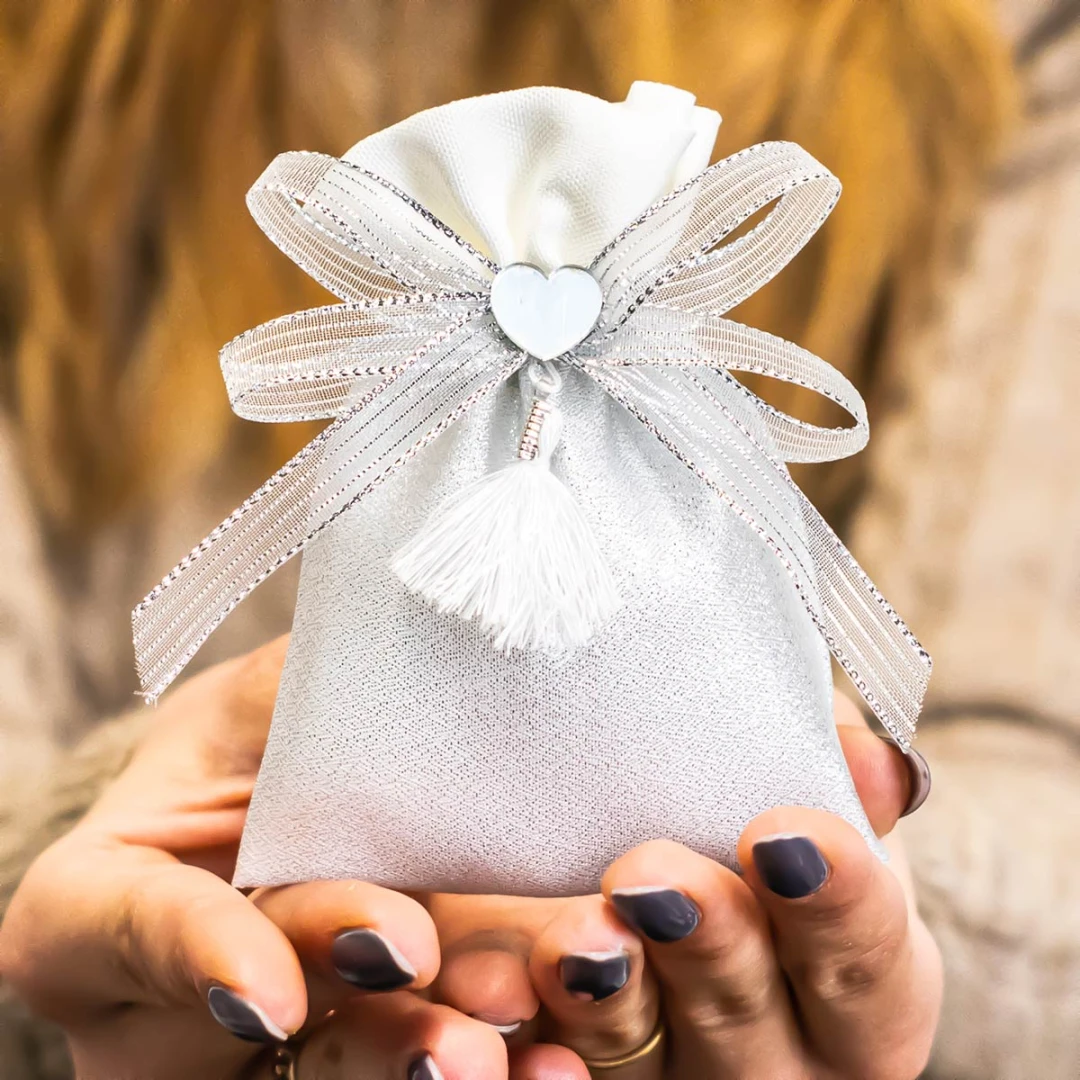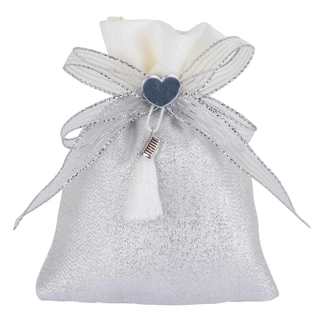 Bomboniere 2026 Nozze d'Argento Linea LIFE Sacchettini Portaconfetti argentati con nappina e cuore argentato. Il prezzo si riferisce ad 1 sacchetto. Prodotto Artigianale. Misura: 9 x 12 cm.