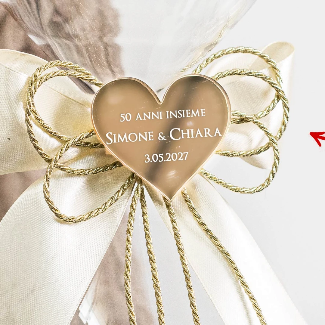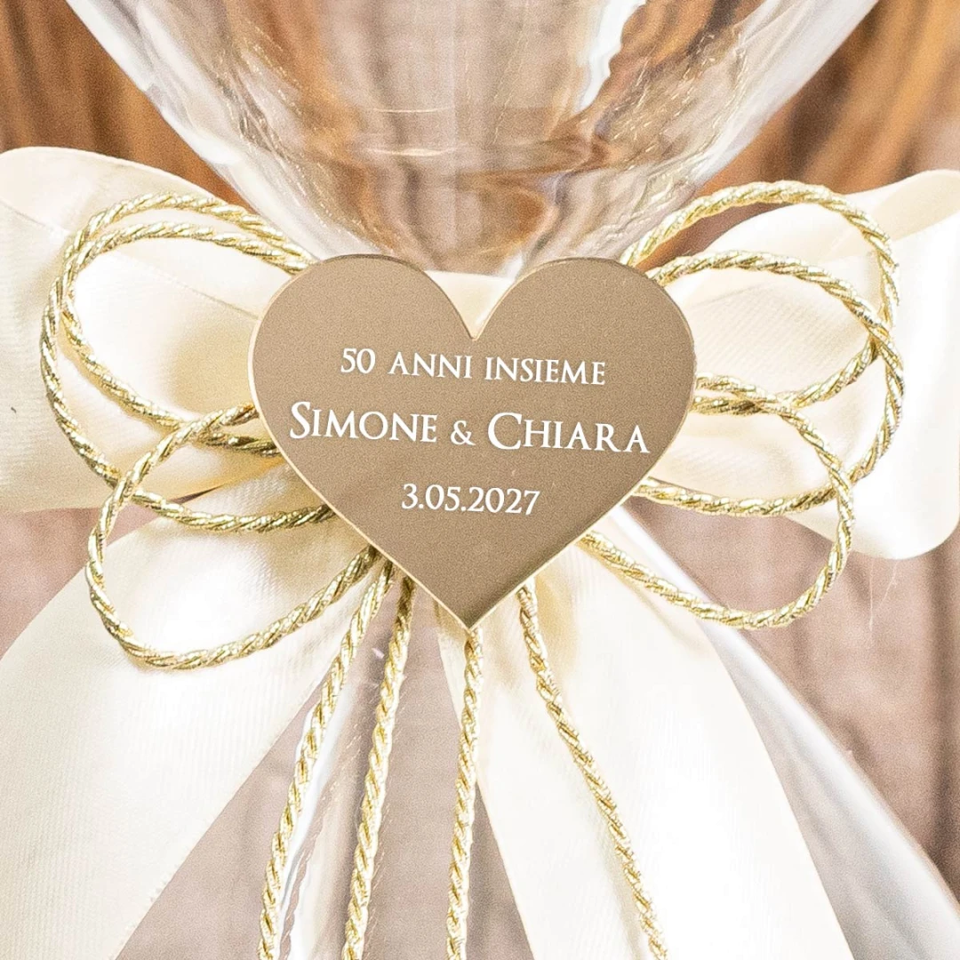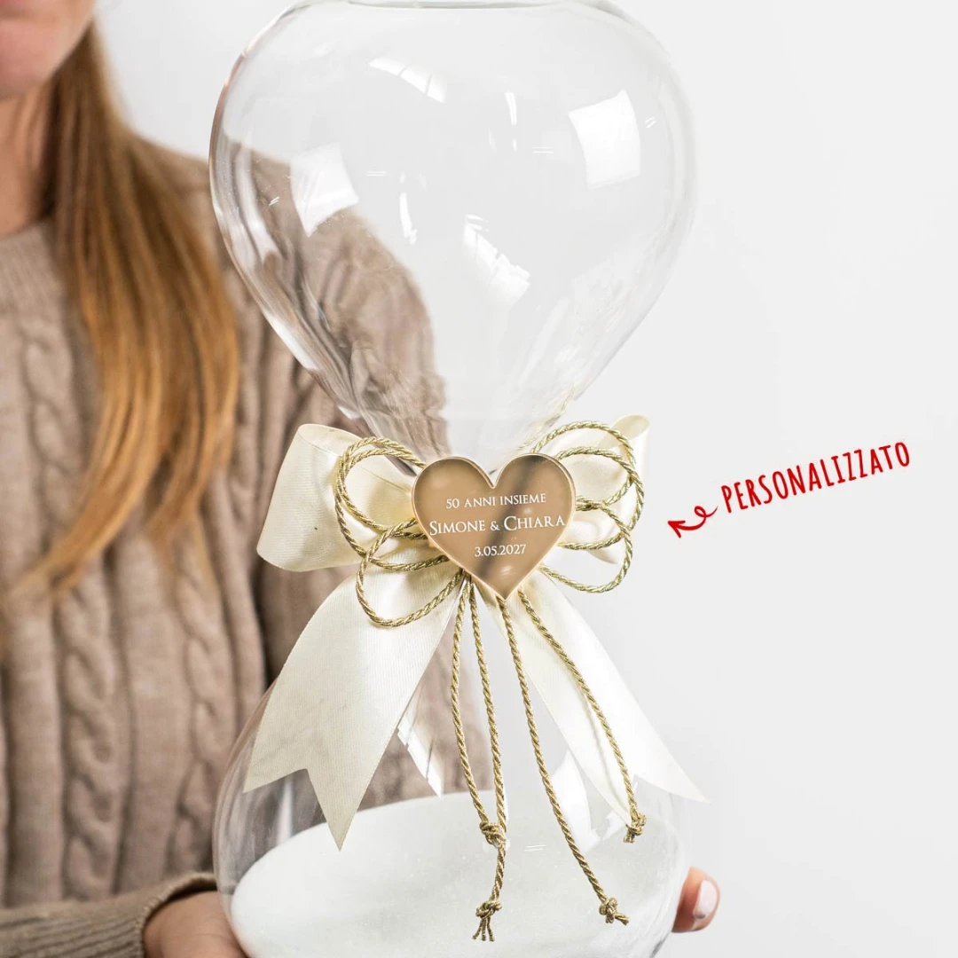 Bomboniere 50° Anniversario di Matrimonio 2026 Clessidra in Vetro soffiato con Sabbia Bianca con cuore in plexiglass personalizzabile, misura MAXI alta 30 cm diametro 12,5 cm.