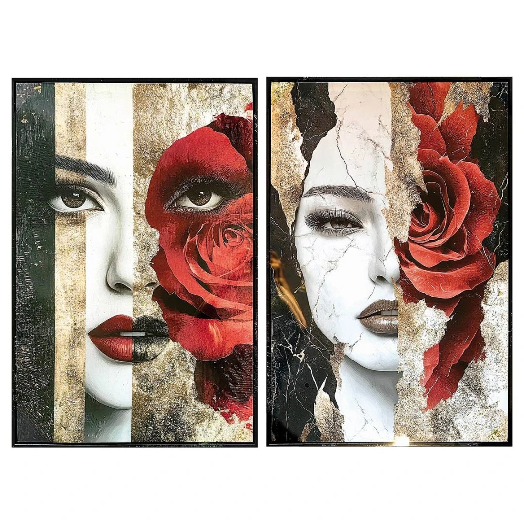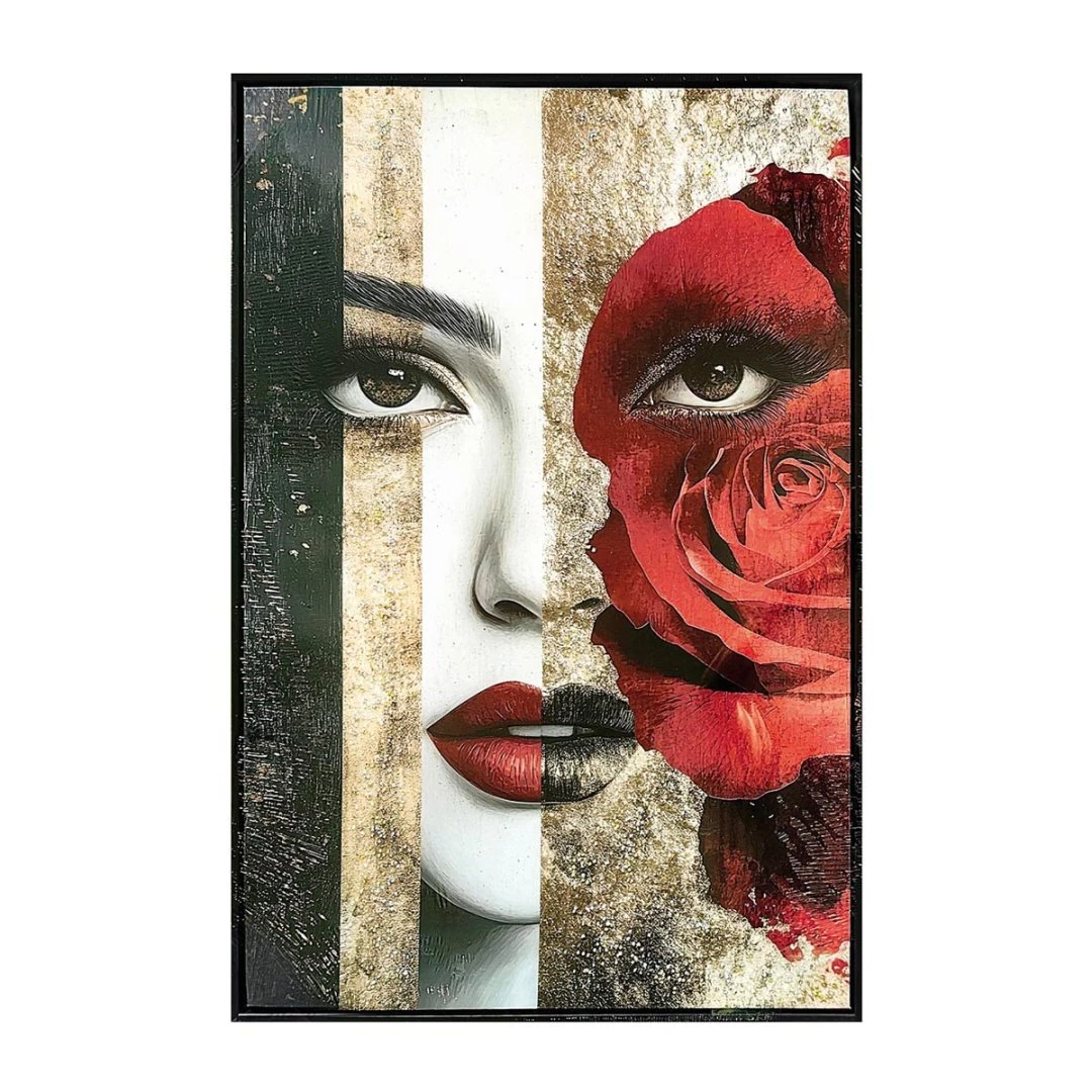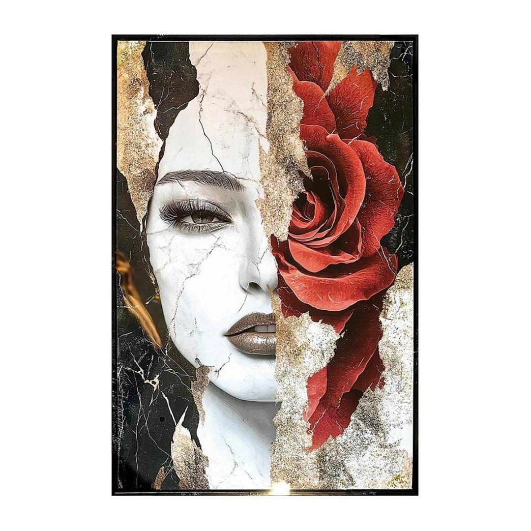 Fantastici quadri che raffigurano Una donna in bianco e nero, lo sguardo che ti segue, e una rosa rossa che esplode come un accento di carattere. La finitura in lacca prende la luce e la rimanda, esaltando i contrasti, le venature “effetto marmo” e quei dettagli dorati che sembrano pennellate di luce. misura 60x90 cm.