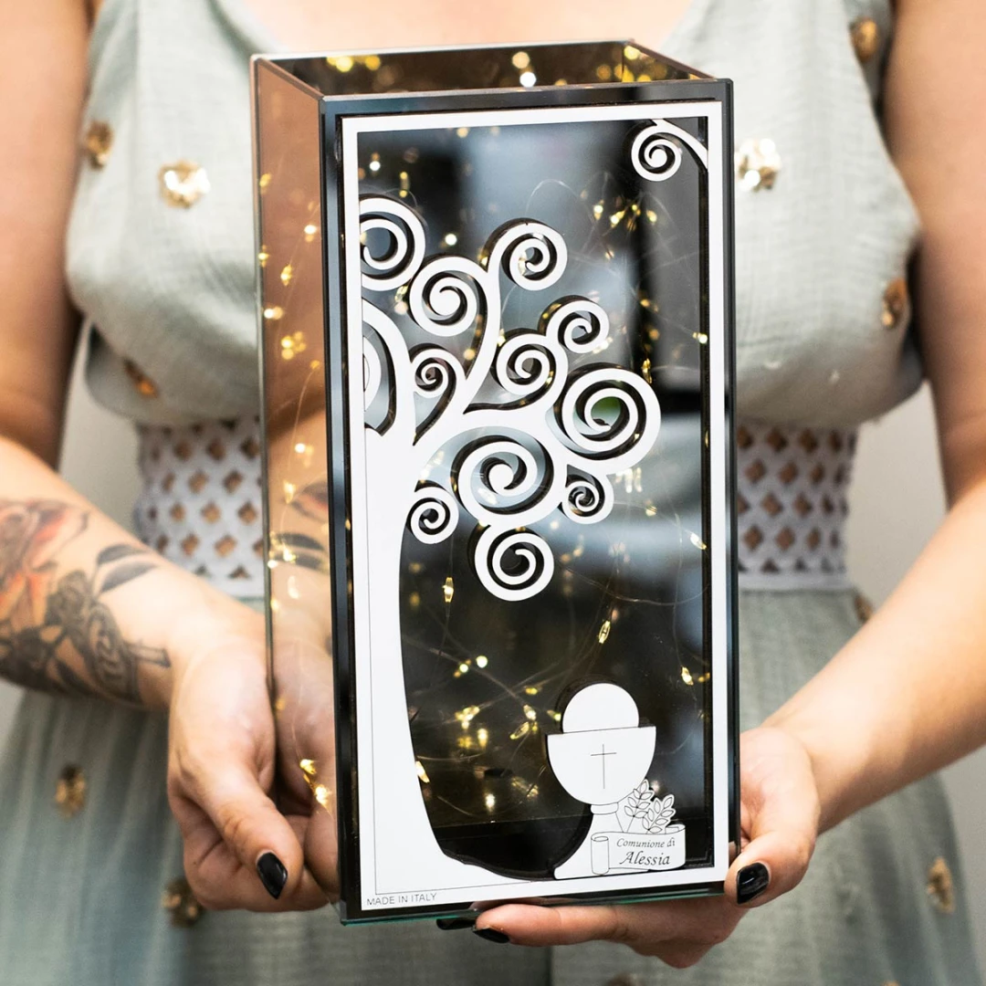 Idea regalo per prima comunione o come Bomboniera più importante per i nonni, Lampada a fili Led realizzata in vetro a specchio fumè, simbolo calice con pergamena sotto l'albero della vita e incisione personalizzata, misura STANDARD 12x12x30 cm e MAXI 20x20x40 cm completa di batterie.
