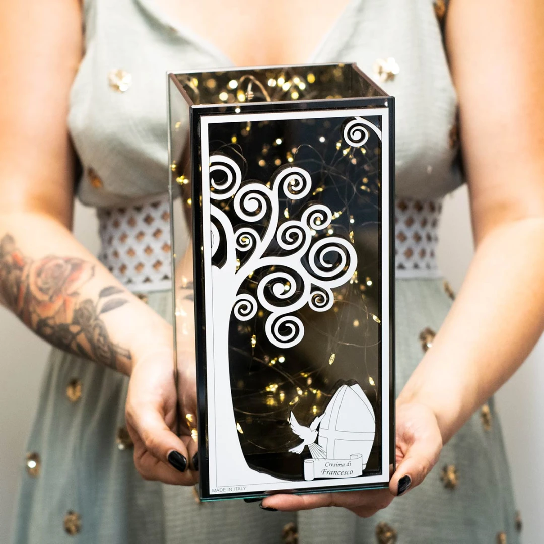 Idea regalo per Cresima o come Bomboniera più importante per i nonni, Lampada a fili Led realizzata in vetro a specchio fumè, simbolo cresima con pergamena sotto l'albero della vita e incisione personalizzata, misura STANDARD 12x12x30 cm e MAXI 20x20x40 cm completa di batterie.