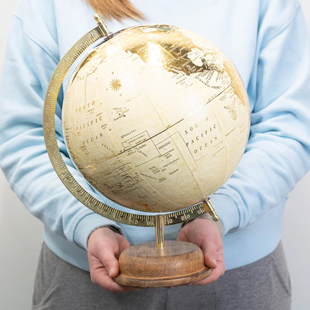 Mappamondo tema viaggio vintage oro e avorio idea regalo, o per matrimonio a tema viaggio, misura 27x27x39 cm,