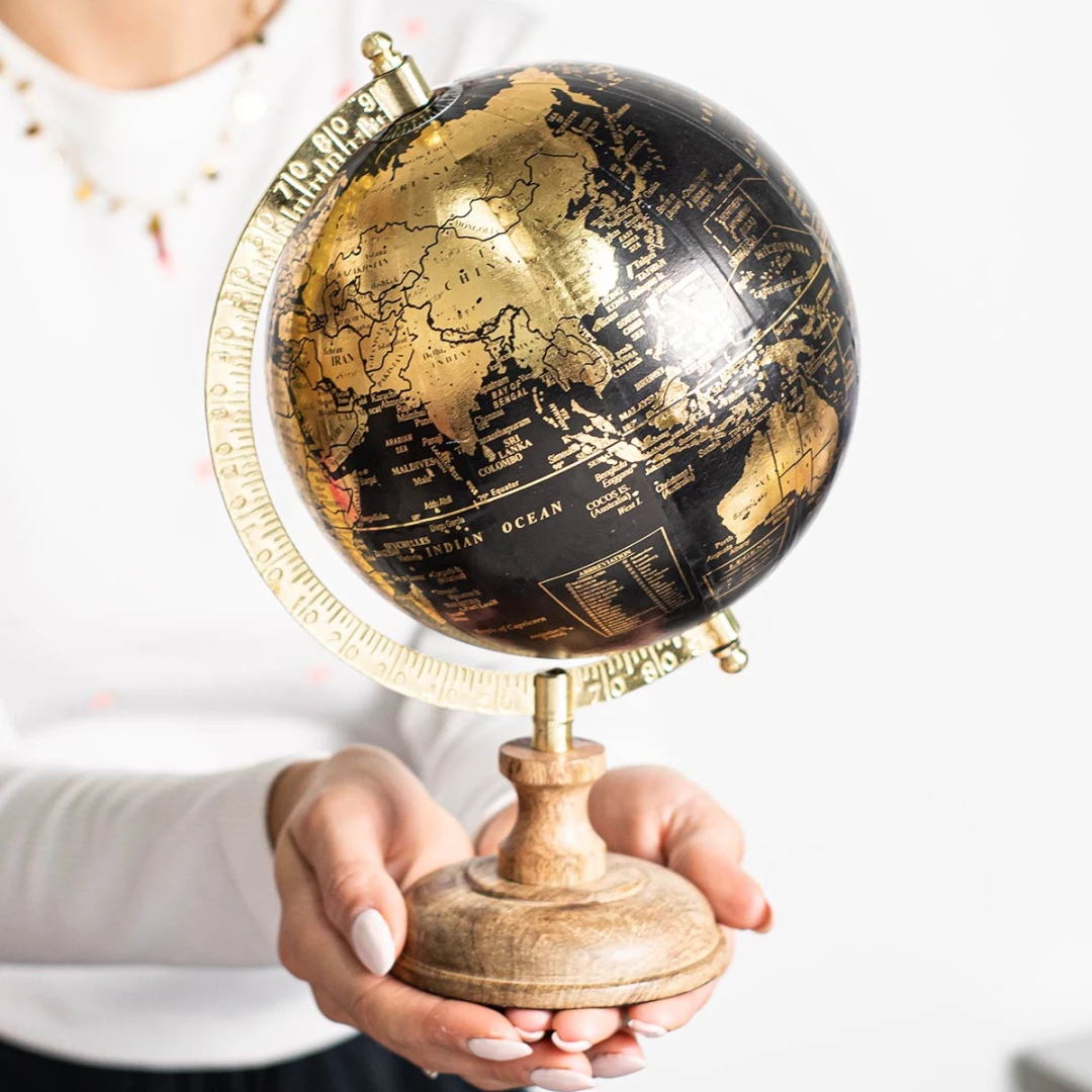 Mappamondo tema viaggio vintage oro e nero idea regalo, o per matrimonio a tema viaggio, misura Ø 17 cm | h 25 cm.