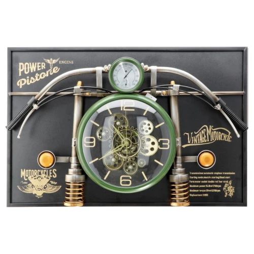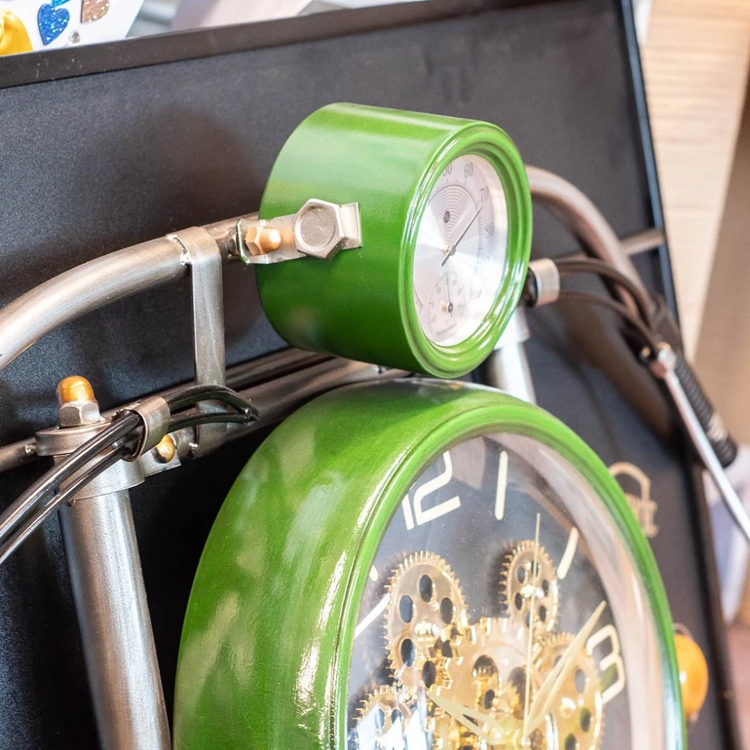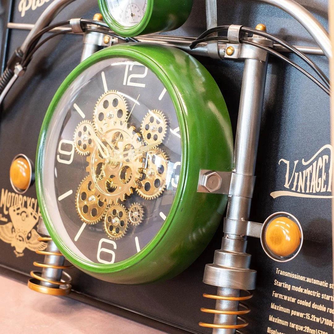 Orologio da parete in ferro fatto a mano con motocicletta in finitura verde, pensato come elemento d’arredo a parete con struttura in rilievo (profondità H 16,5 cm) che crea un effetto 3D. La composizione riprende l’impostazione di una moto: nella parte alta sono presenti le linee del “manubrio” e i collegamenti laterali, al centro si trova il quadrante principale con ingranaggi decorativi a vista che richiamano la meccanica. Il pannello di fondo integra grafiche in stile officina/motorcycle.