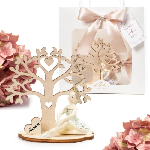 Bomboniere femmina albero della vita con ballerina, l'albero e la base è in legno mentre la ballerina è in resina ed è assortito in 2 posizioni-colori diverse, idea bomboniera originale e Personalizzata, misura circa 10x10x5 cm, prodotto fatto in italia.