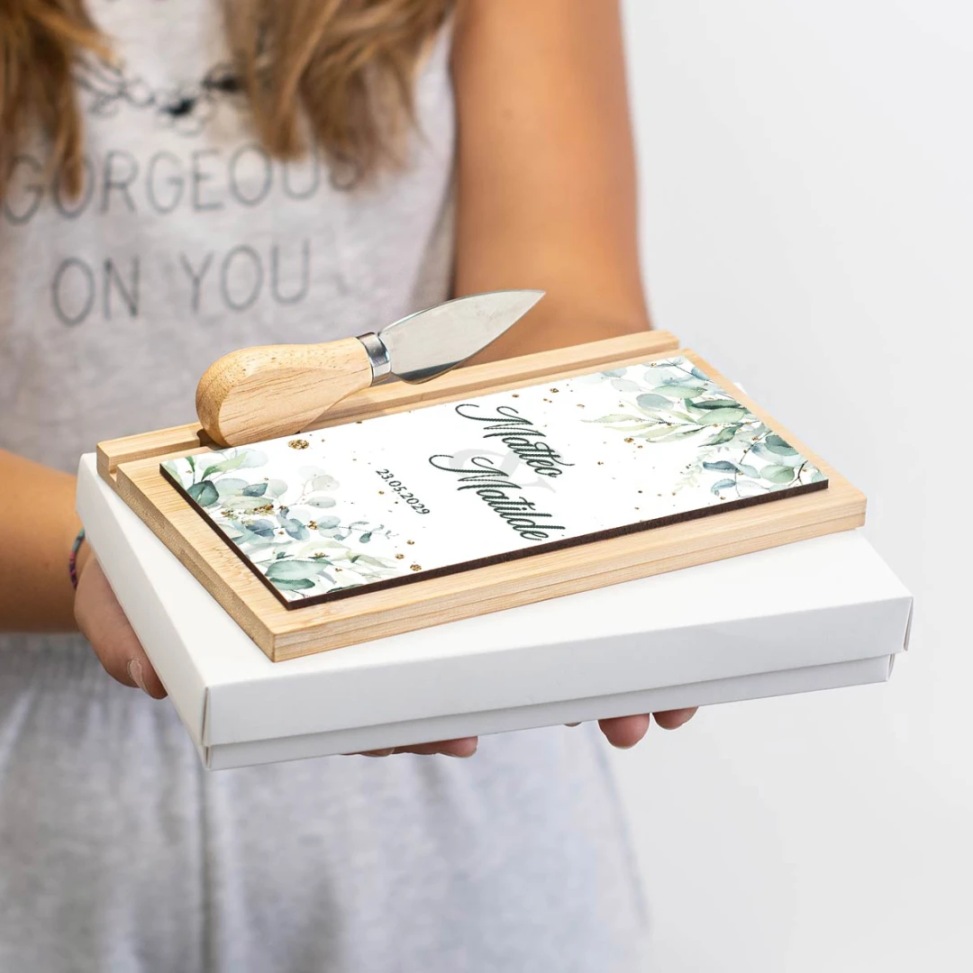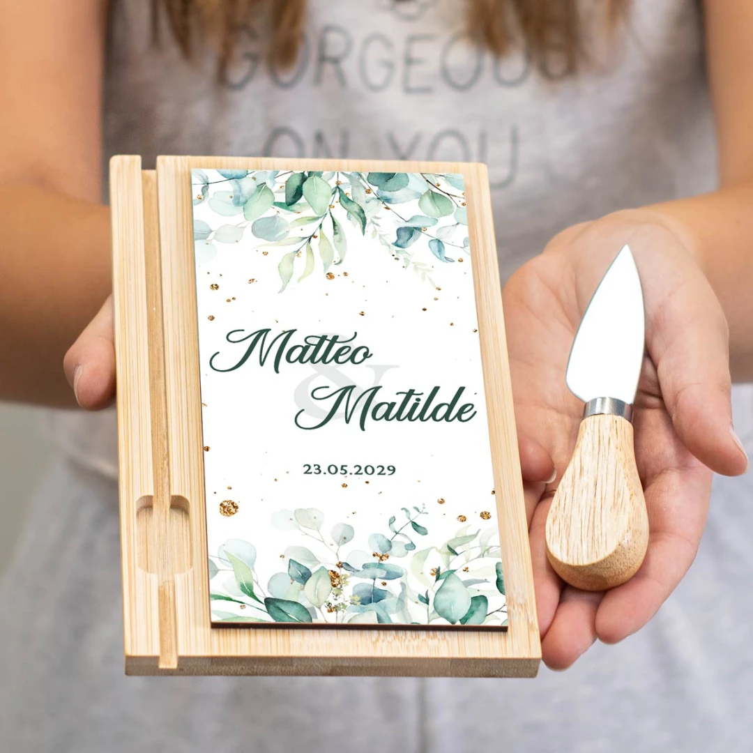 Bomboniere tagliere personalizzato con coltellino, foglie di eucalipto con particelle dorate, bellissima idea come bomboniera originale ed utile. Misura tagliere: 12x20x1 cm, coltellino 7 cm.