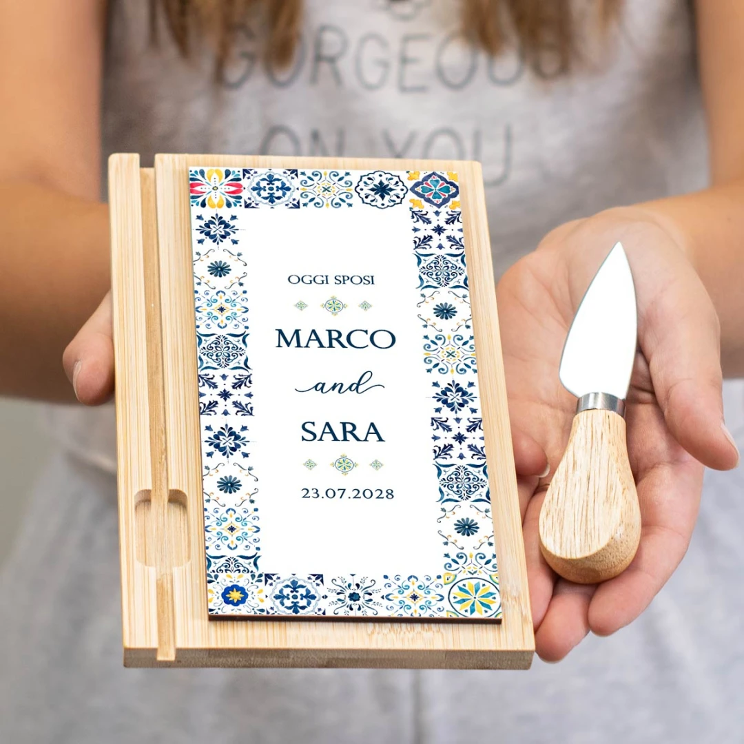 Bomboniere tagliere personalizzato con coltellino, con mattonelle fantasia maioliche che circondano l'intero tagliere, bellissima idea come bomboniera originale ed utile. Misura tagliere: 12x20x1 cm, coltellino 7 cm.