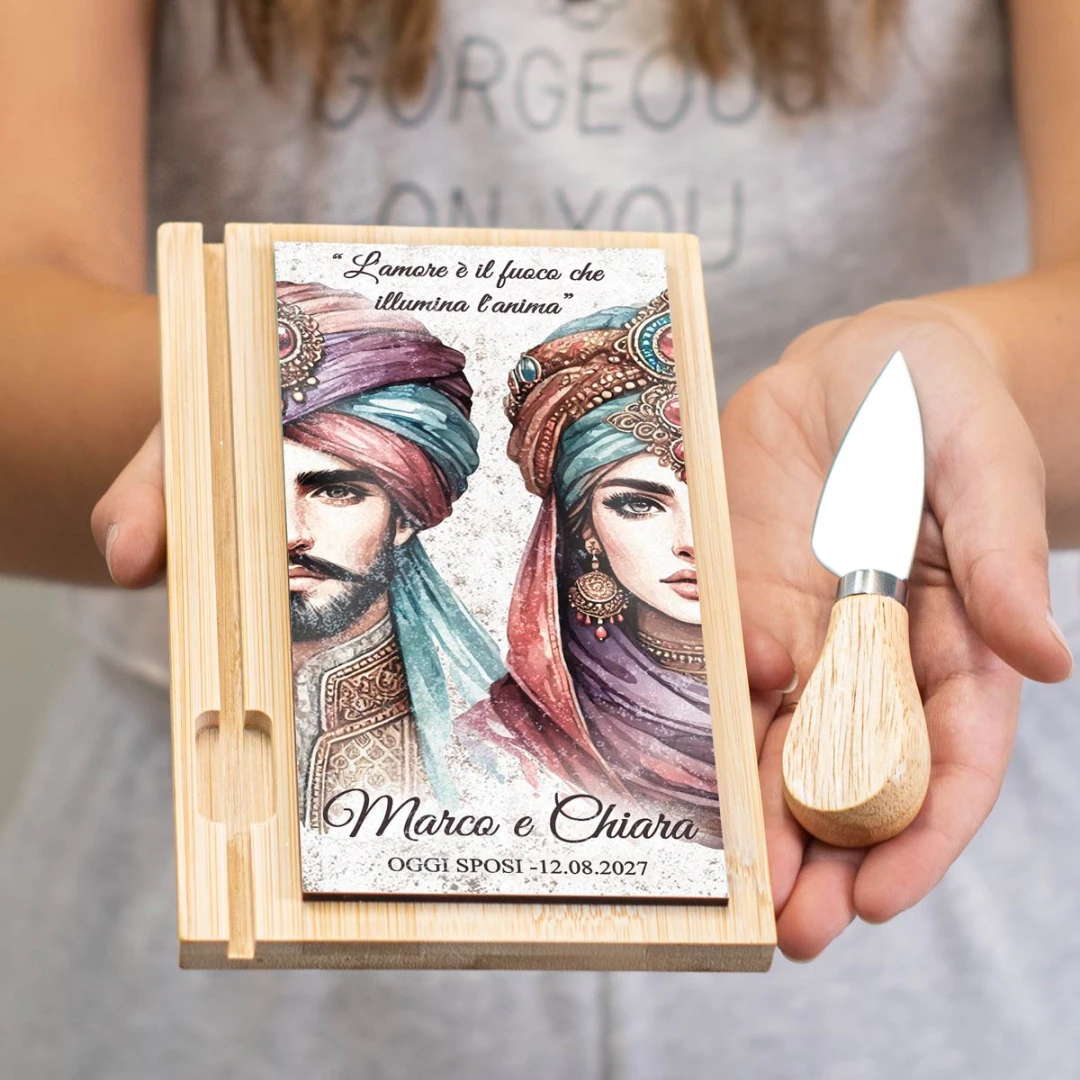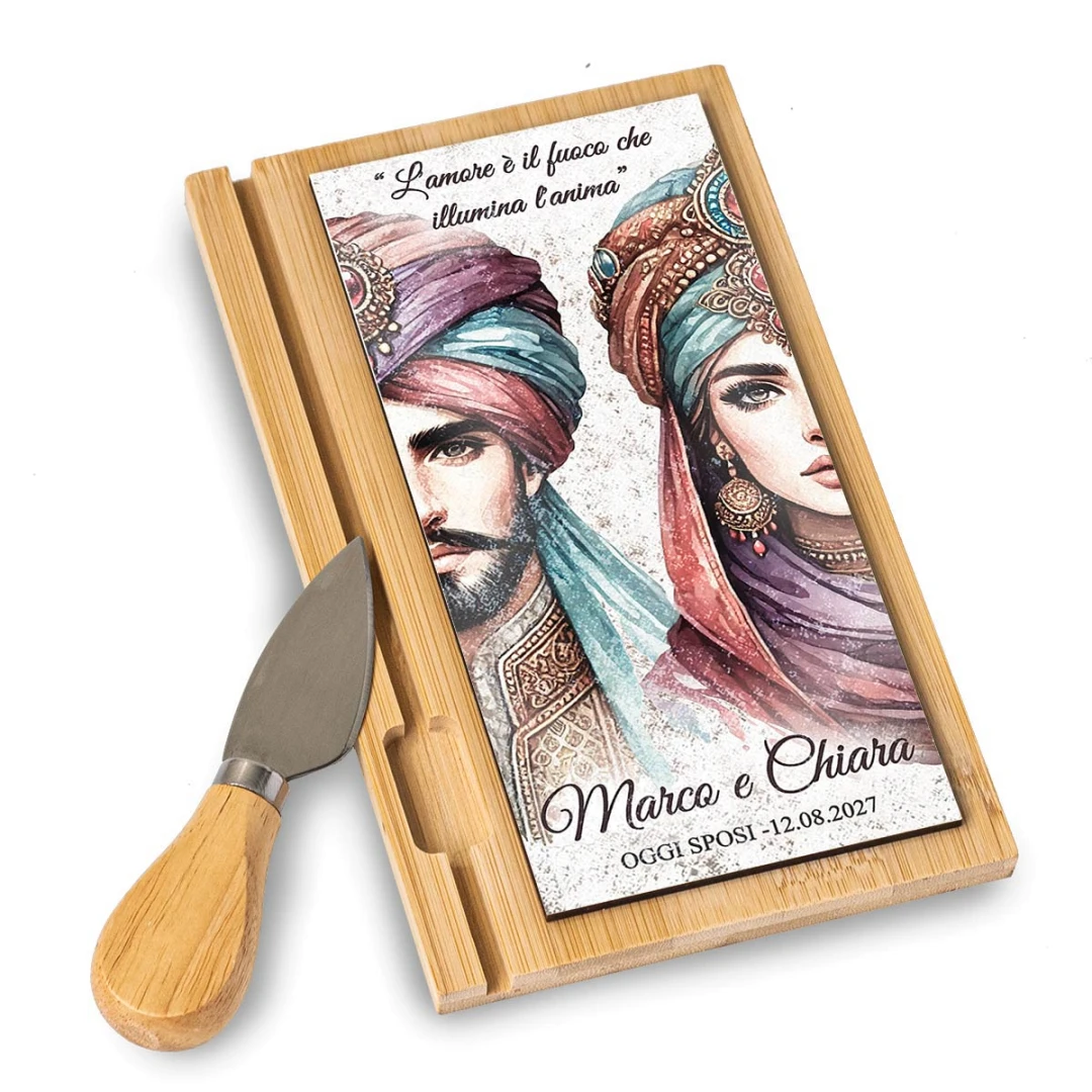 Bomboniere tagliere personalizzato con coltellino, con mori siciliani e frase, bellissima idea come bomboniera originale ed utile. Misura tagliere: 12x20x1 cm, coltellino 7 cm.