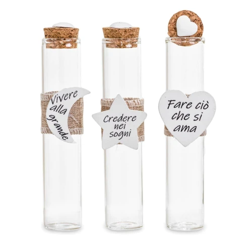 Idea Bomboniera Originale 2026, simpatici barattolini - vasetti in vetro che possono essere utilizzati come porta-confetto, porta spezie, contenitore per marmellata, miele. Scegli tra barattolino piccolo h 6,5 cm e barattolo Grande h 9 cm e fialetta 13 cm