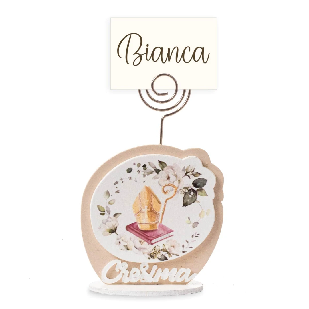 Bomboniere Santa Cresima, Linea Santus, Clip Segnaposto con disegno cappello con bastone e decori floreali impreziosito da una scritta glitterata alla base. Prezzo cadauno. Prodotto Artigianale. 6 x 2,5 cm | h 10 cm. Cartoncino Omaggio.