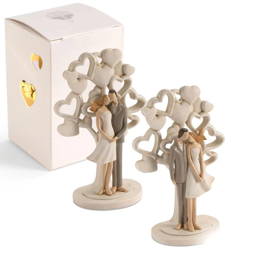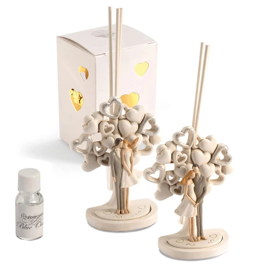 Bomboniere Solidali Matrimonio Quadrifoglio 2026Linea Chiara, composta da Statuine e profumatore Coppia con Albero della Vita in resina decorata a mano con Scatola LED, ottimo compromesso tra bomboniera e beneficienza, parte del ricavato sarà devoluto alla fondazione ABIO (ass.italiana per il bambino in ospedale), complete di certificato di donazione e Scatola LED.