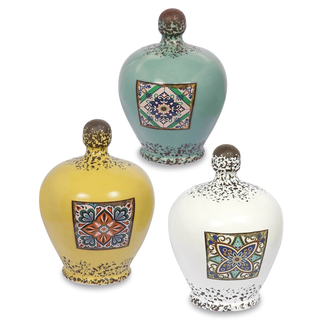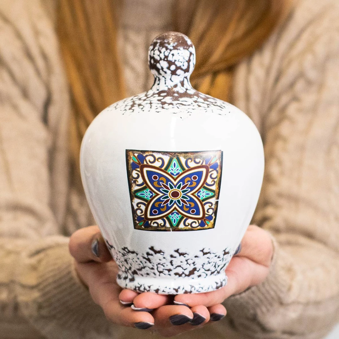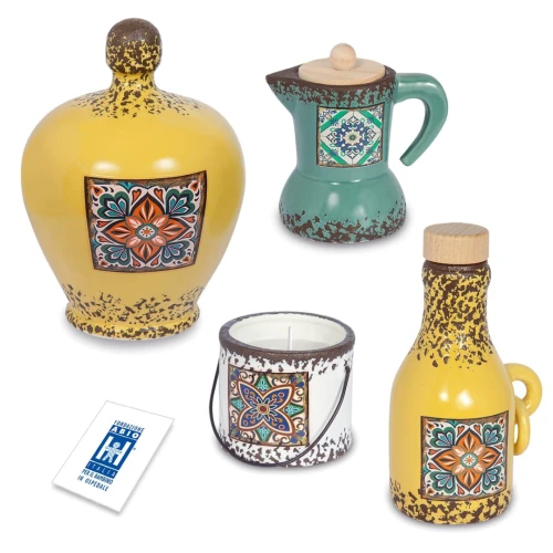 Bomboniere Solidali Quadrifoglio 2026 Linea Decori, composta da Oliere, Portacandela con candela, Salvadanaio e Zuccheriera moka il tutto rifinitto in stile maioliche, ottimo compromesso tra bomboniera e beneficienza, parte del ricavato sarà devoluto alla fondazione ABIO (ass.italiana per il bambino in ospedale), complete di certificato di donazione. Arrivano in tre colorazioni assortite. Prezzo cadauno. Prodotto Artigianale.