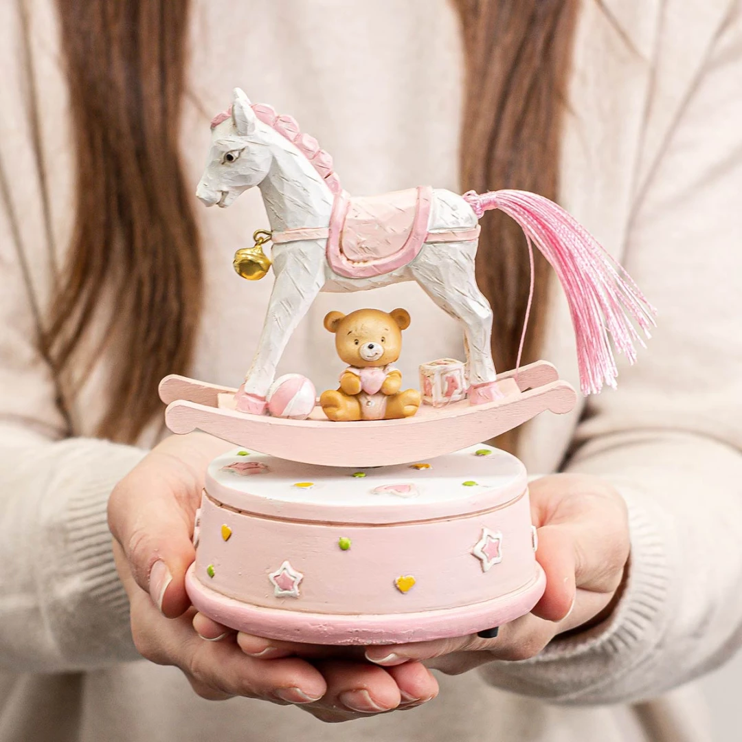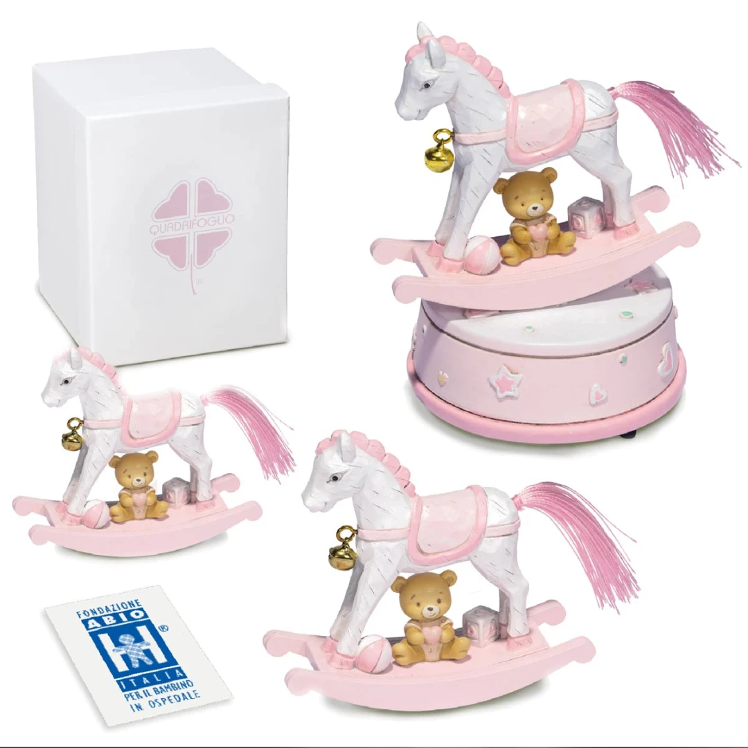 Bomboniere Solidali Quadrifoglio 2026 Linea Dublino Rosa, composta da Statuette cavallini e Carillon, ottimo compromesso tra bomboniera e beneficienza, parte del ricavato sarà devoluto alla fondazione ABIO (ass.italiana per il bambino in ospedale), complete di certificato di donazione e scatola. Prezzo cadauno. Prodotto Artigianale.