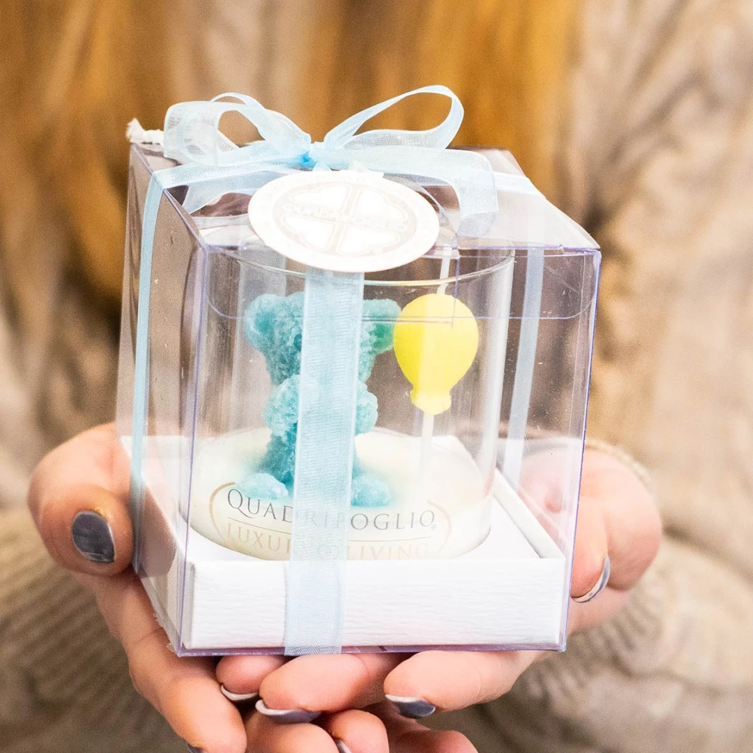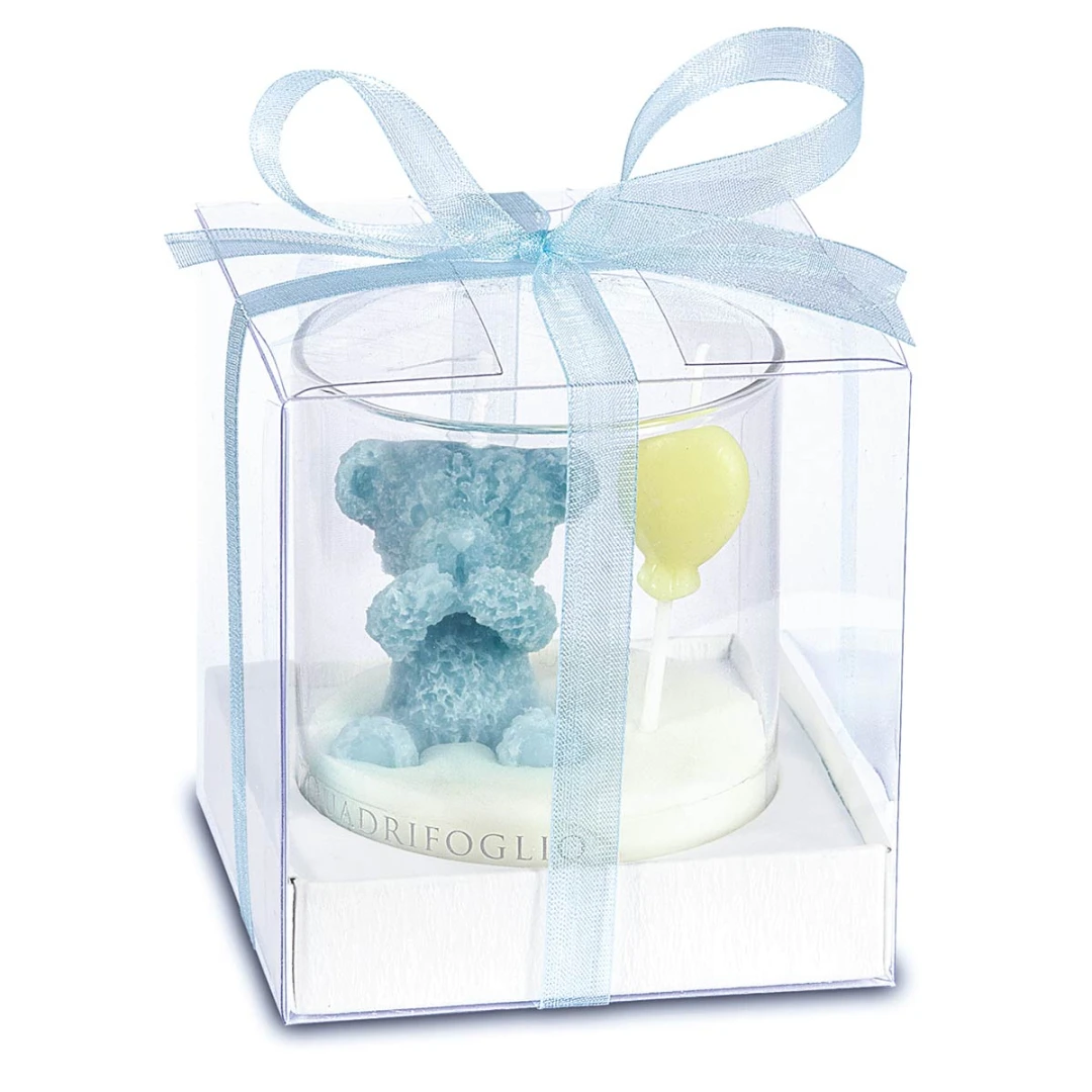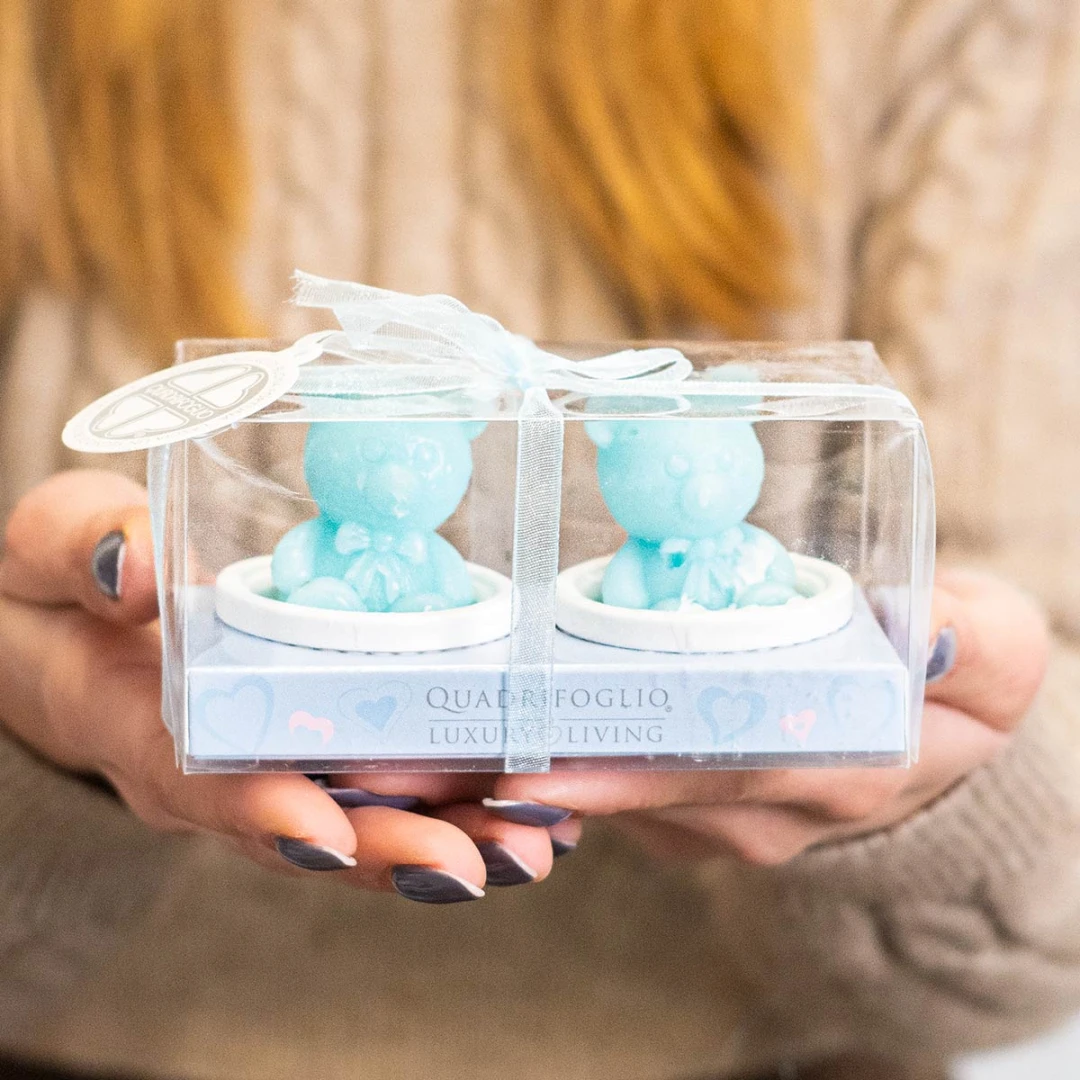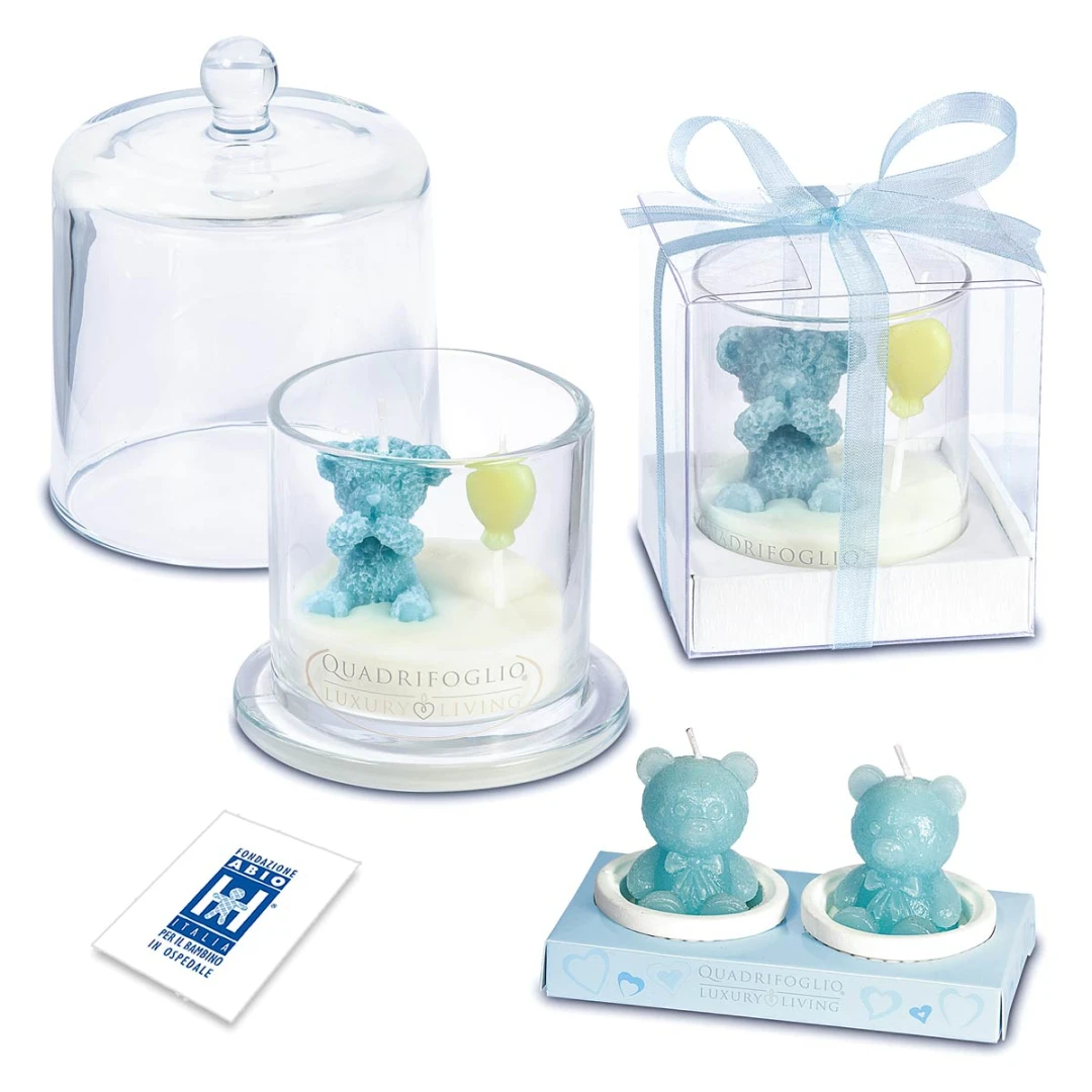 Bomboniere Solidali Quadrifoglio 2026 Linea Fiaba Celeste, composta da candele profumate a forma di orsetto in diversi modelli, ottimo compromesso tra bomboniera e beneficienza, parte del ricavato sarà devoluto alla fondazione ABIO (ass.italiana per il bambino in ospedale), complete di certificato di donazione e scatola in pvc con nastro in organza. Prezzo cadauno. Prodotto Artigianale.