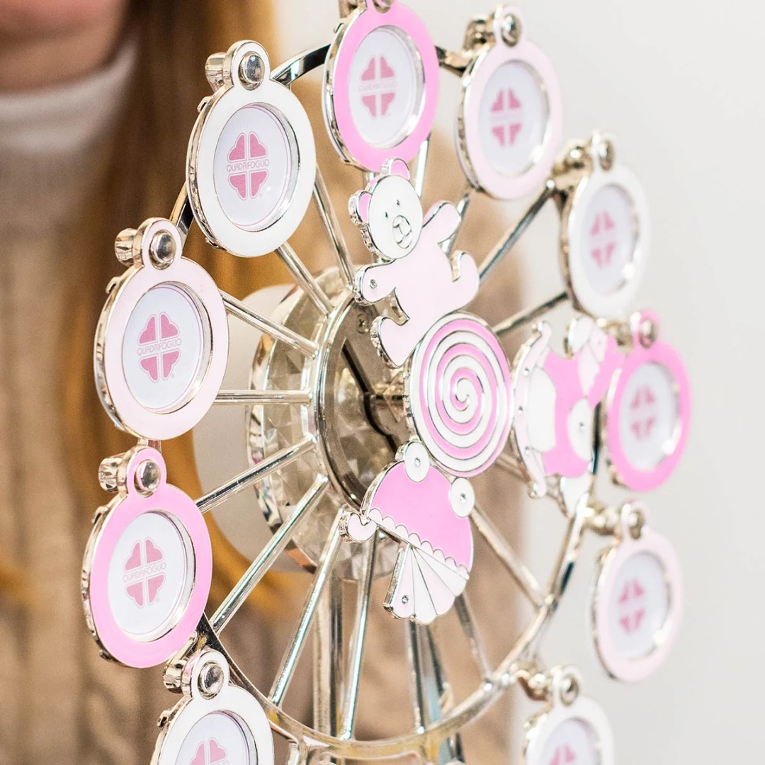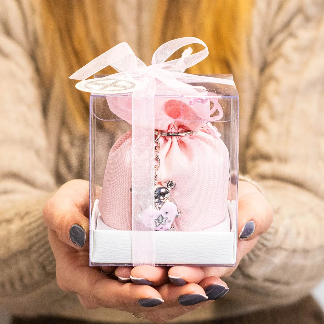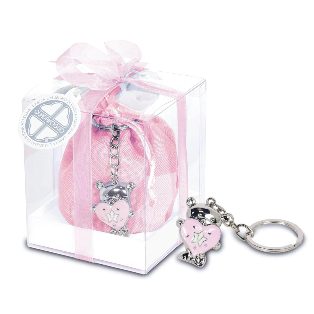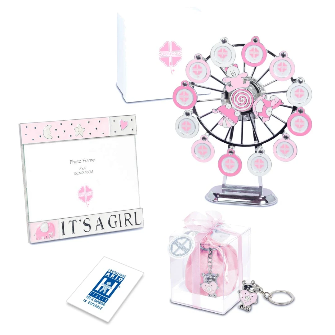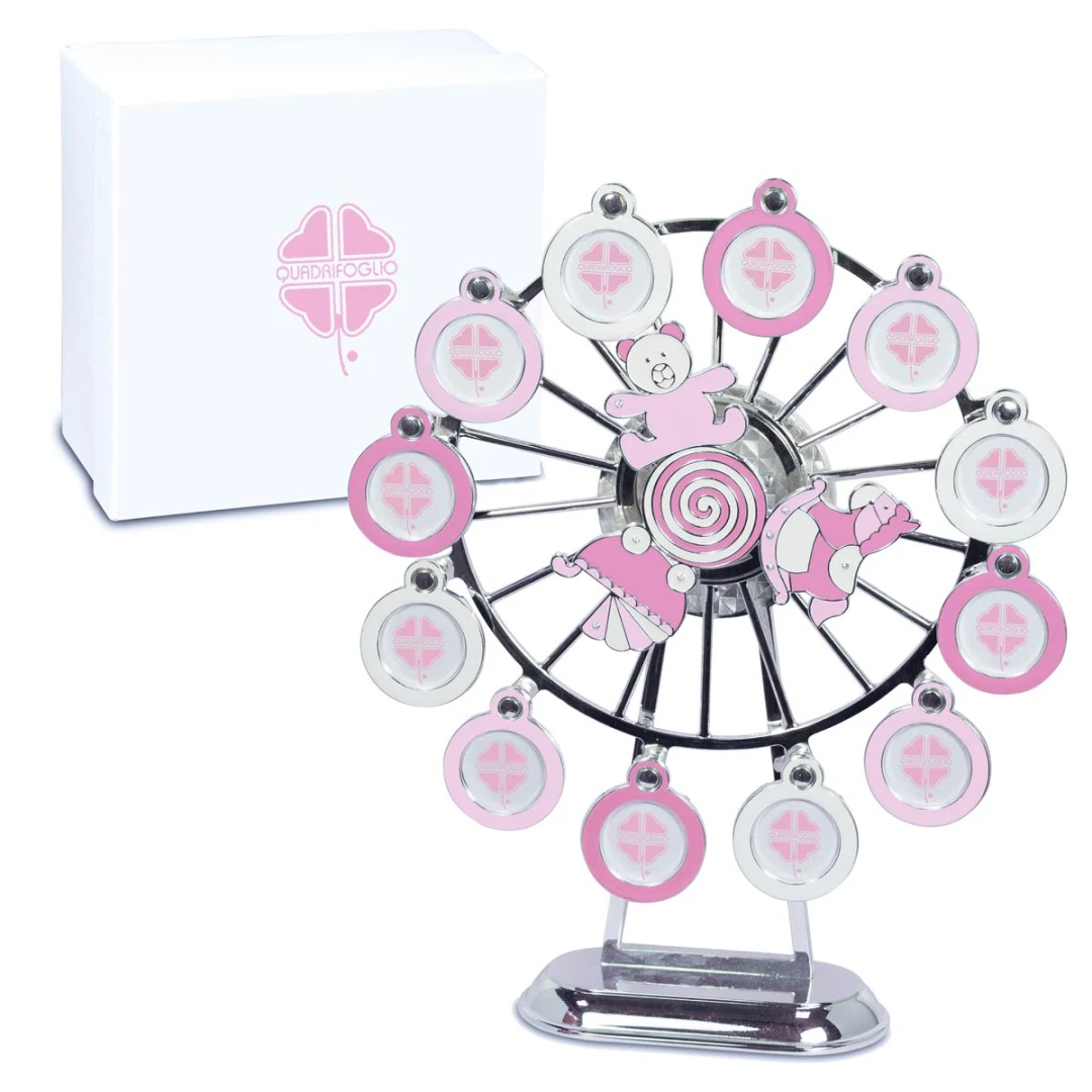 Bomboniere Solidali Quadrifoglio 2026 Linea Nuvola Rosa, composta da portachiavi a forma di orsetto, portafoto carillon a forma di ruota panoramica e portafoto da appoggio il tutto in metallo decorato, ottimo compromesso tra bomboniera e beneficienza, parte del ricavato sarà devoluto alla fondazione ABIO (ass.italiana per il bambino in ospedale), complete di certificato di donazione e scatola (il portachiavi include anche nastro in organza con scatola in pvc). Prezzo cadauno. Prodotto Artigianale.