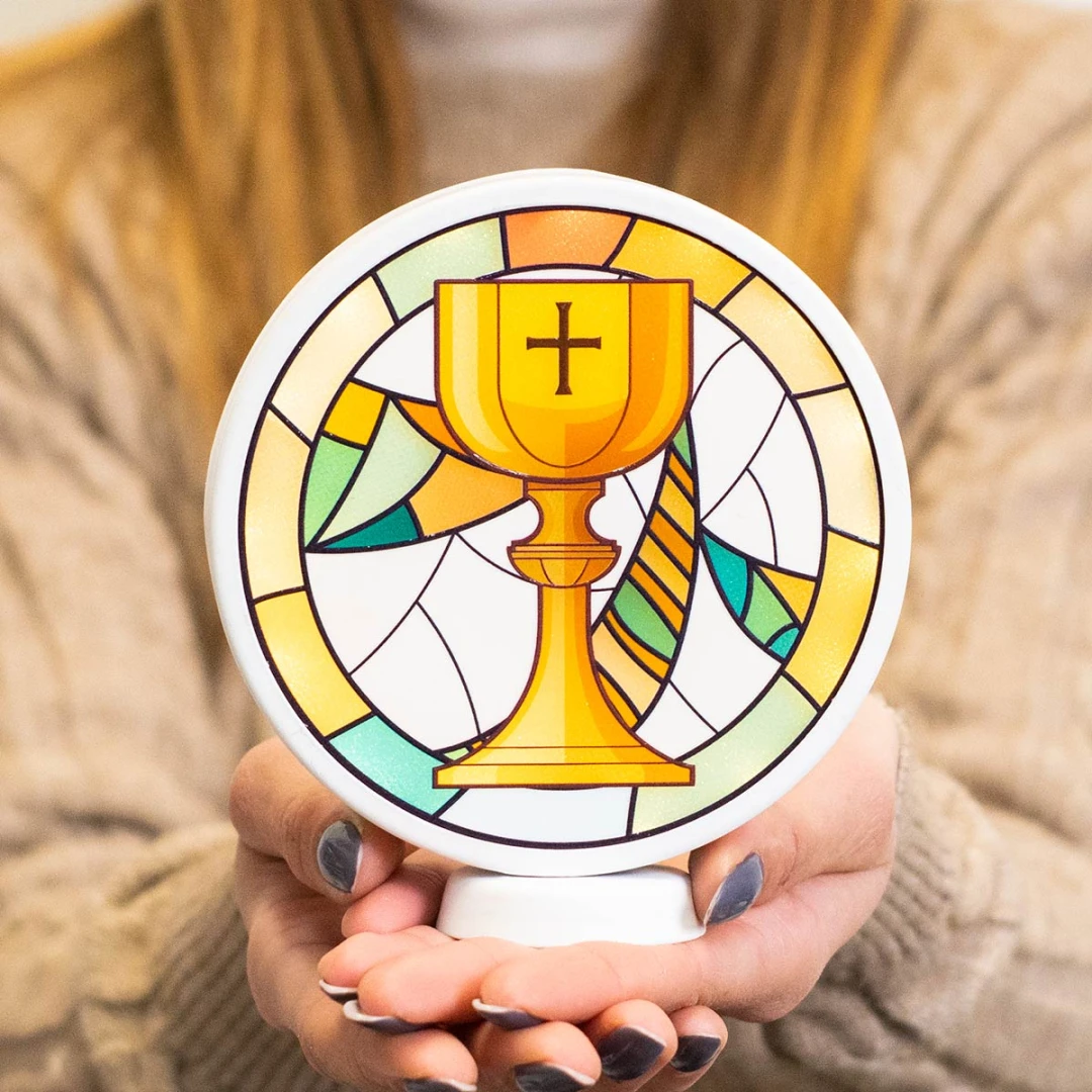Bomboniere Solidali Quadrifoglio 2026 Linea Rito Comunione, composta da Luci LED con decoro calice e sostegno, struttura in metallo colorato, ottimo compromesso tra bomboniera e beneficienza, parte del ricavato sarà devoluto alla fondazione ABIO (ass.italiana per il bambino in ospedale), complete di certificato di donazione. Sono disponibili due misure. Prezzo cadauno. Prodotto Artigianale.