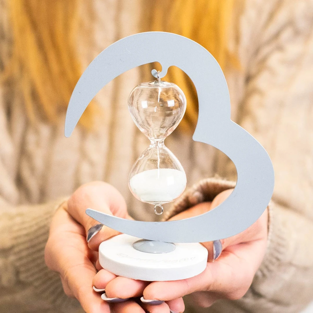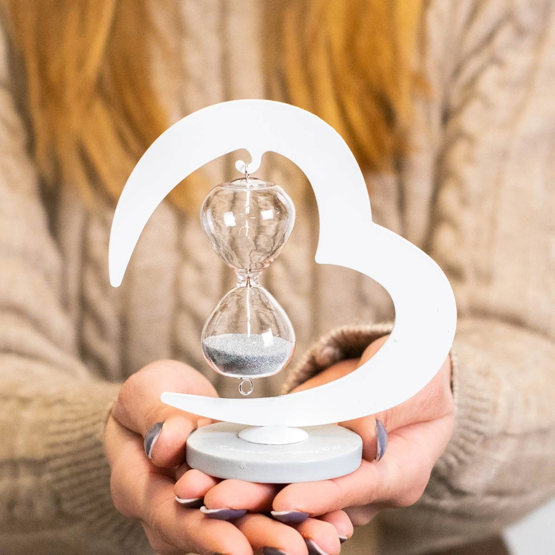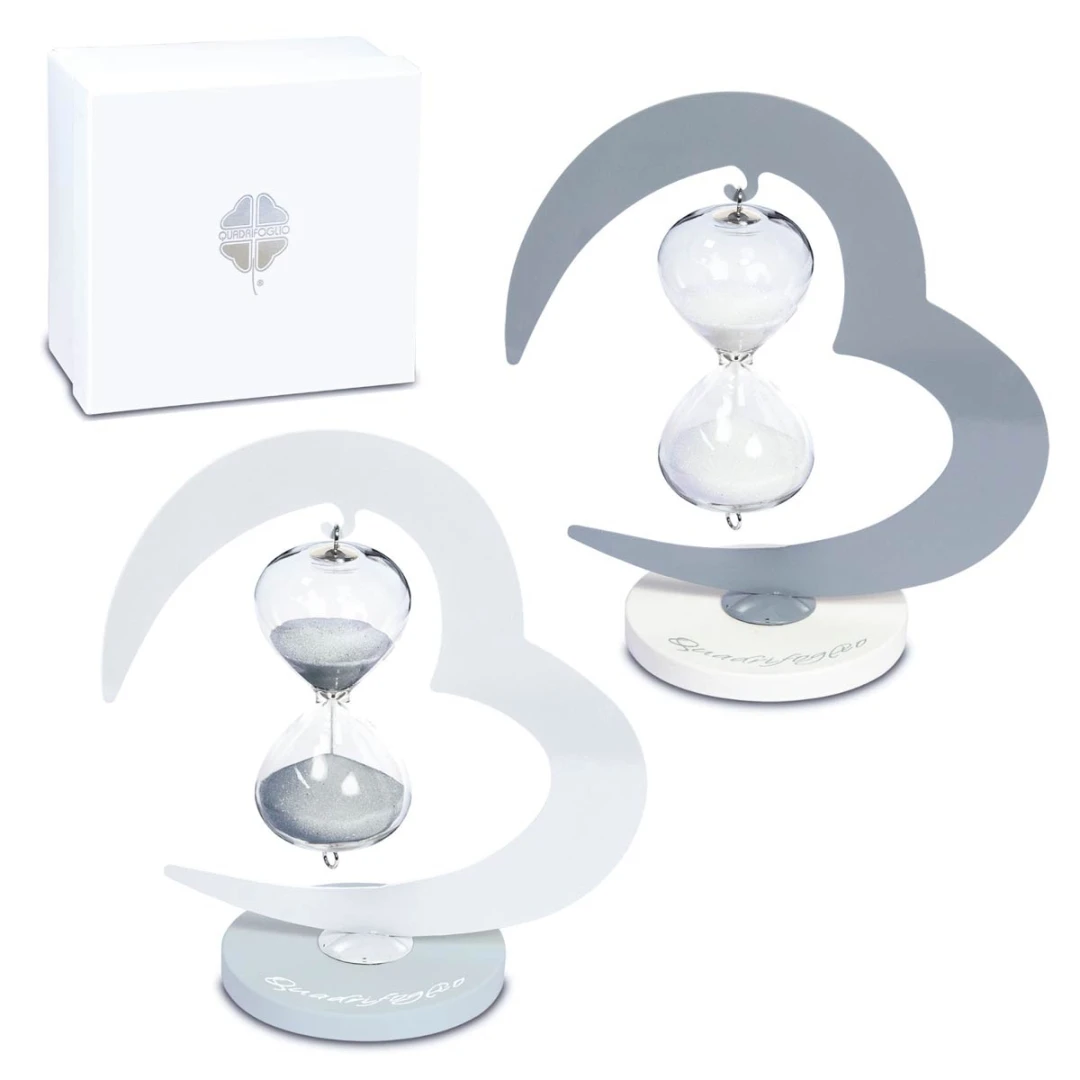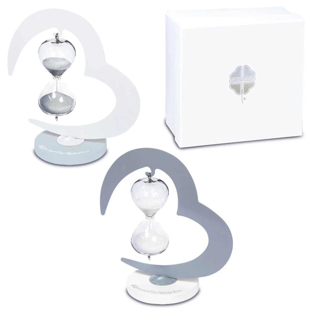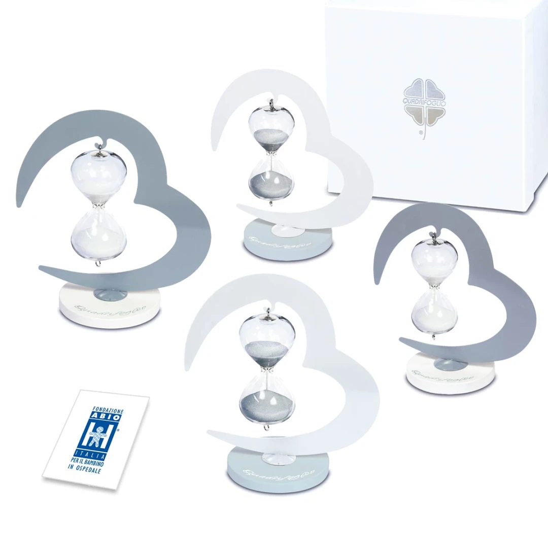 Bomboniere Solidali Quadrifoglio 2026 Linea Tempo, composta da clessidre in vetro su base in metallo a formadi cuore con scritta su base, ottimo compromesso tra bomboniera e beneficienza, parte del ricavato sarà devoluto alla fondazione ABIO (ass.italiana per il bambino in ospedale), complete di certificato di donazione e scatola. Arrivano in due colorazioni assortite. Prezzo cadauno. Prodotto Artigianale.