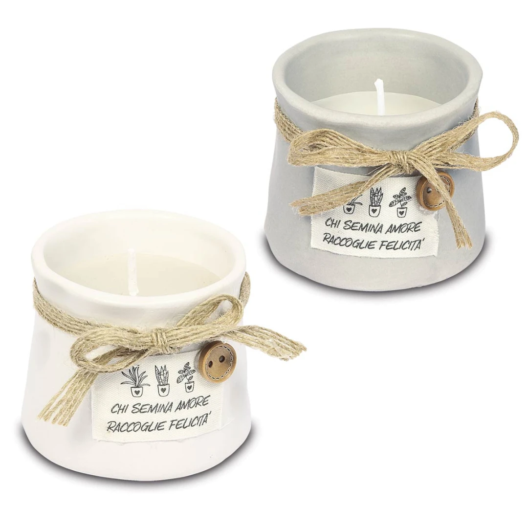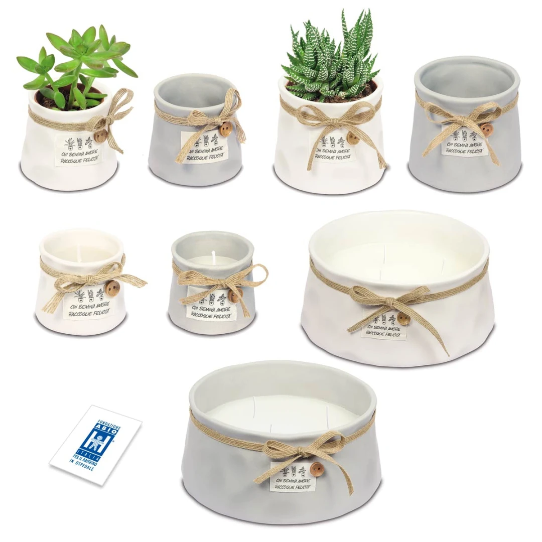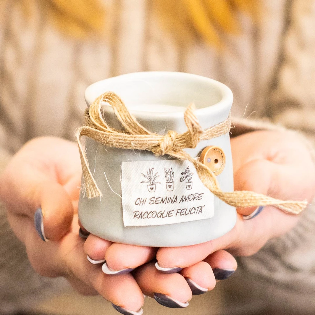 Bomboniere Solidali Quadrifoglio 2026 Linea Terra, composta da Portacandela con candela e portapiantina in ceramica con dettaglio frase, fiocchino e bottone su fronte, ottimo compromesso tra bomboniera e beneficienza, parte del ricavato sarà devoluto alla fondazione ABIO (ass.italiana per il bambino in ospedale), complete di certificato di donazione e scatola. Prezzo cadauno. Prodotto Artigianale. Tutti i modelli arrivano assortiti in due colorazioni.