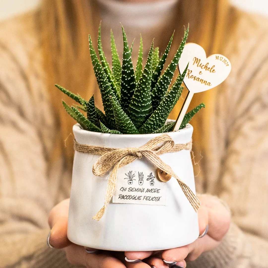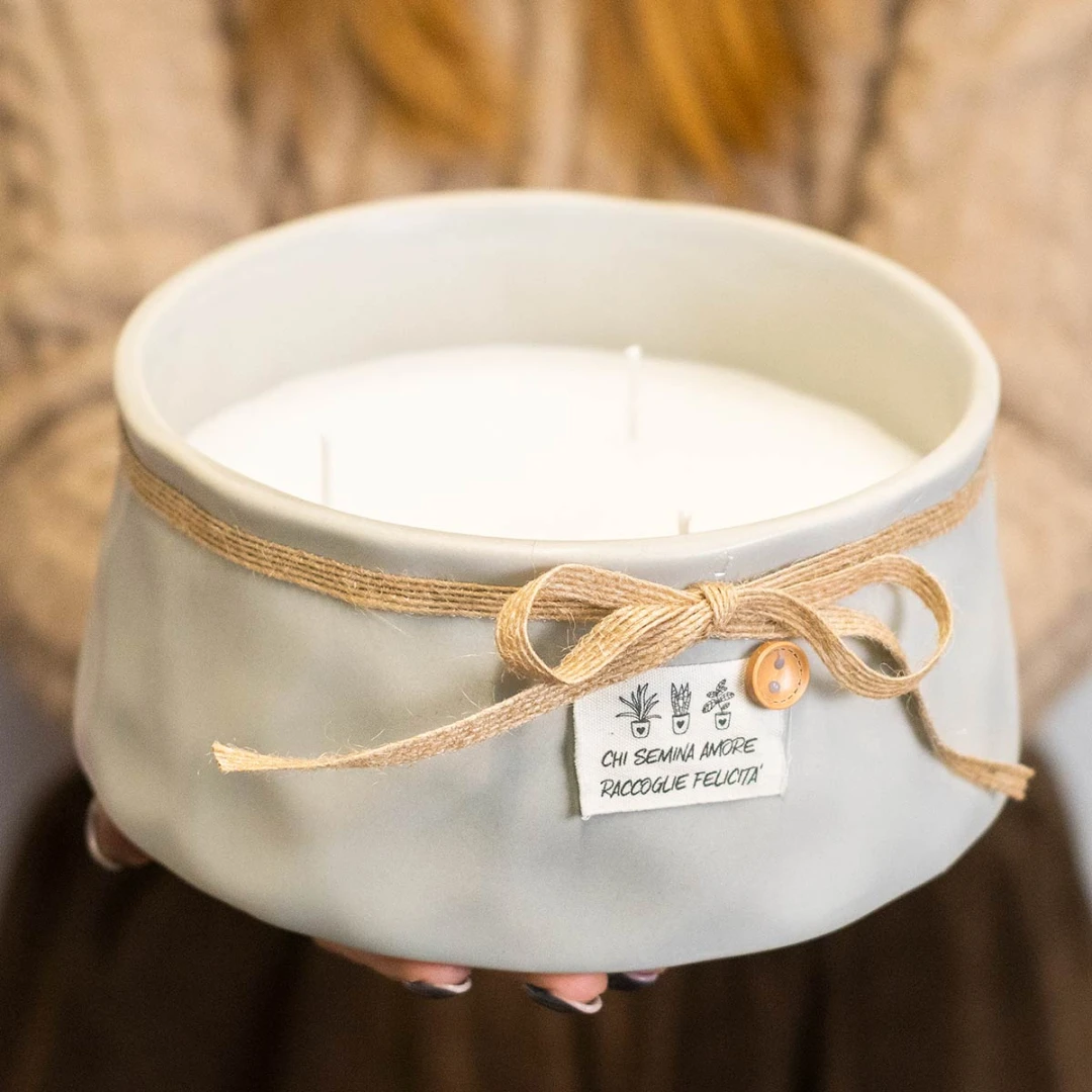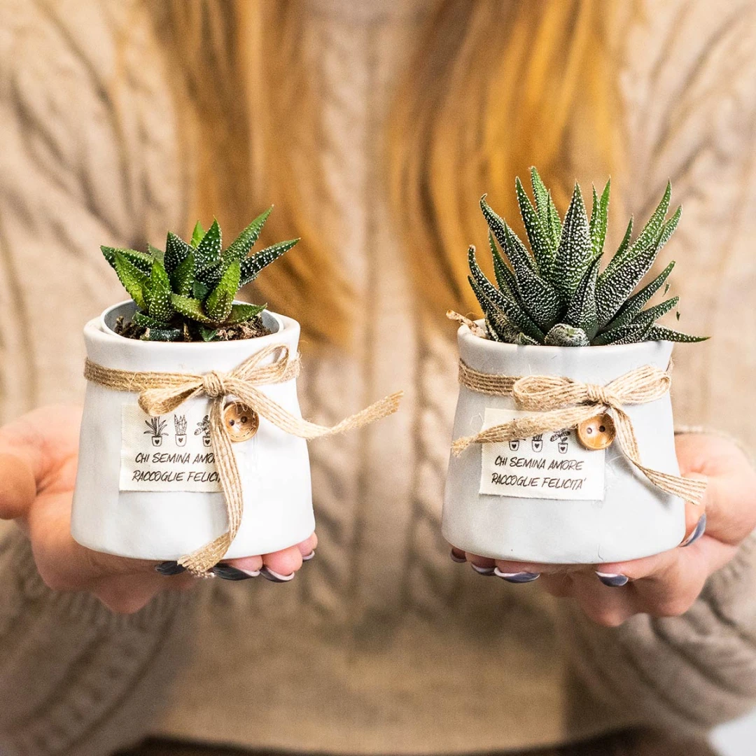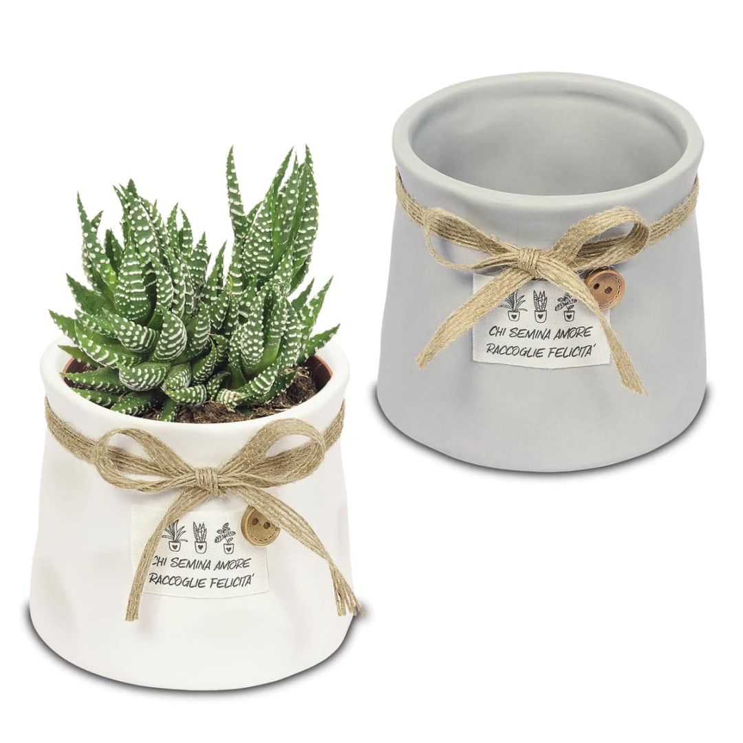 Bomboniere Solidali Quadrifoglio 2026 Linea Terra, composta da Portacandela con candela e portapiantina in ceramica con dettaglio frase, fiocchino e bottone su fronte, ottimo compromesso tra bomboniera e beneficienza, parte del ricavato sarà devoluto alla fondazione ABIO (ass.italiana per il bambino in ospedale), complete di certificato di donazione e scatola. Prezzo cadauno. Prodotto Artigianale. Tutti i modelli arrivano assortiti in due colorazioni.