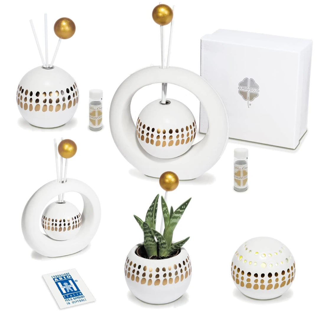 Bomboniere Solidali Quadrifoglio 2026 Linea Varsavia, composta da Portapiantina, Luce LED e Profumatori decorati a mano, ottimo compromesso tra bomboniera e beneficienza, parte del ricavato sarà devoluto alla fondazione ABIO (ass.italiana per il bambino in ospedale), complete di certificato di donazione e Scatola (Solo il portapiantina non è compreso di scatola). I profumatori arrivano inoltre completi di profumo e bacchette. Prezzo cadauno. Prodotto Artigianale.
