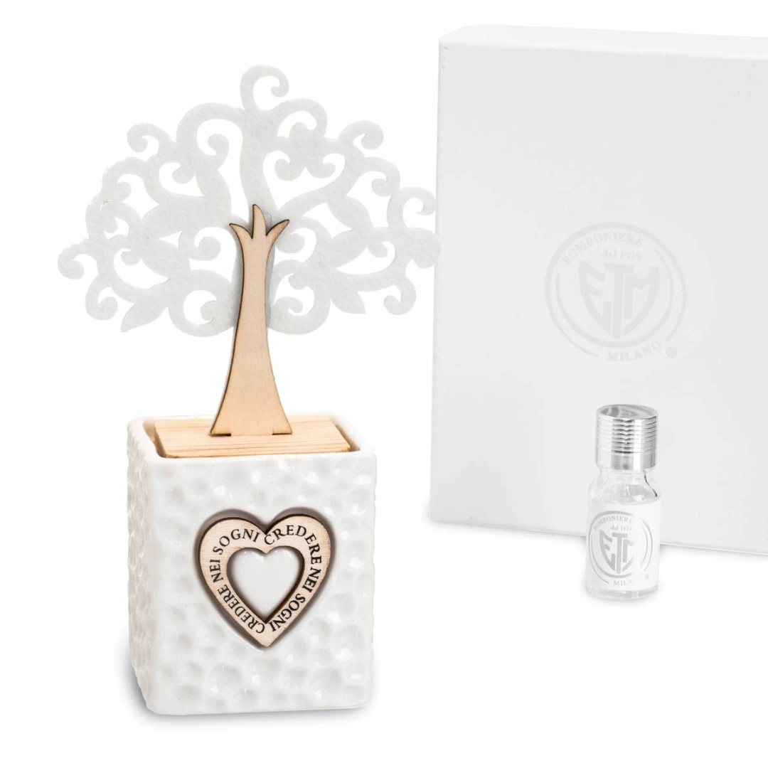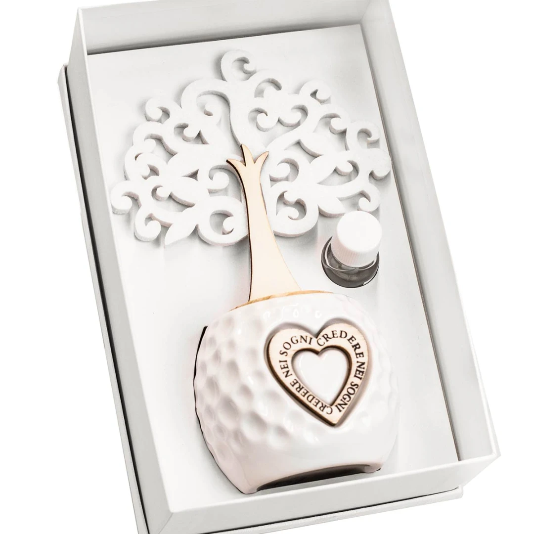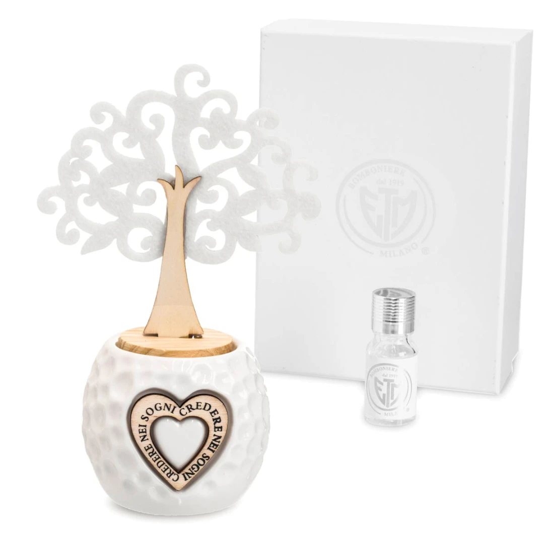 Linea di Bomboniere Utili in offerta stock, profumatori in ceramica con albero della vita in legno e feltro e cuore centrale con scritto "credere nei sogni", idea bomboniera originale ed utile , compreso di scatola fondo coperchio rigida e bottiglia profumo, misura 7x13x20 cm.