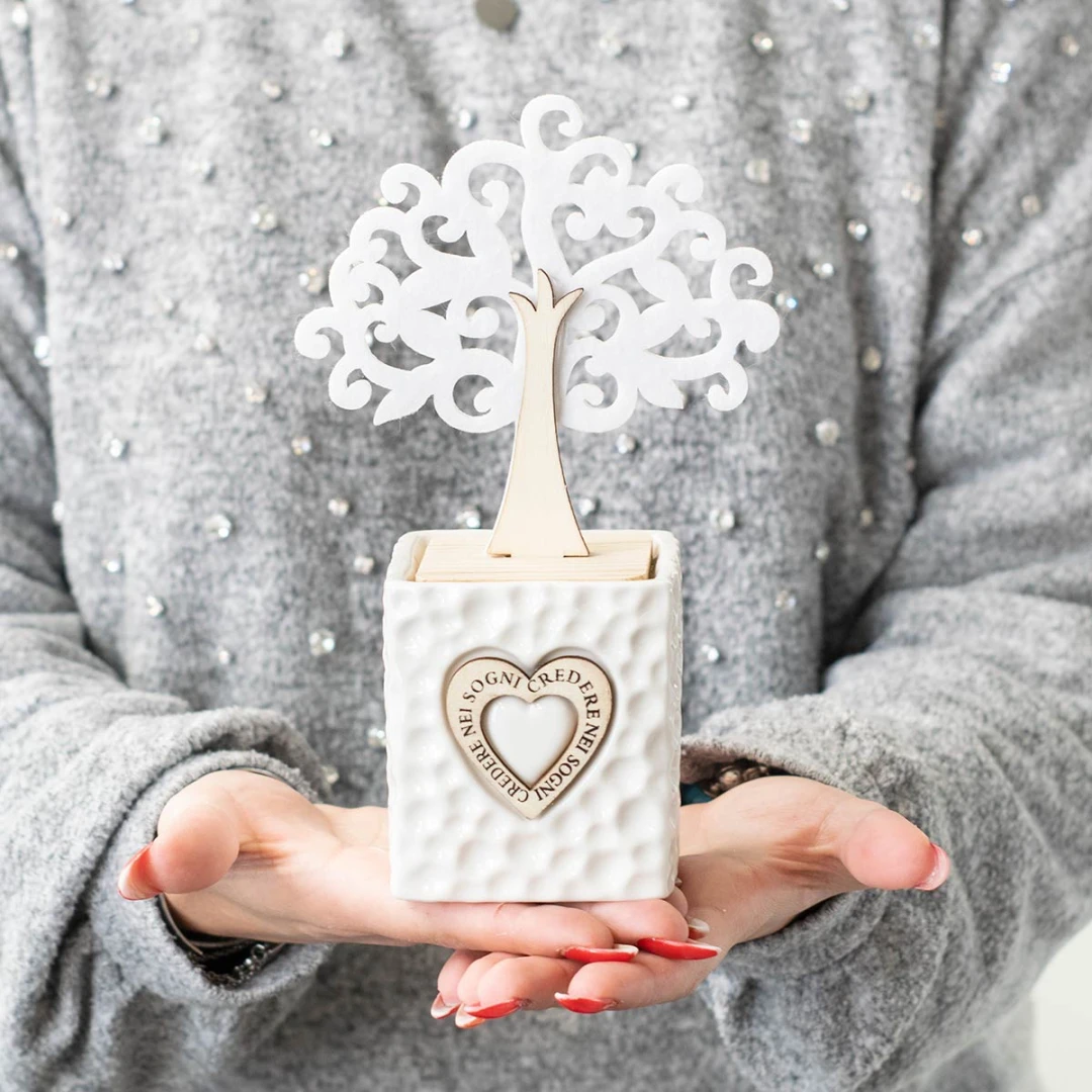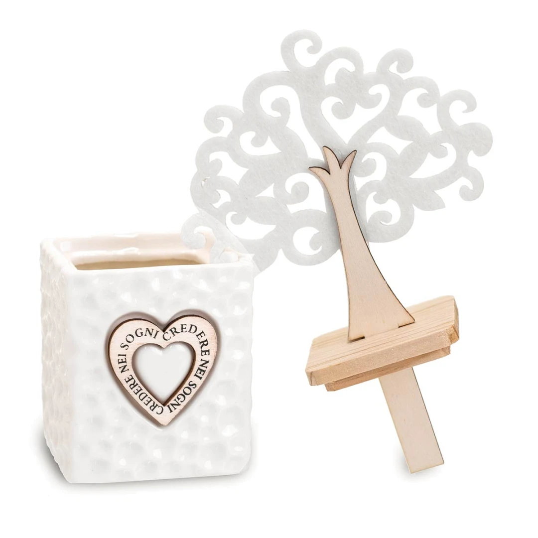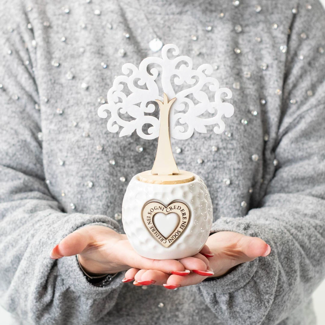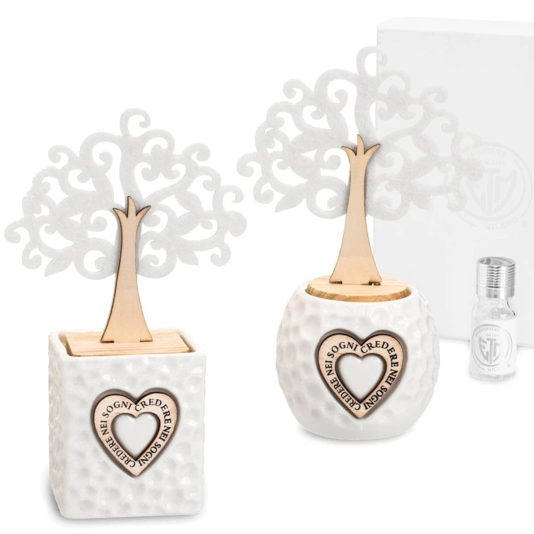 Linea di Bomboniere Utili in offerta stock, profumatori in ceramica con albero della vita in legno e feltro e cuore centrale con scritto "credere nei sogni", idea bomboniera originale ed utile , compreso di scatola fondo coperchio rigida e bottiglia profumo, misura 7x13x20 cm.