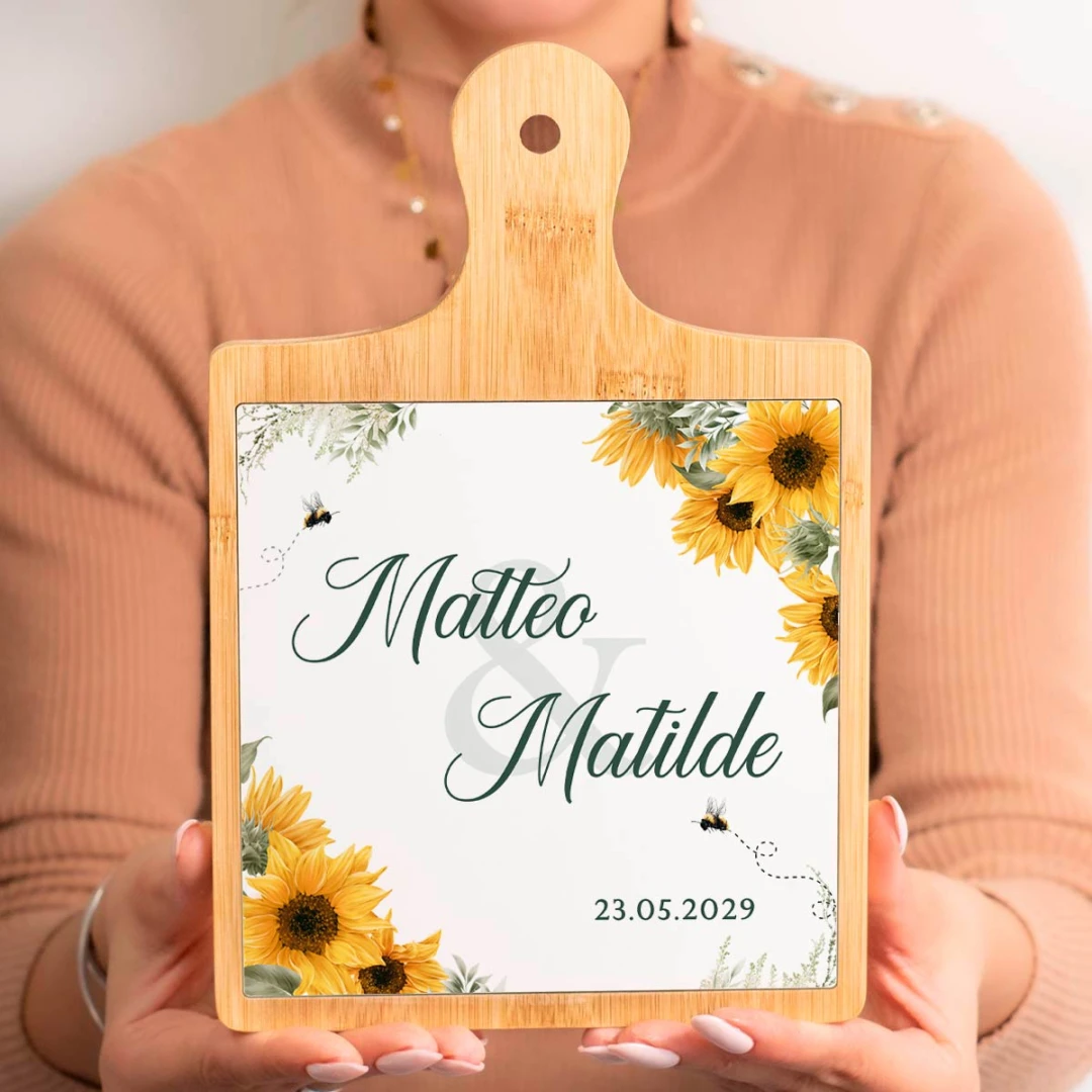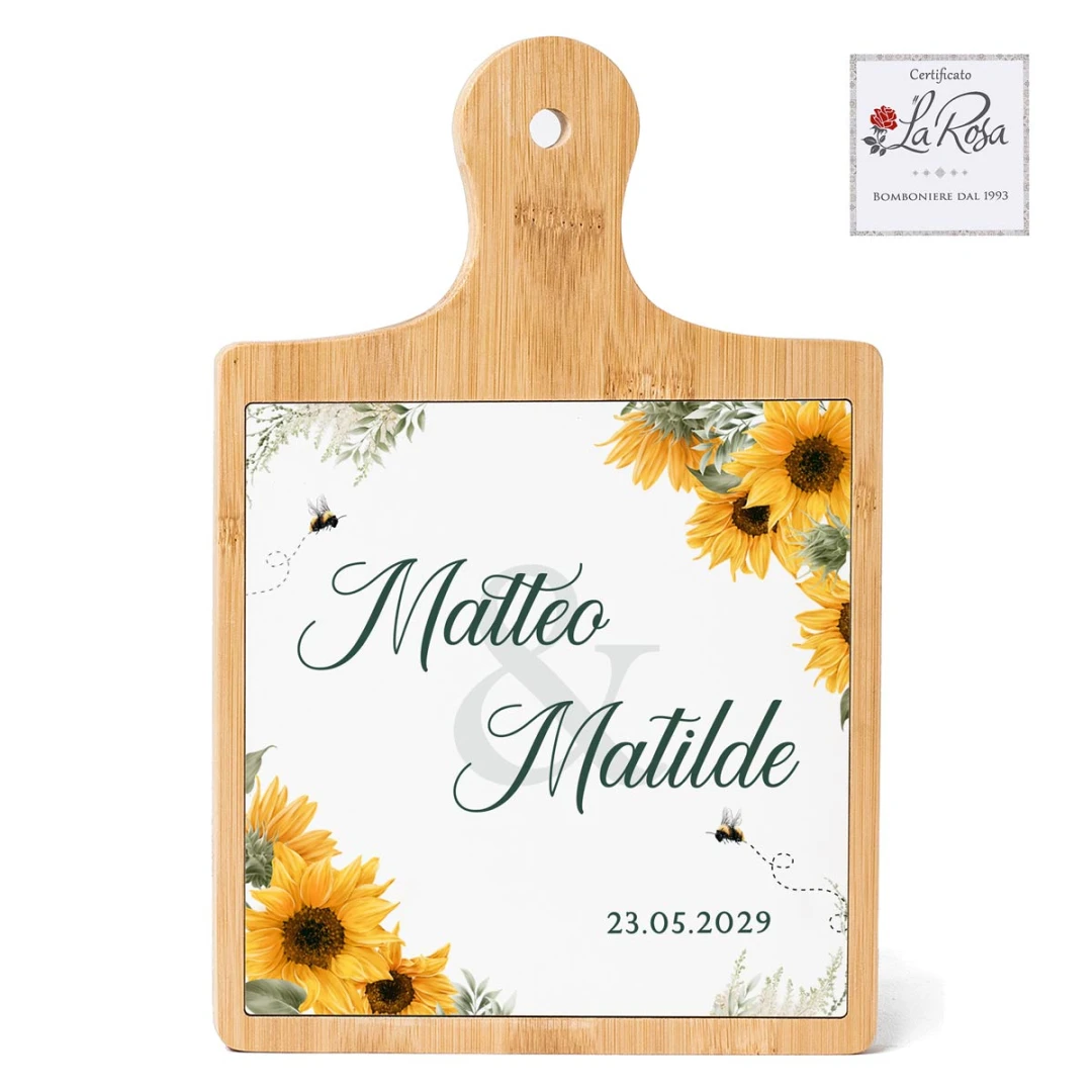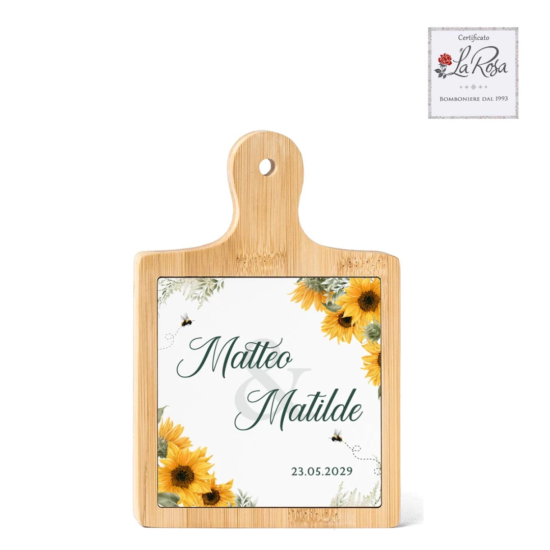 Bomboniere Tema Girasole Tagliere in legno con stampa personalizzata, bellissima idea come bomboniera originale ed utile.
