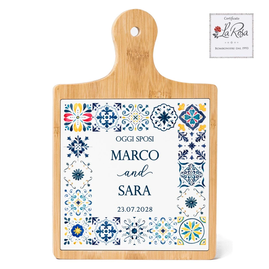 Bomboniere Tema Maioliche Tagliere in legno con stampa personalizzata, bellissima idea come bomboniera originale ed utile.