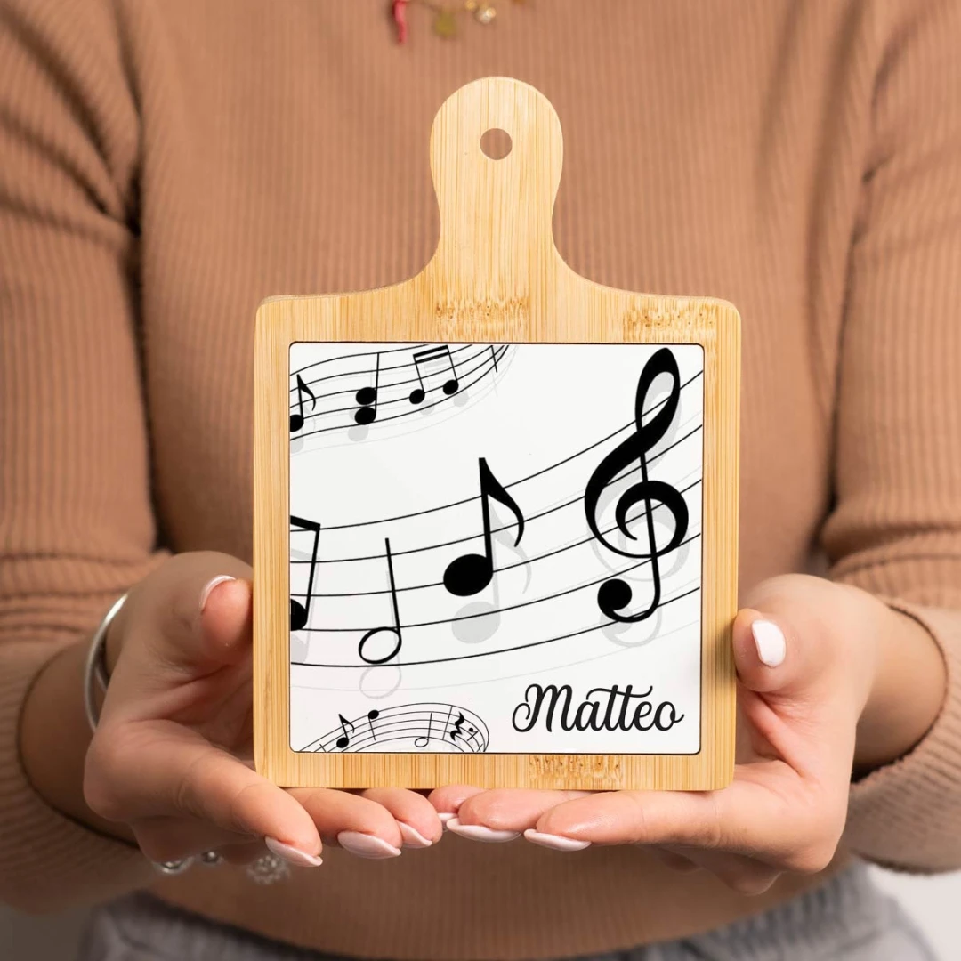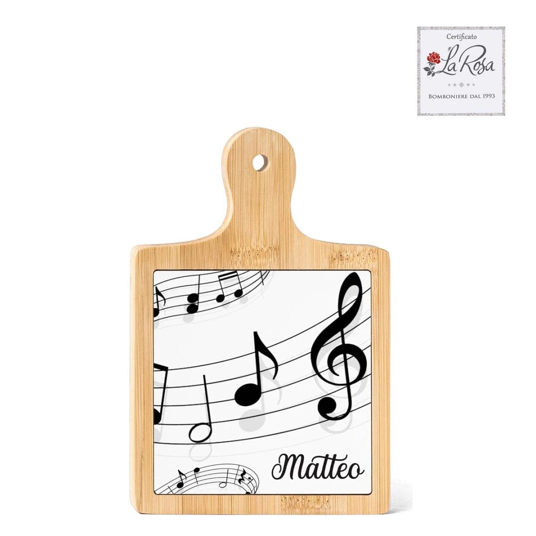 Bomboniere Tema Musica Tagliere in legno con stampa personalizzata, bellissima idea come bomboniera originale ed utile.