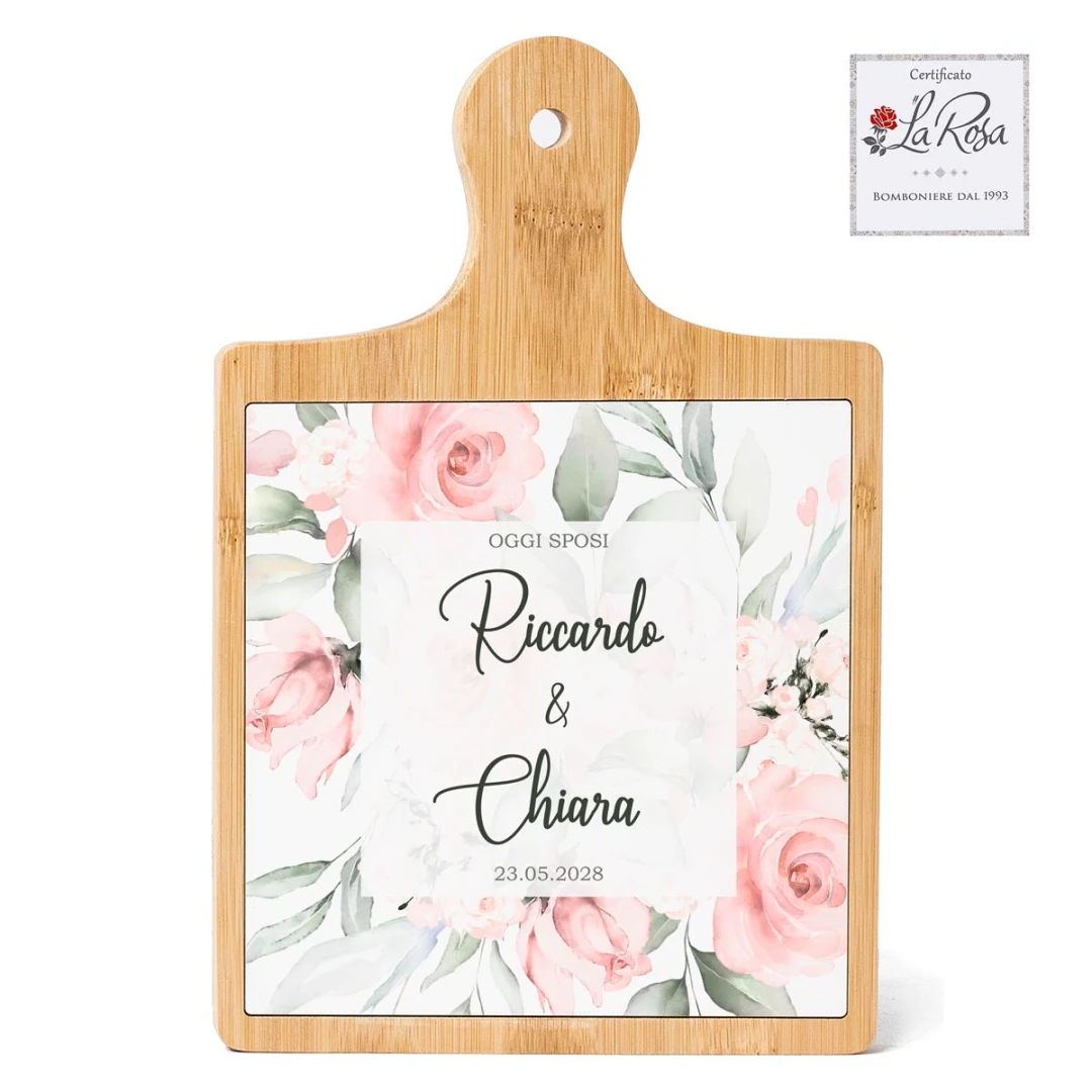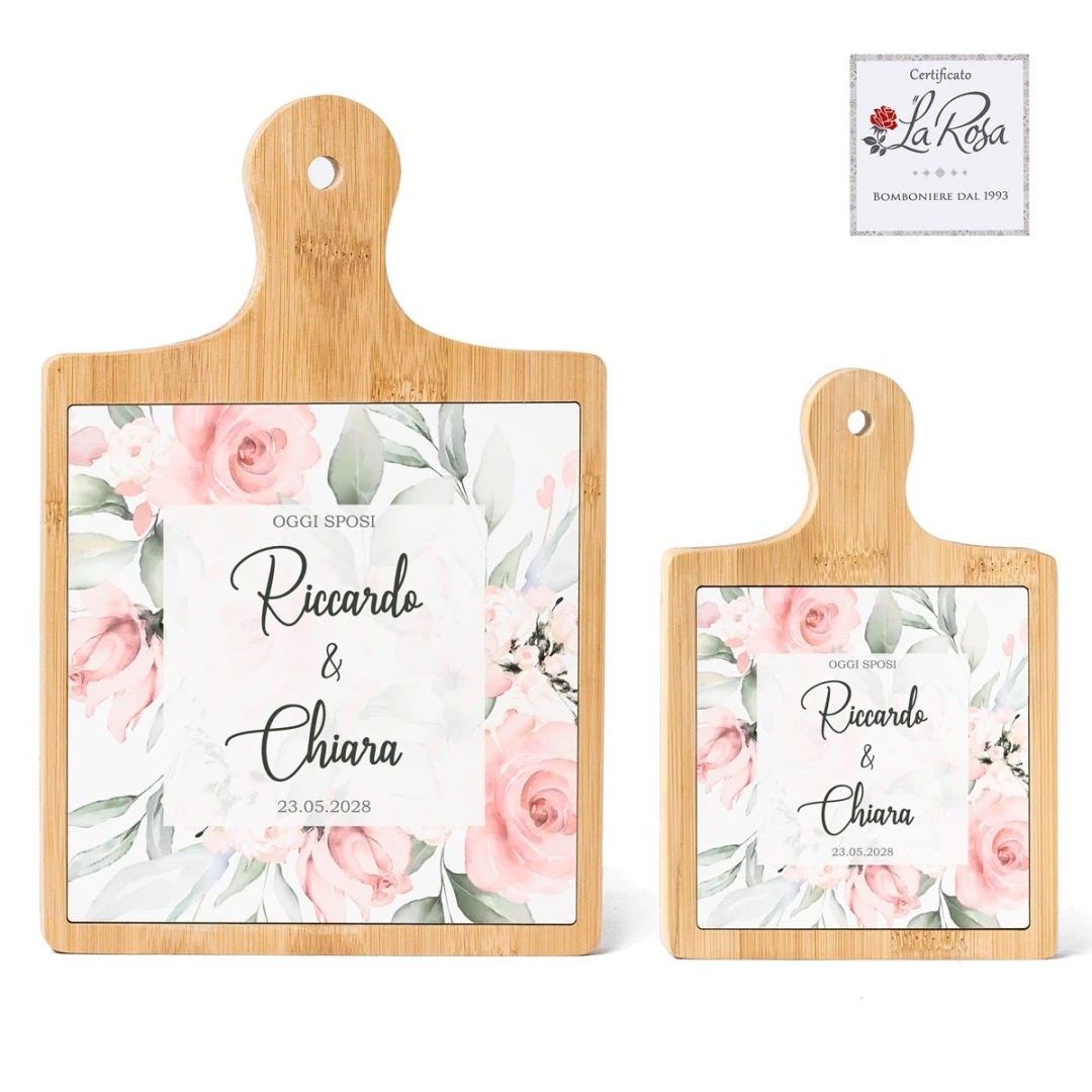 Bomboniere Tema Rose Tagliere in legno con stampa personalizzata, bellissima idea come bomboniera originale ed utile.