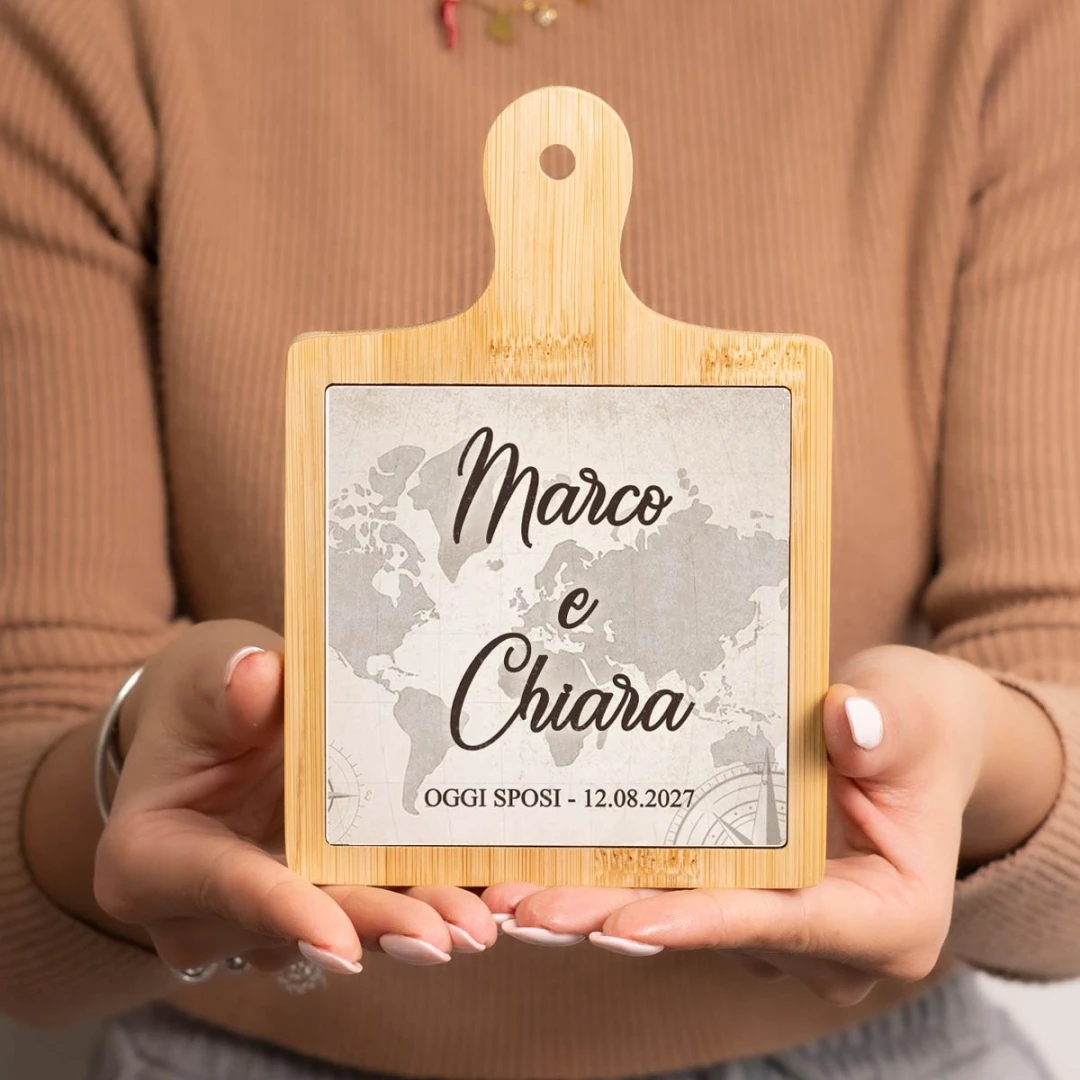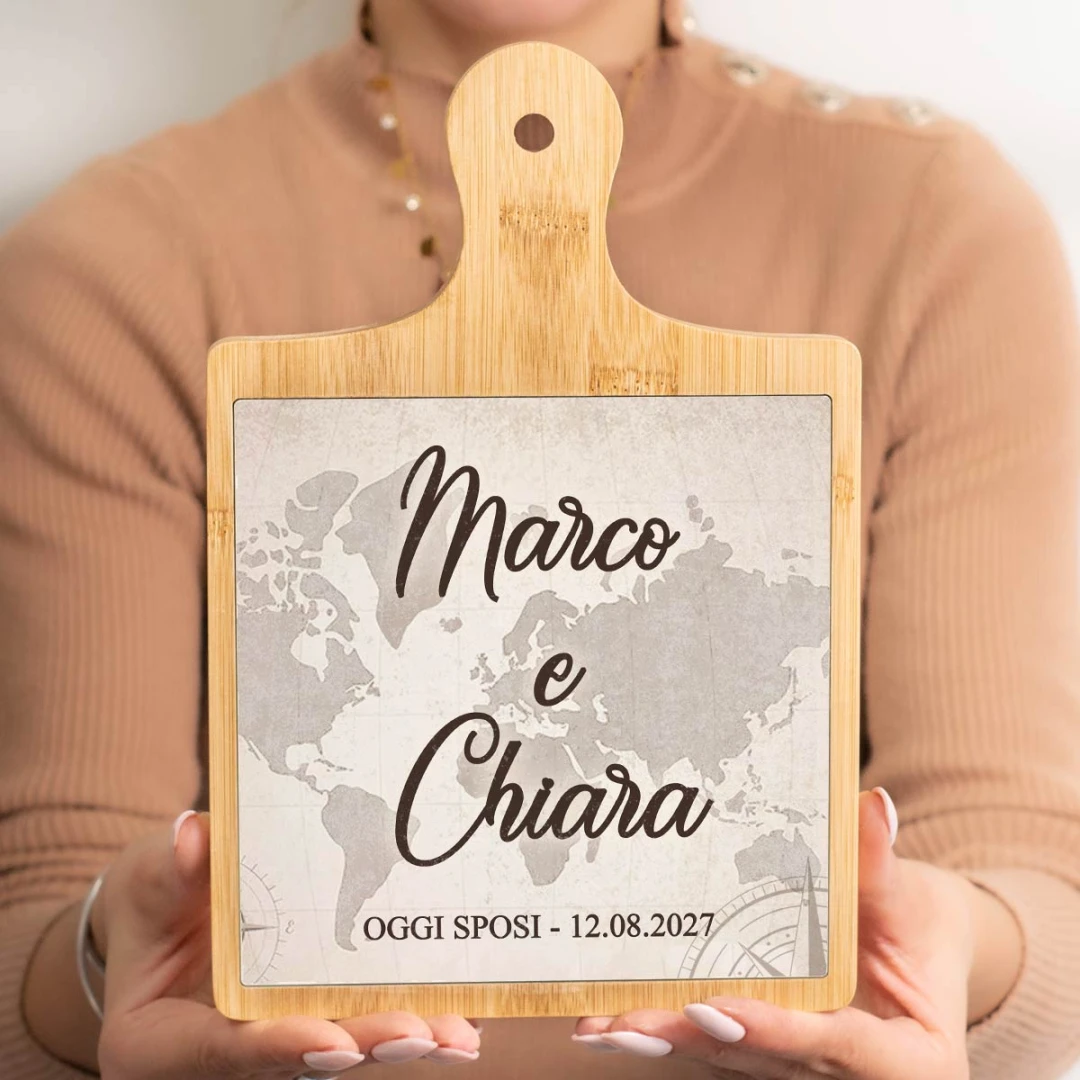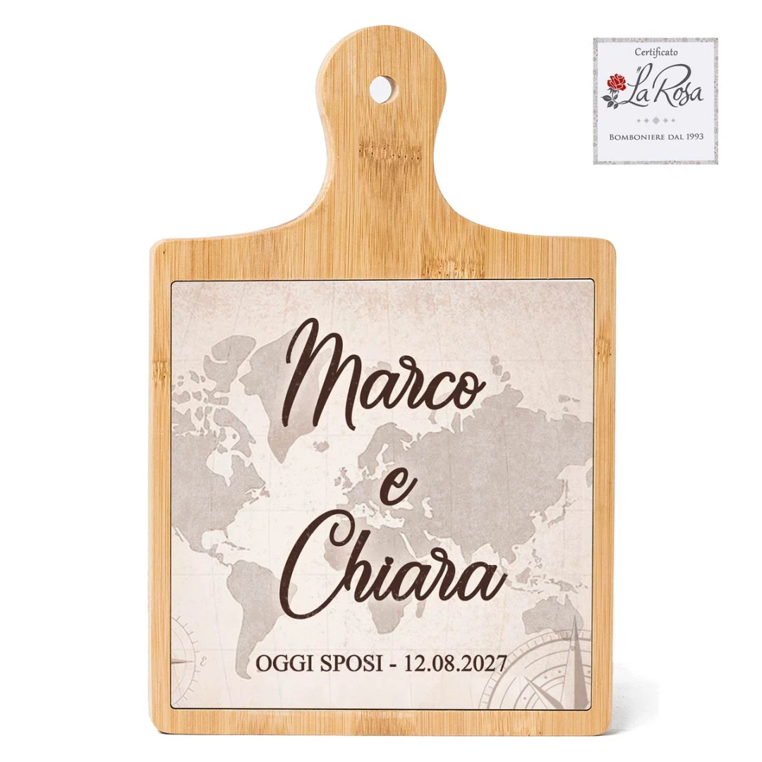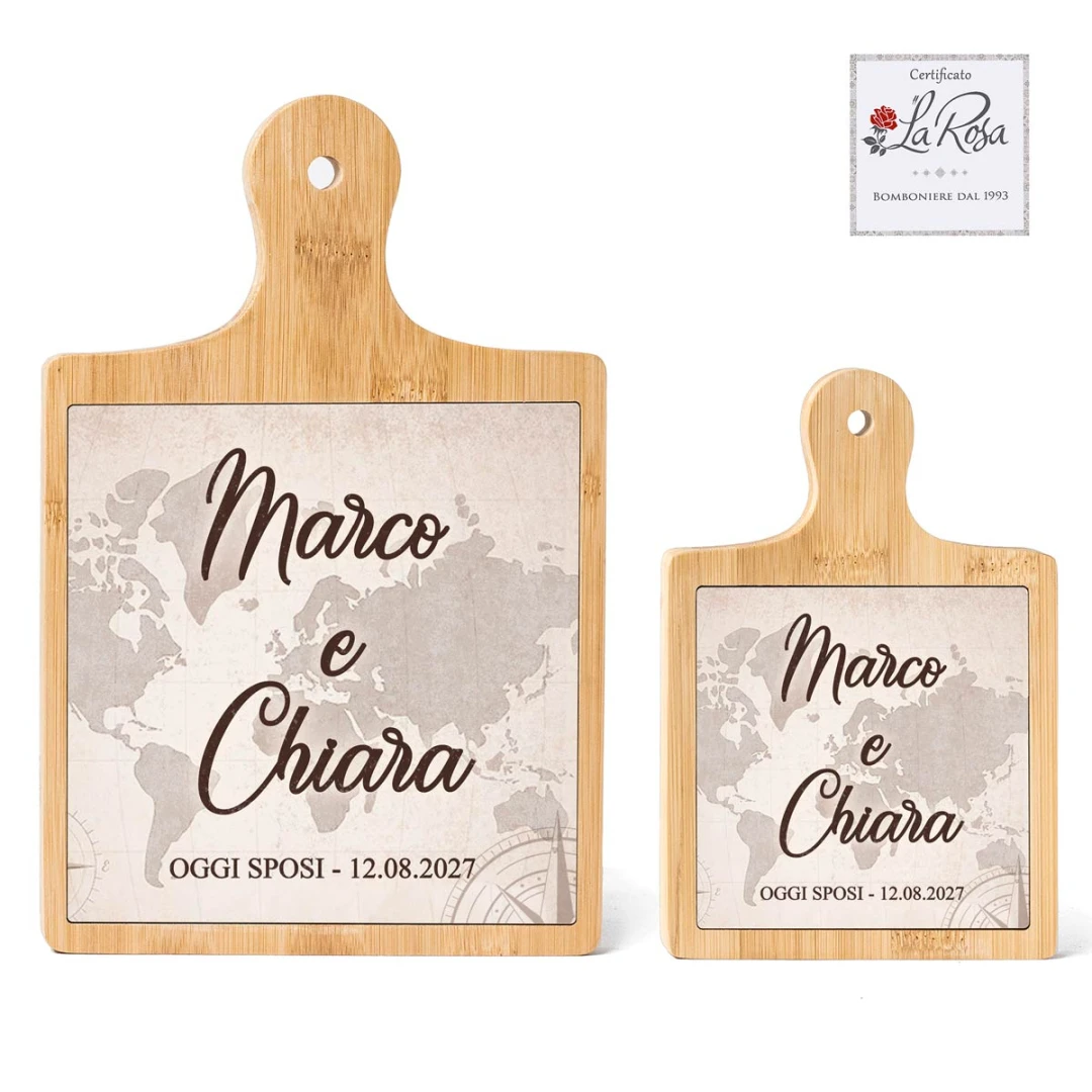 Bomboniere Tema Viaggio Tagliere in legno con stampa personalizzata, bellissima idea come bomboniera originale ed utile.