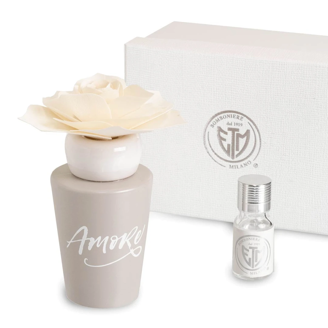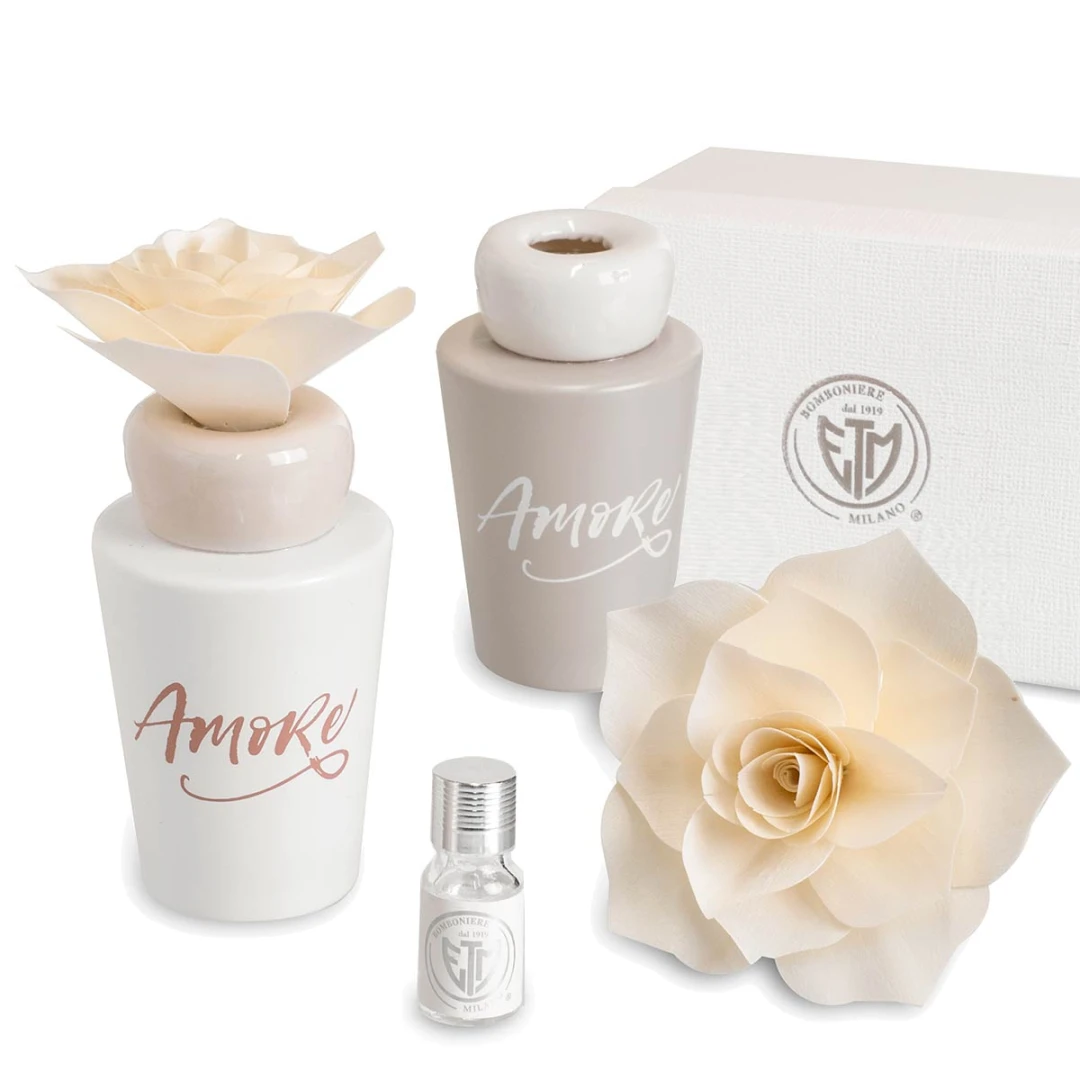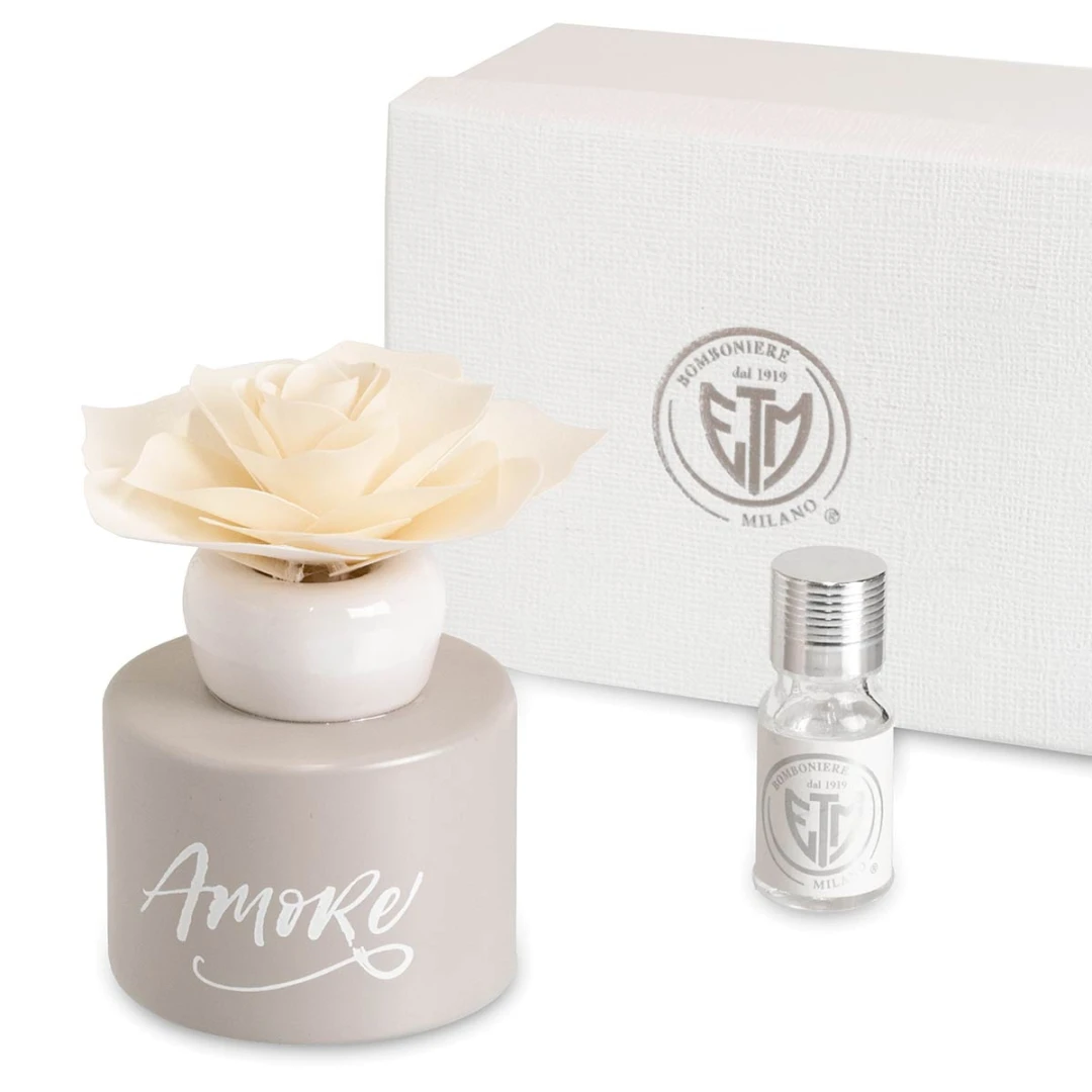 Linea di Bomboniere UTILI 2026, profumatori in ceramica con rosa in foglia di legno e scritta davanti "amore", idea bomboniera originale ed utile, arriva misto nei 2 colori, compreso di scatola fondo coperchio e bottiglia profumo, scegli tra basso 11 cm e alto 14 cm