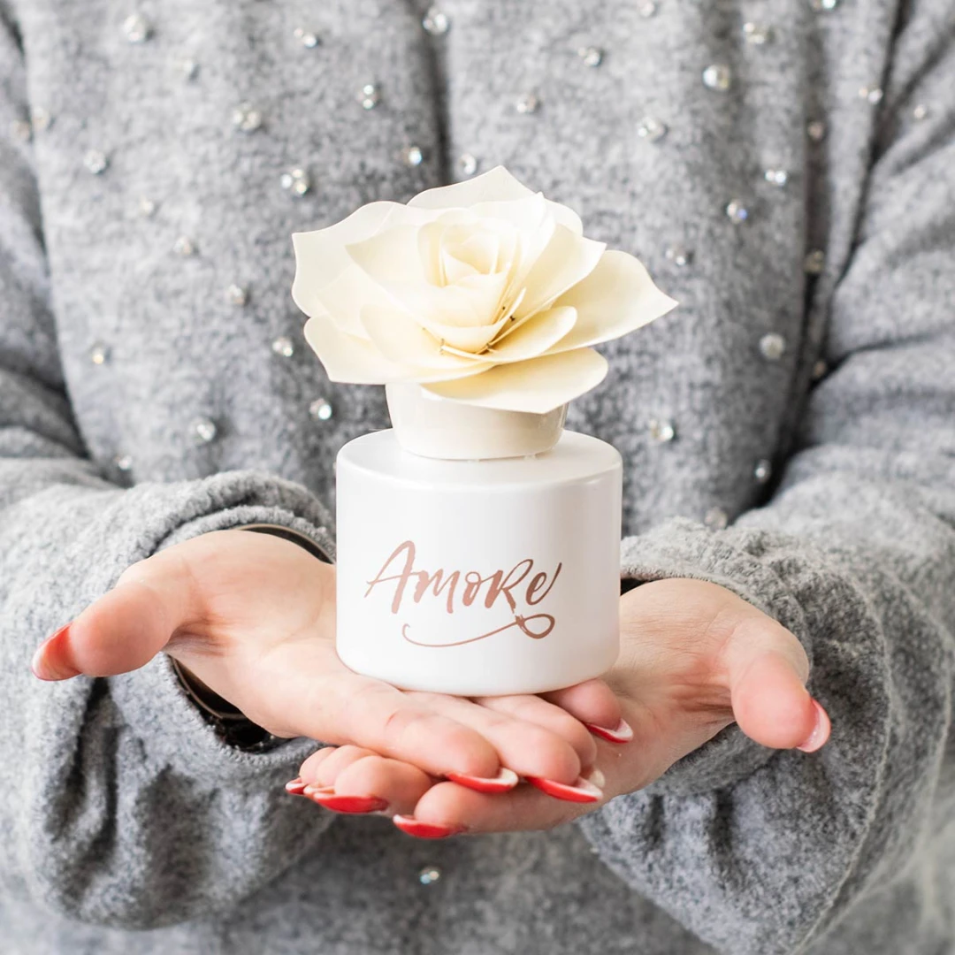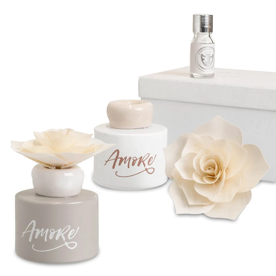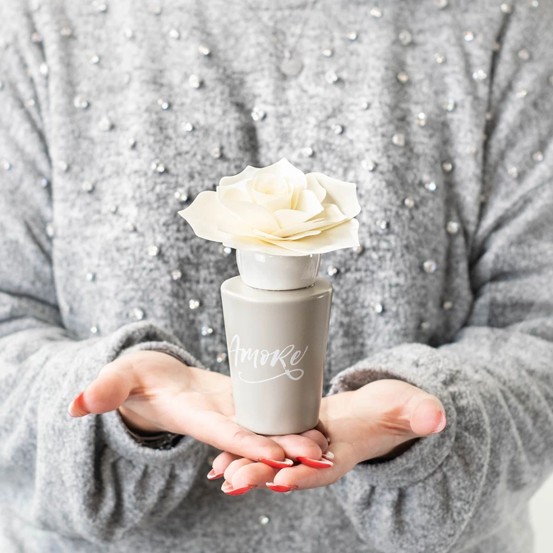 Linea di Bomboniere UTILI 2026, profumatori in ceramica con rosa in foglia di legno e scritta davanti "amore", idea bomboniera originale ed utile, arriva misto nei 2 colori, compreso di scatola fondo coperchio e bottiglia profumo, scegli tra basso 11 cm e alto 14 cm
