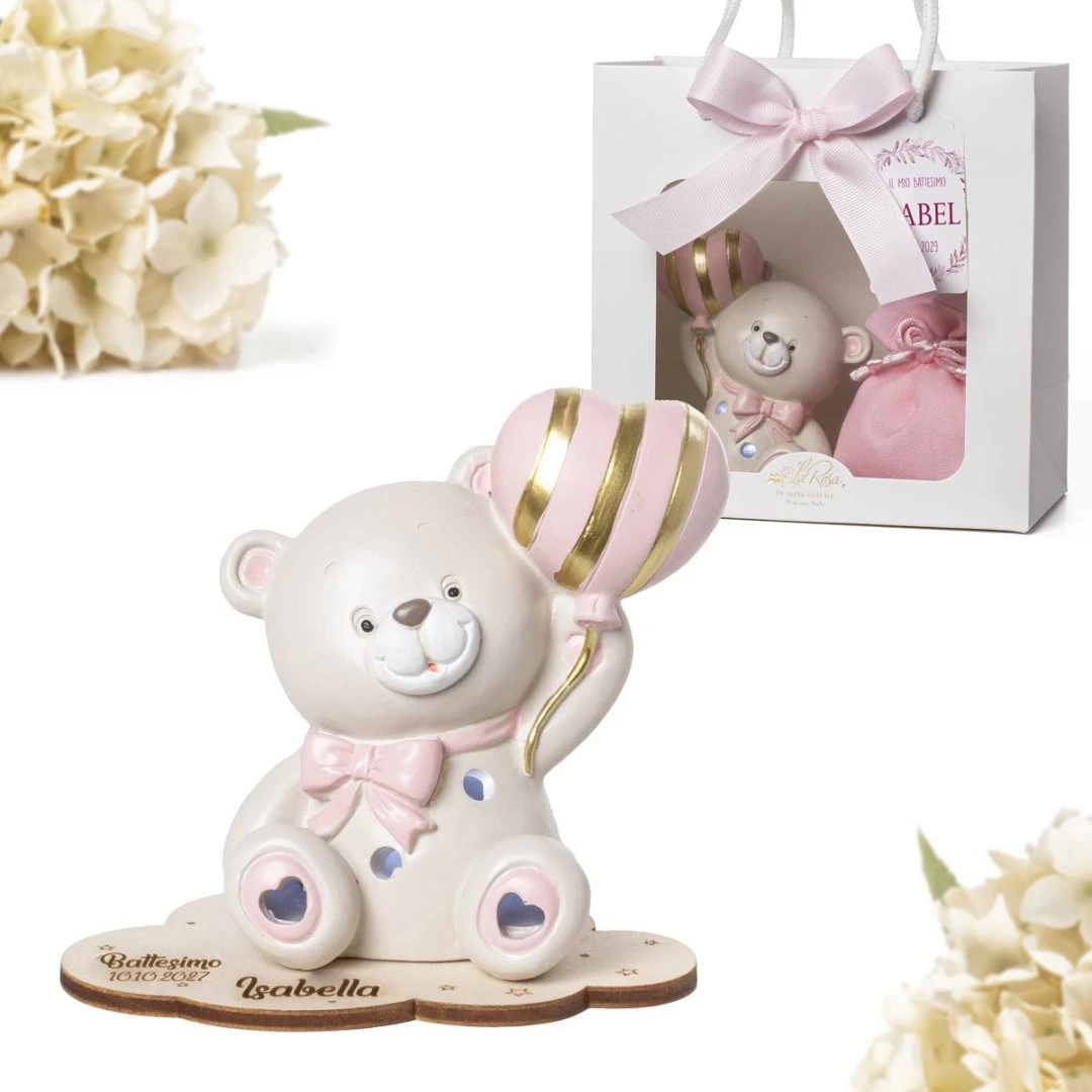 La Collezione PUPO è pensata per chi vuole una bomboniera che faccia tenerezza subito e resti nel tempo: un orsetto in resina dalle linee morbide, con palloncino a cuore rosa pastello attraversato da eleganti riflessi dorati, fiocchetto delicato e dettagli curati che dal vivo si notano ancora di più. Nella versione LED la luce crea un’atmosfera dolcissima, perfetta per cameretta o angolo ricordi.
