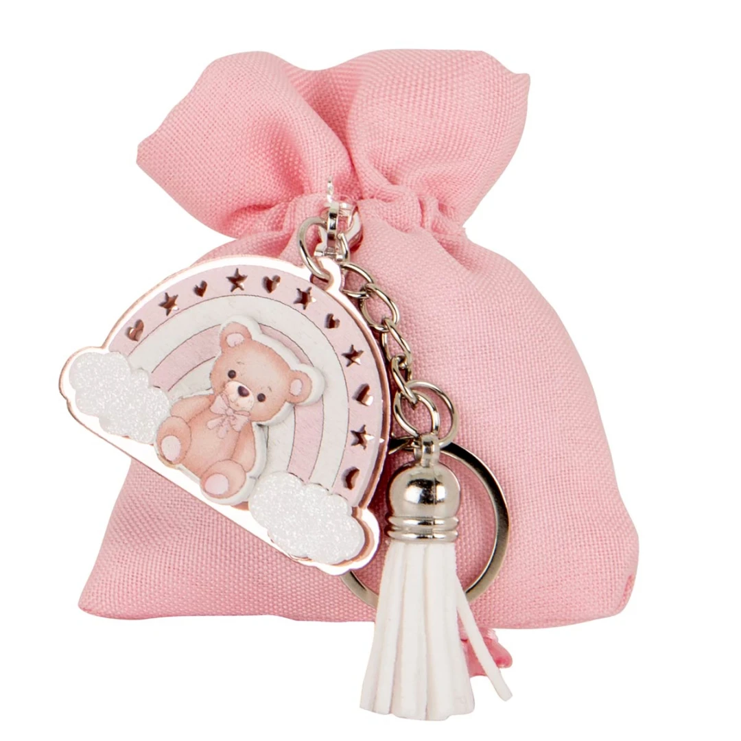 Bomboniere Battesimo e Nascita Bimba, Linea Baleno, Portachiavi in legno e plexiglass sulle tonalità del rosa con orsetto su arcobaleno con nuvole colorate con nappina bianca e sacchettino portaconfetti rosa. Prezzo cadauno. Prodotto Artigianale. Misura sacchettino: 9 x 8 cm | Misura portachiavi: 9 x 5 cm.