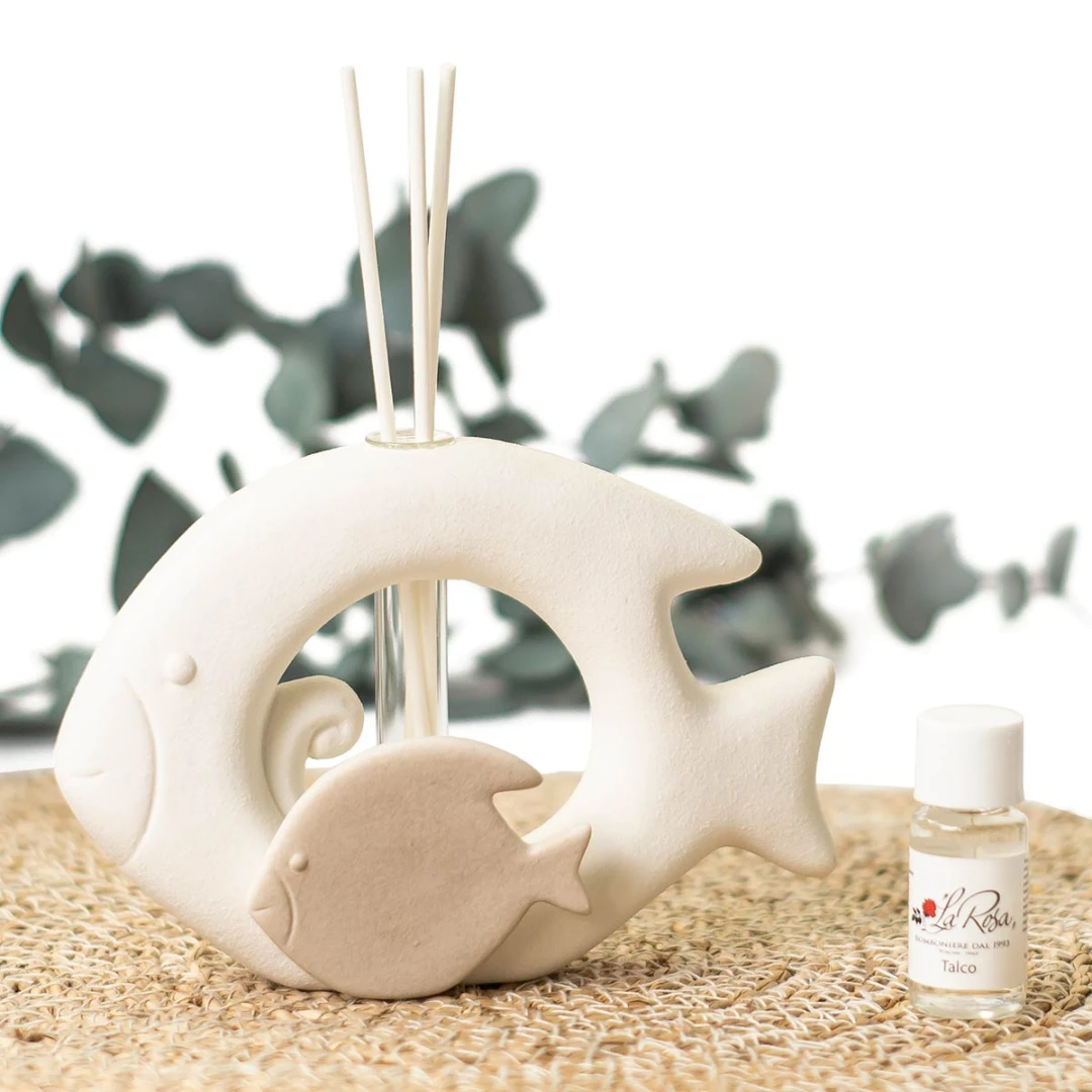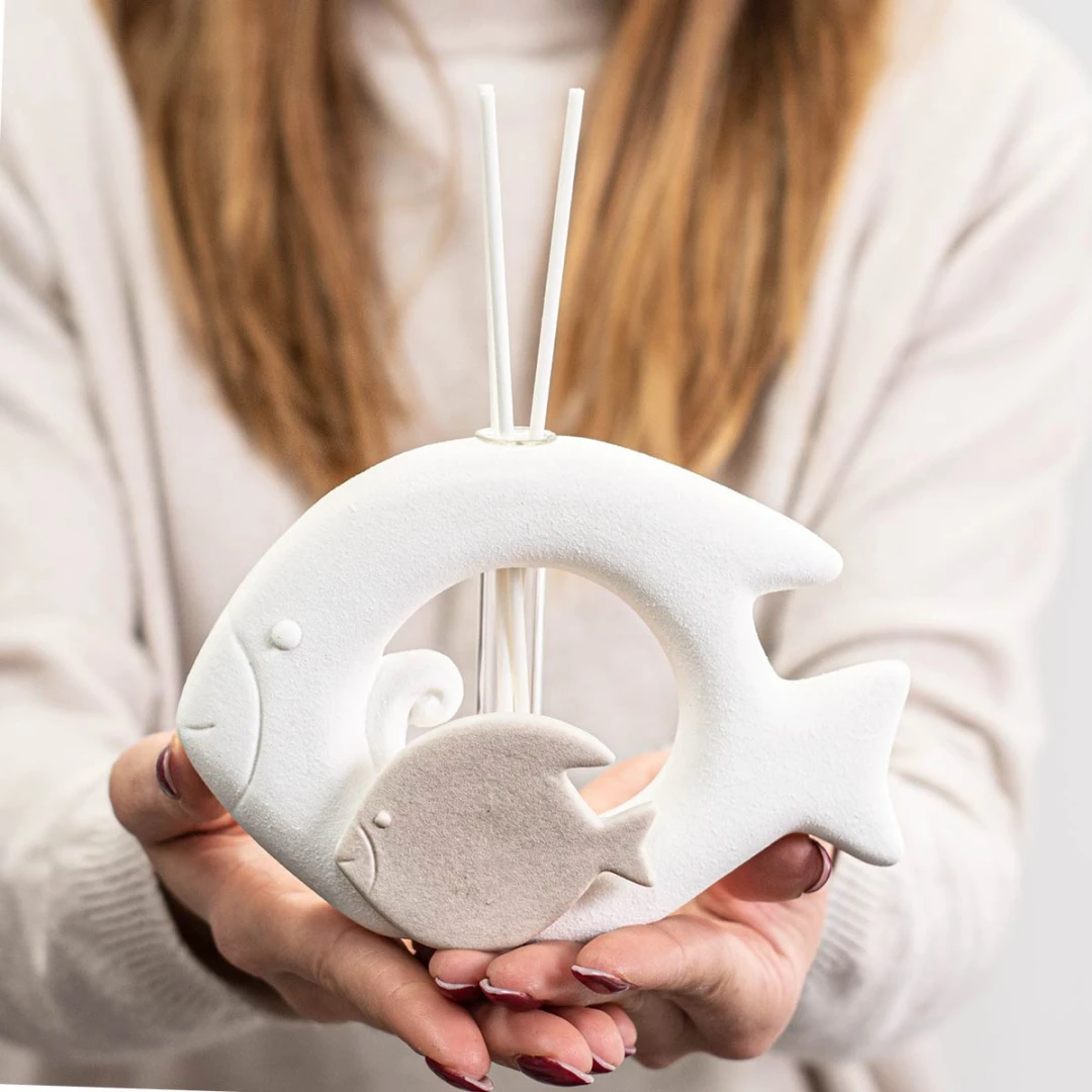 Bellissime Bomboniere Tema Mare, Profumatore con Pesciolini in ceramica. Disponibili due versioni. Arriva incluso di bacchette e profumo. Prezzo cadauno. Prodotto Artigianale. Misura: 15,5 x 4,5 cm | h 10,5 cm. Altezza con bacchette: 18 cm. Il TAG è incluso solo nella confezione.