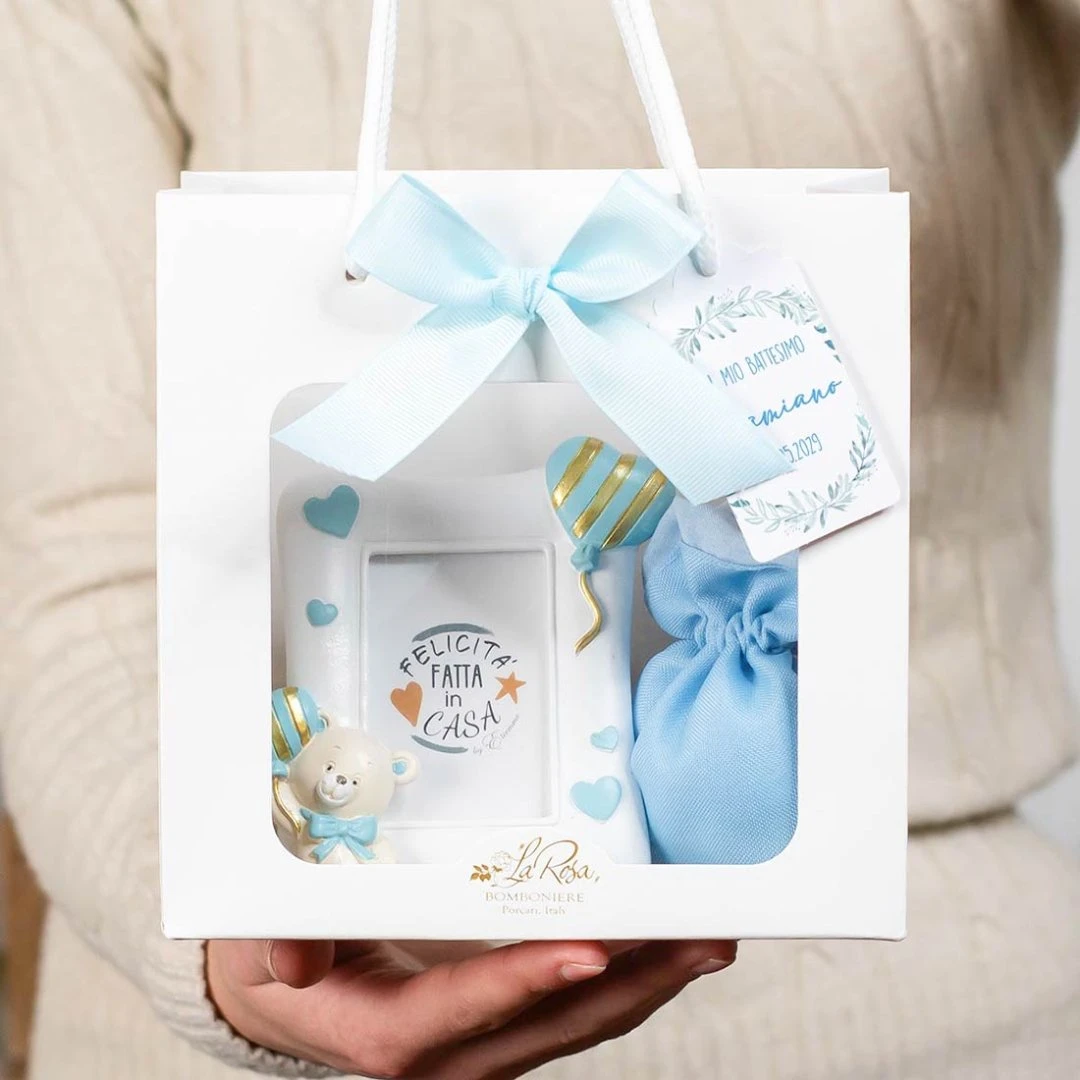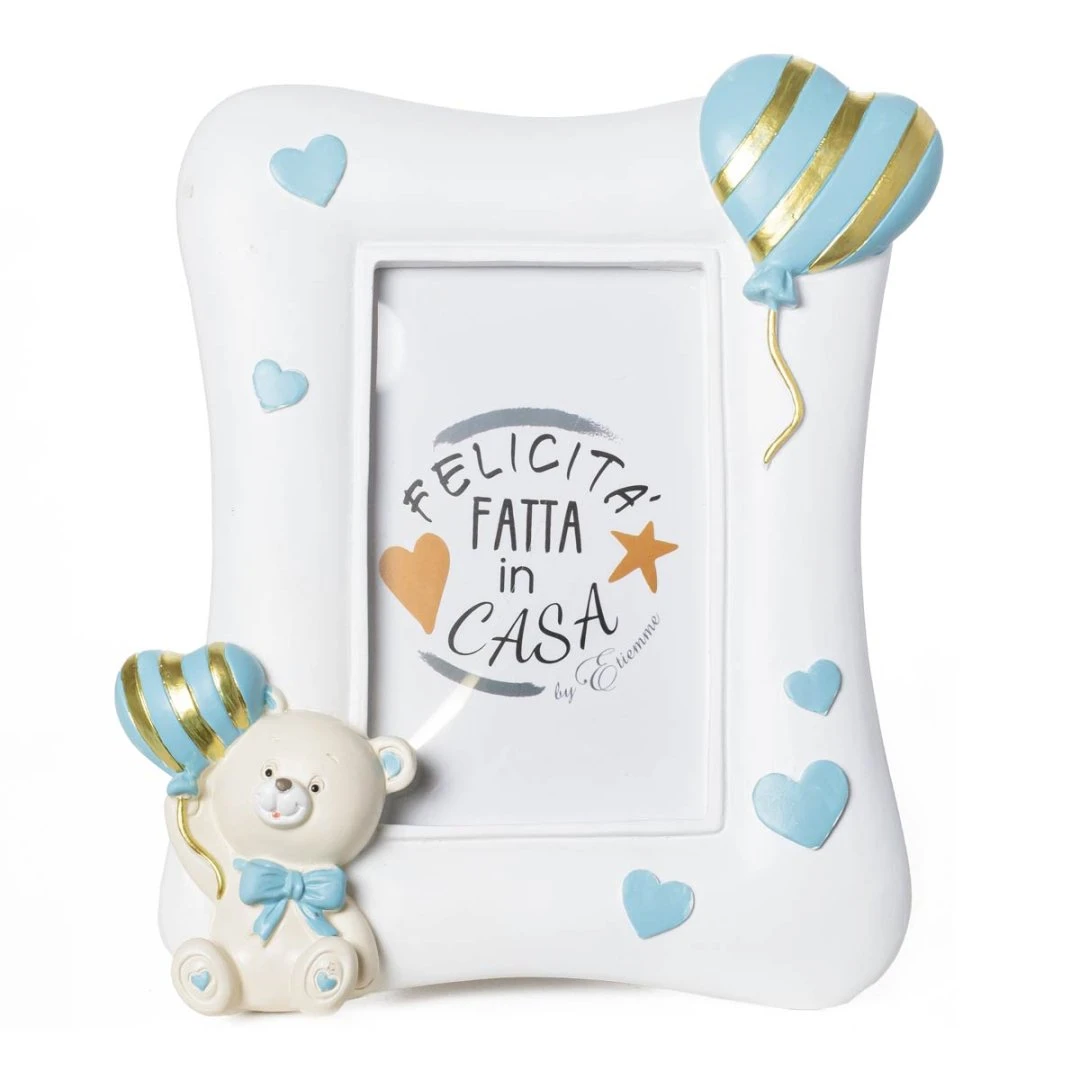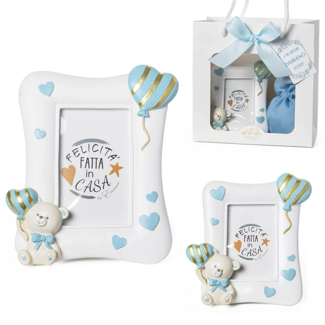 Bomboniera 2026 Battesimo e Nascita Maschio Portafoto Orsetto PUPO in Resina Celeste