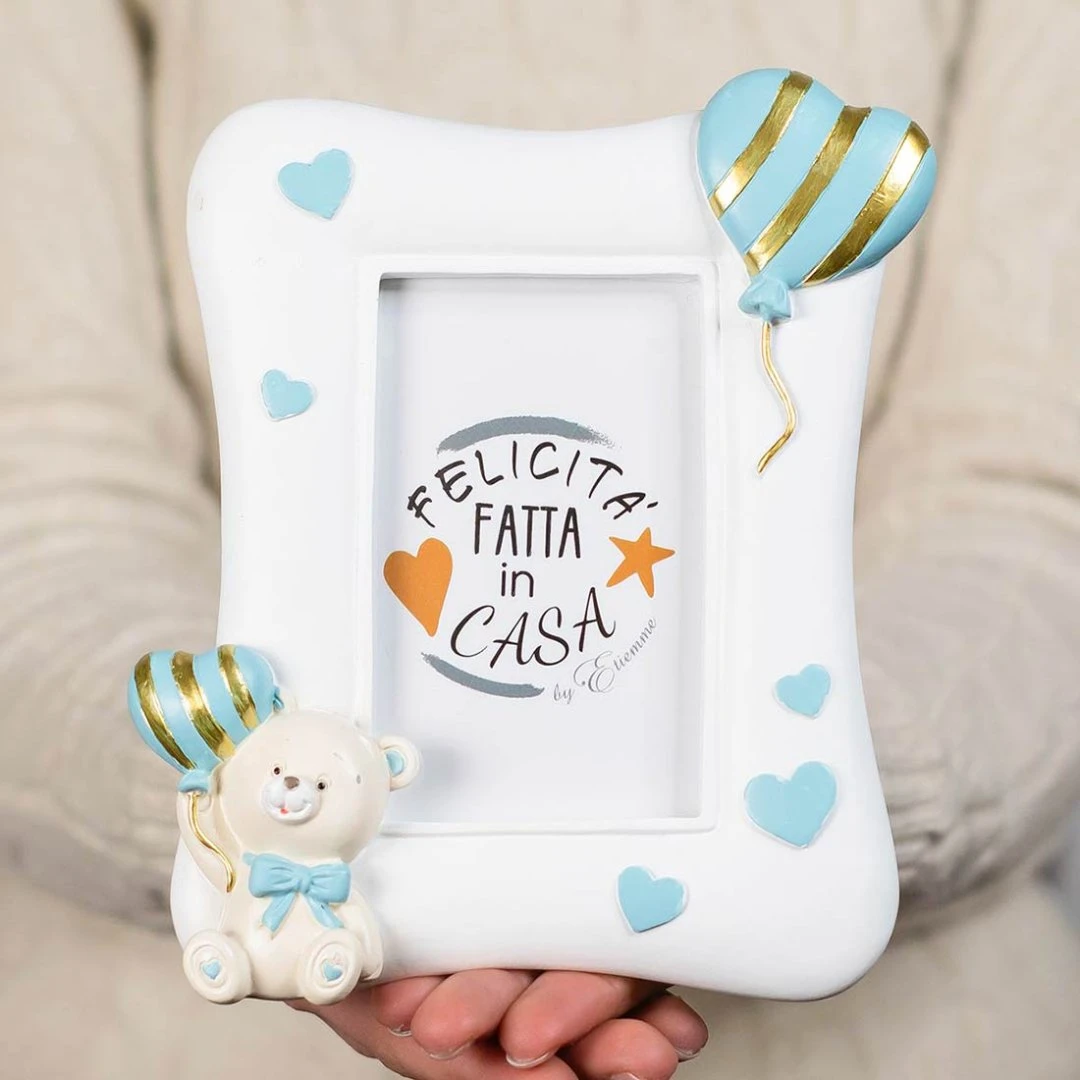 La Collezione PUPO veste i ricordi più belli con una dolcezza elegante: un portafoto in resina dalla cornice morbida e ondulata, decorata con piccoli cuori e un orsetto che stringe un palloncino a cuore in celeste pastello, con dettagli dorati che catturano la luce. Dal vivo è ancora più delicato: superfici lisce, colori chiari e quel tocco “baby chic” che sta bene in cameretta ma anche su una mensola in casa.
