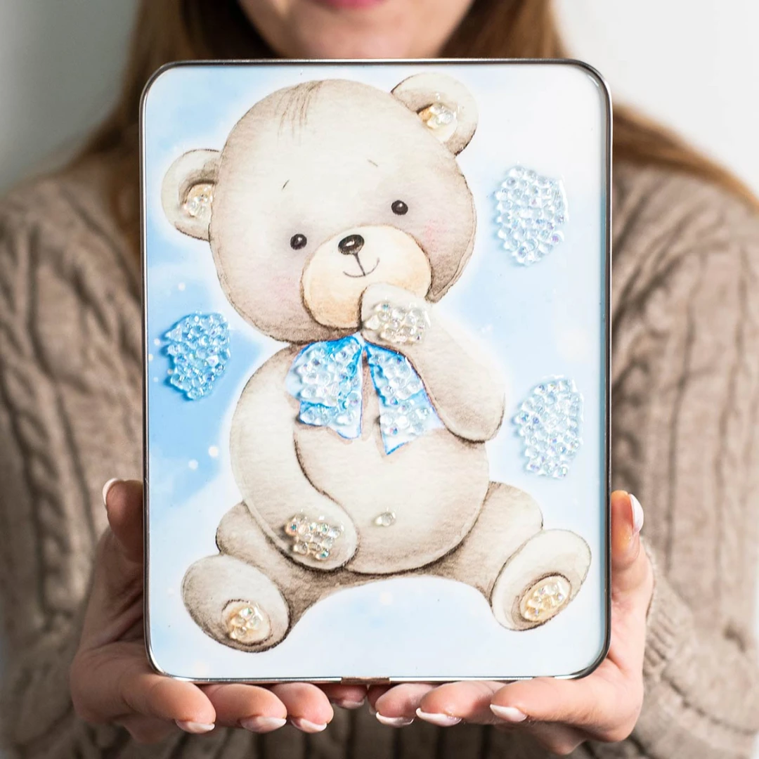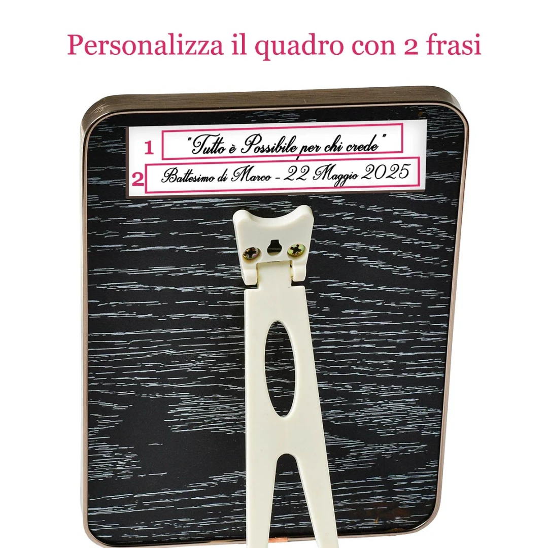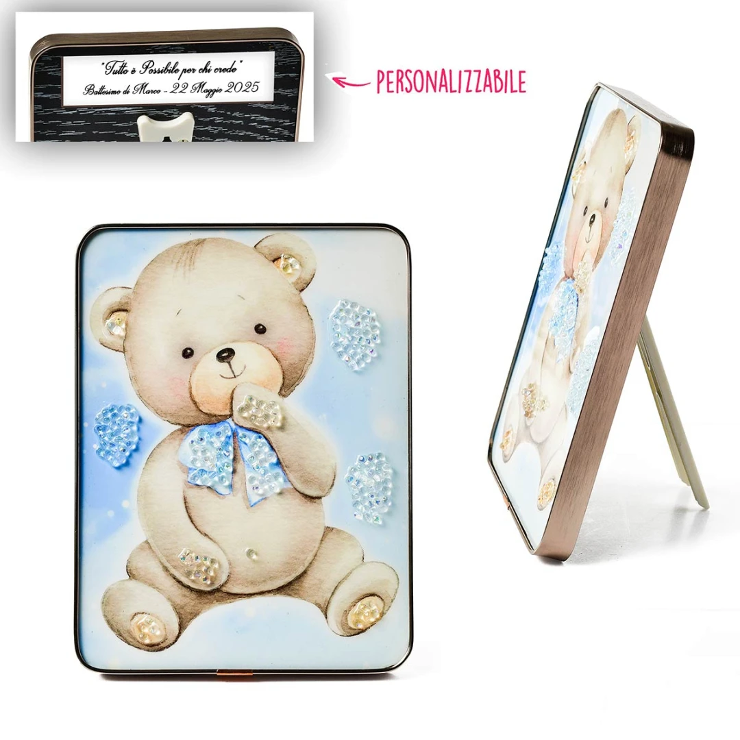 Bellissime Bomboniere 2026 Linea STONE Quadro da appoggio orsetto con effetto pietra luminosa brillante e dettagli in celeste, ideale per battesimo o nascita bimbo, misura: 15 x 20 cm. Inoltre, è possibile aggiungere un incisione personalizzata.