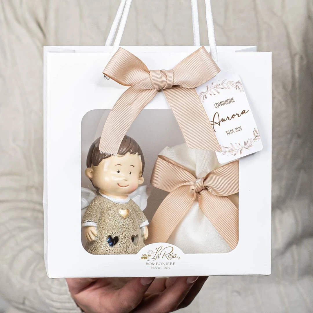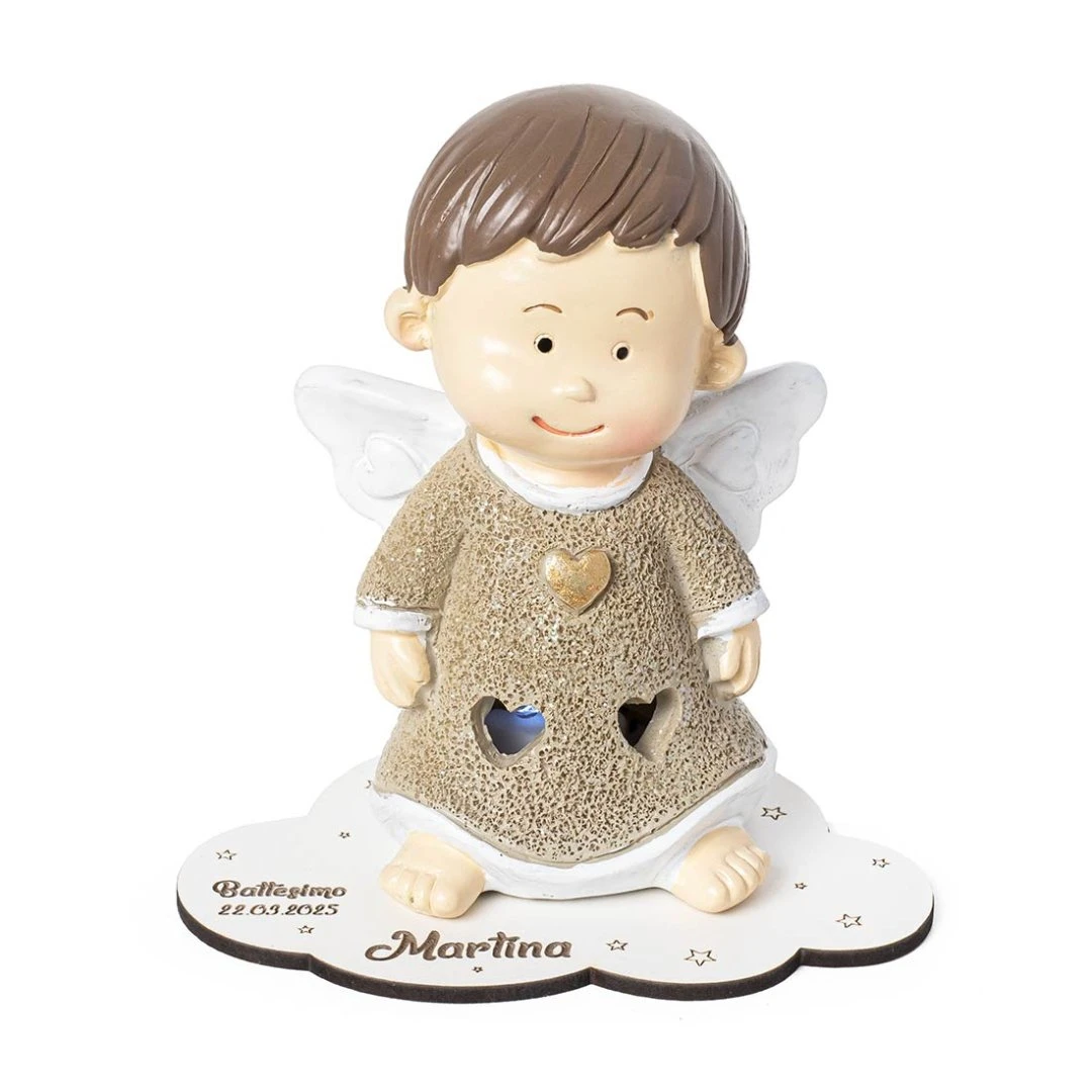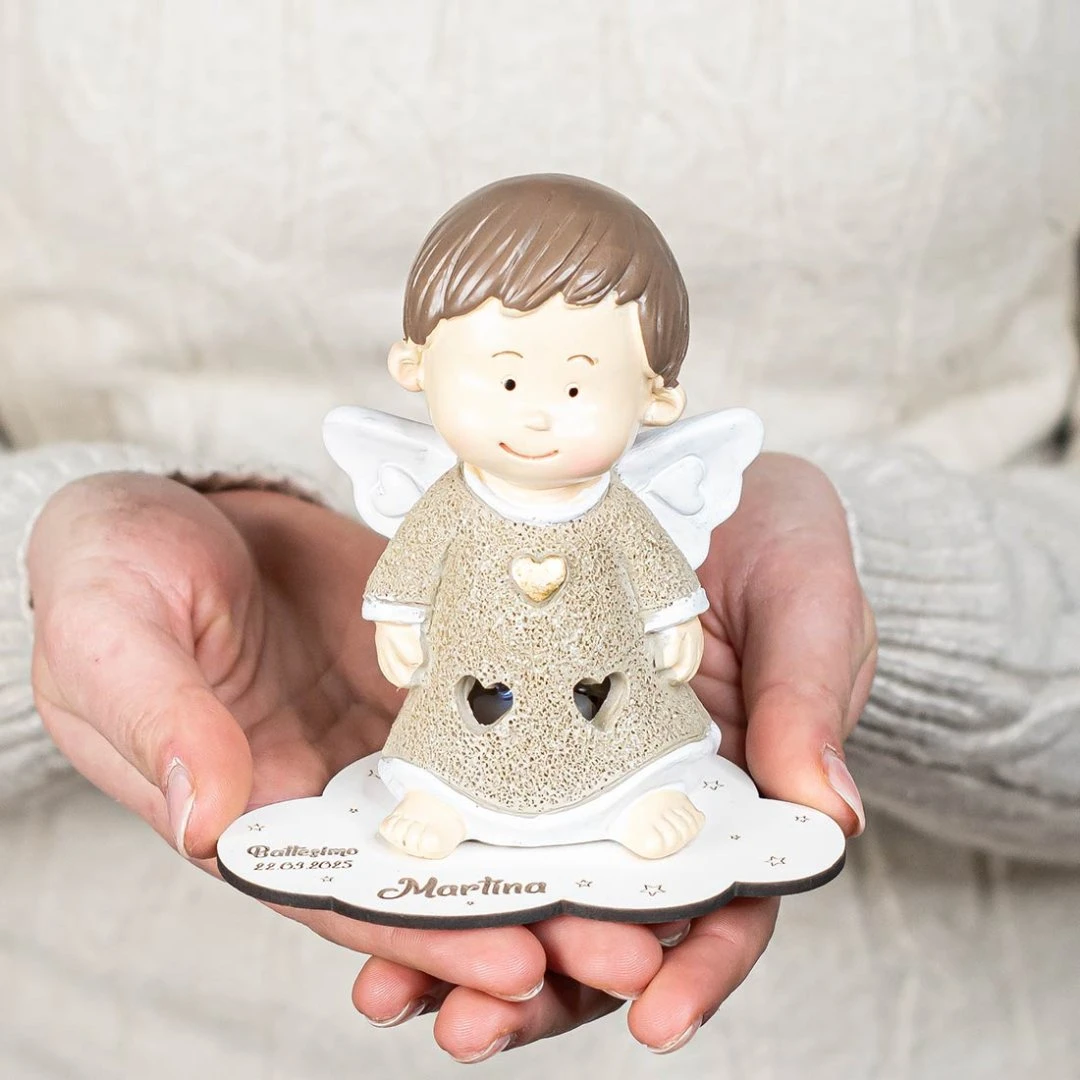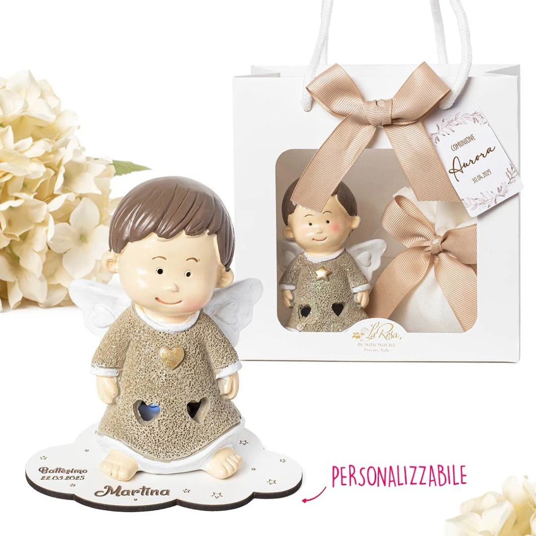 La Collezione ENERGY racconta la festa con un gesto semplice: un angelo luminoso in resina che diffonde una luce calda e delicata, perfetta da tenere in cameretta o su una mensola come ricordo quotidiano. Il vestitino glitterato, le aperture a cuoricino e i dettagli dorati (cuore o stellina) rendono la bomboniera raffinata e piena di significato.Prodotto Artigianale. Prezzo cadauno. Misura: 7,5 x 5 cm | h 10,5 cm. Misura con base incisa: 11,3 x 7,5 cm | h 11 cm.