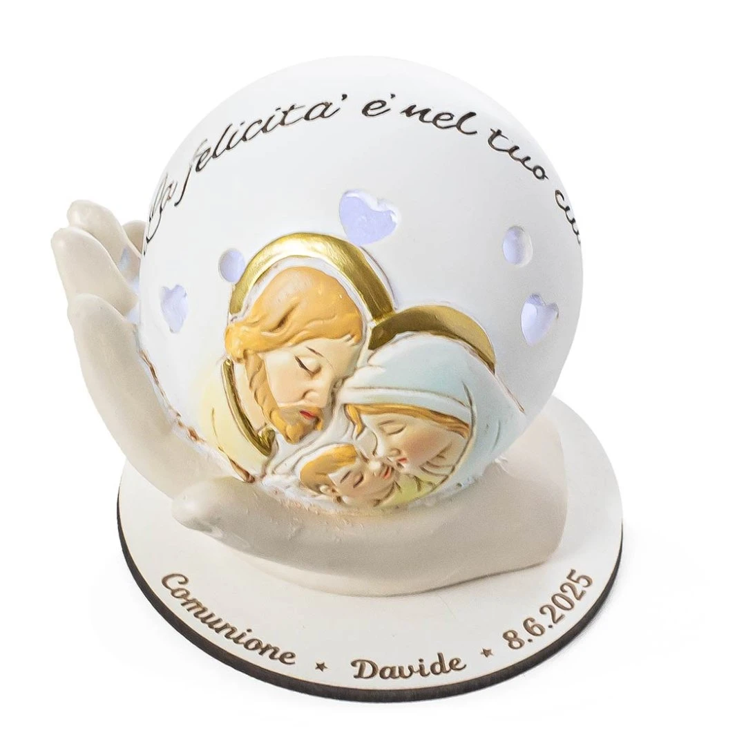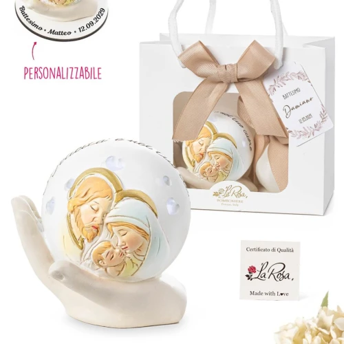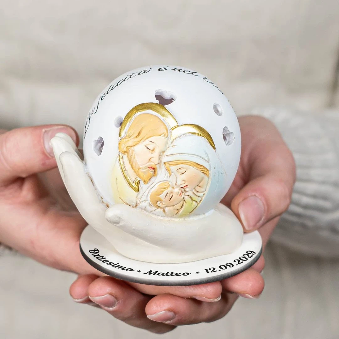 La Collezione RAGGIO Sacra Famiglia è pensata per lasciare un ricordo che resta acceso nel tempo: una sfera decorata con icona appoggiata su una mano, realizzata in resina e illuminata da luce LED delicata. Un’idea bomboniera adatta a Comunione, Cresima, Battesimo Femmina e Maschio ed altre occasioni speciali, perché unisce significato e atmosfera in un oggetto da tenere in casa. Misura: 5,5 x 7 cm | h 7 cm. Prodotto Artigianale. Prezzo cadauno.