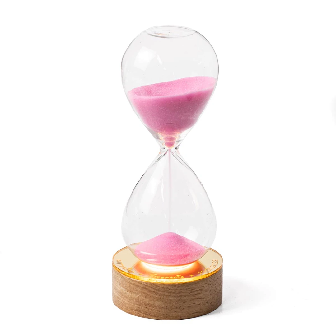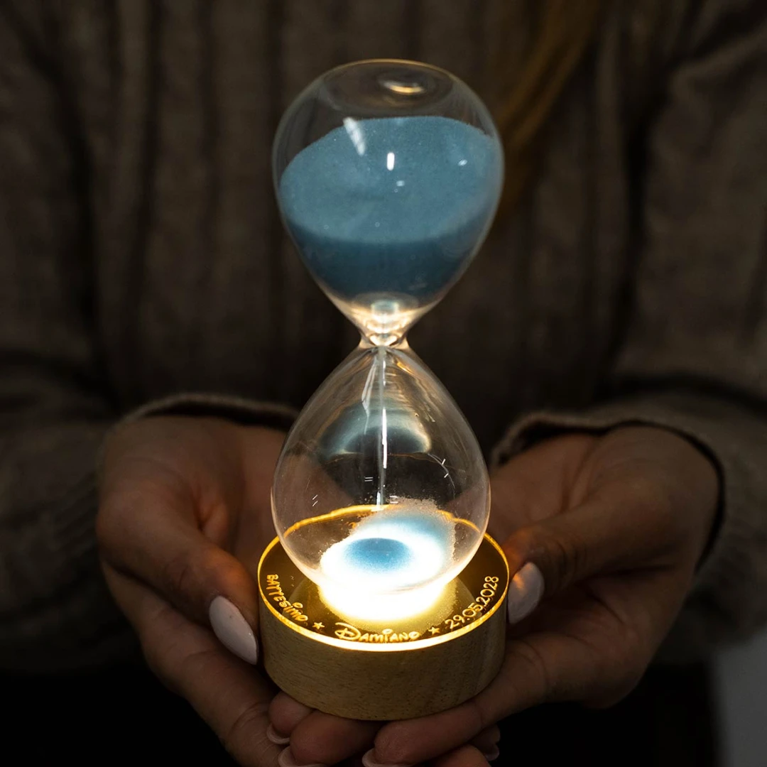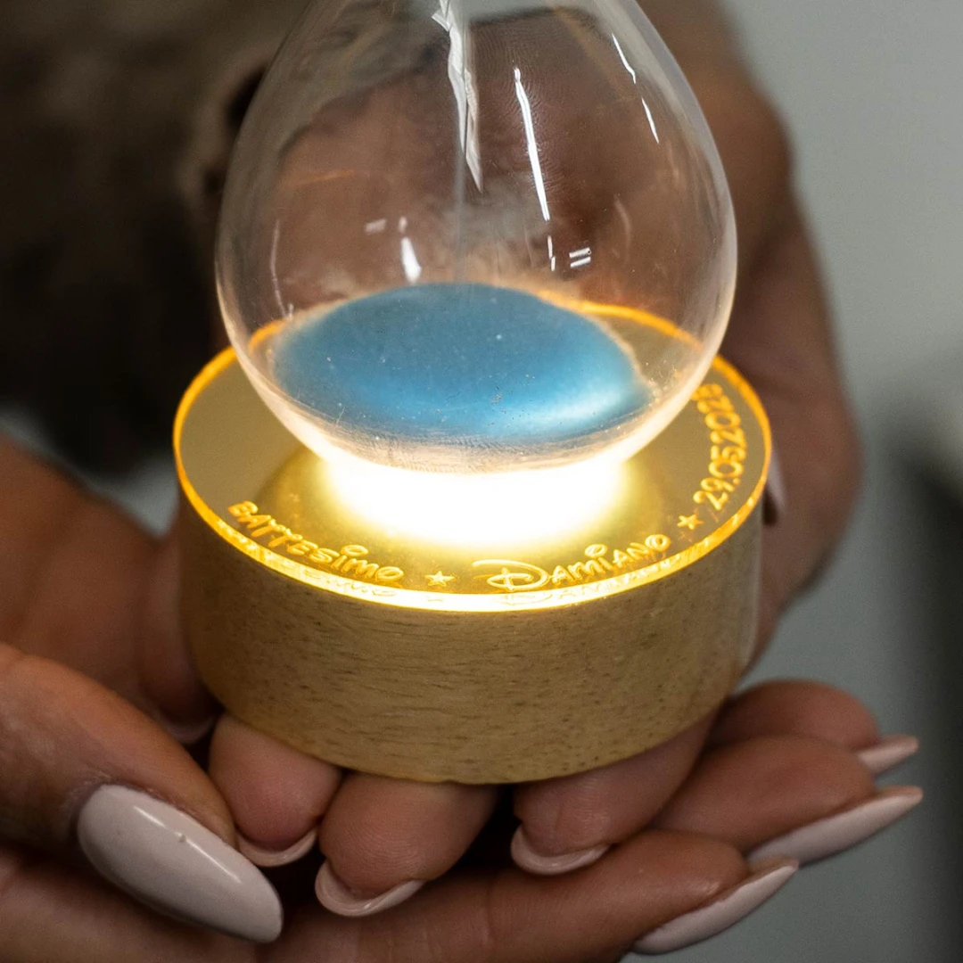 Bellissime Bomboniere Santo Battesimo Maschio 2026, Clessidra in vetro soffiato, su base in legno a LED e con possibilità di personalizzarla su base in plexiglass a specchio. Prodotto Artigianale. Misura: h 13 cm. Sabbia disponibile in diversi colori.